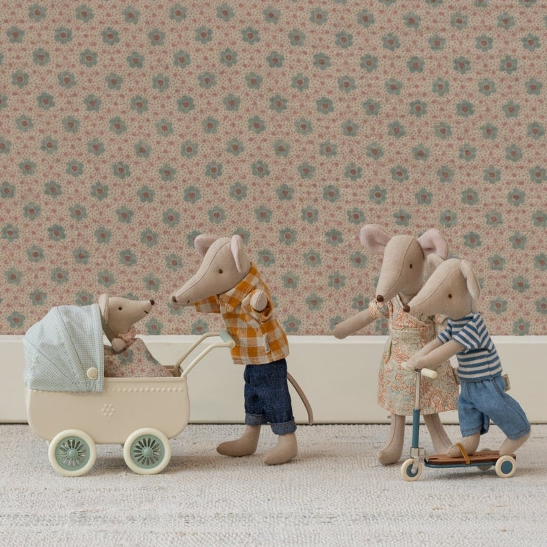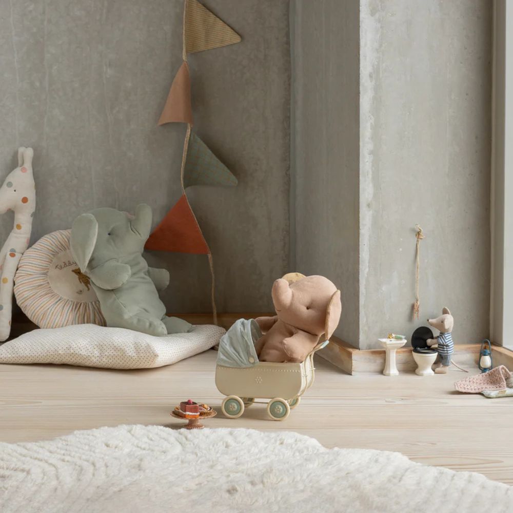 Maileg – beautiful pram with light blue details. Metal has embossed details on the sides. Perfect for a walk when the baby sleeps!