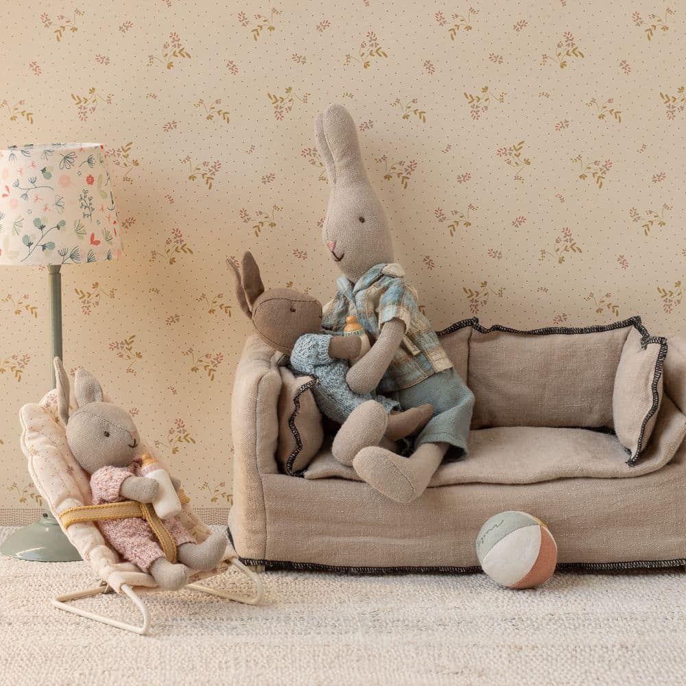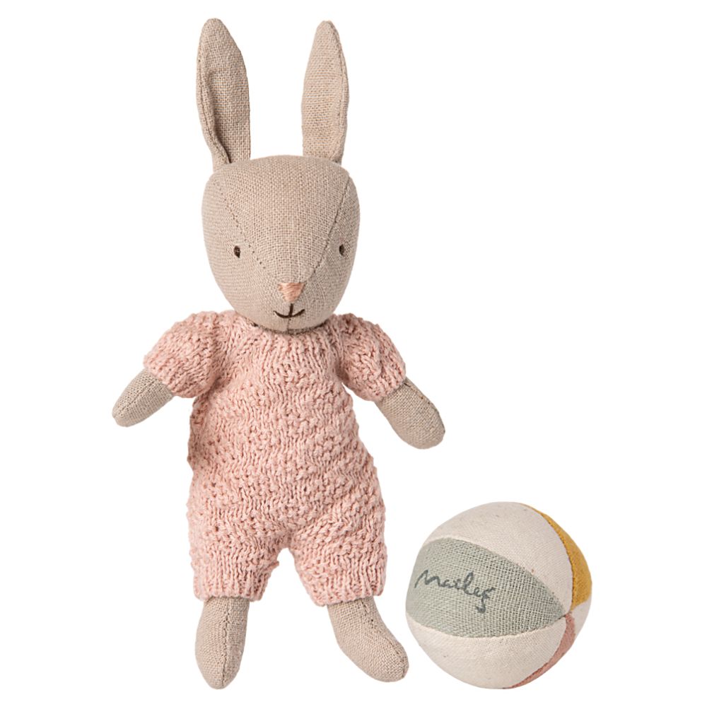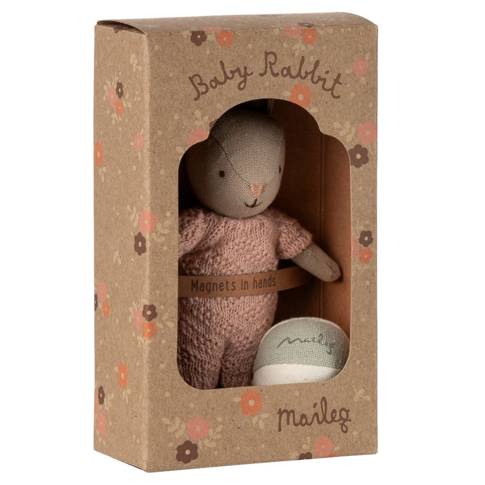 Maileg – This adorable set includes a micro-sized Maileg rabbit dressed in a soft rose-colored knit outfit. The rabbit comes with a ball and a pacifier bottle, which it can hold with its magnetic paws. A lovely addition to any dollhouse play!