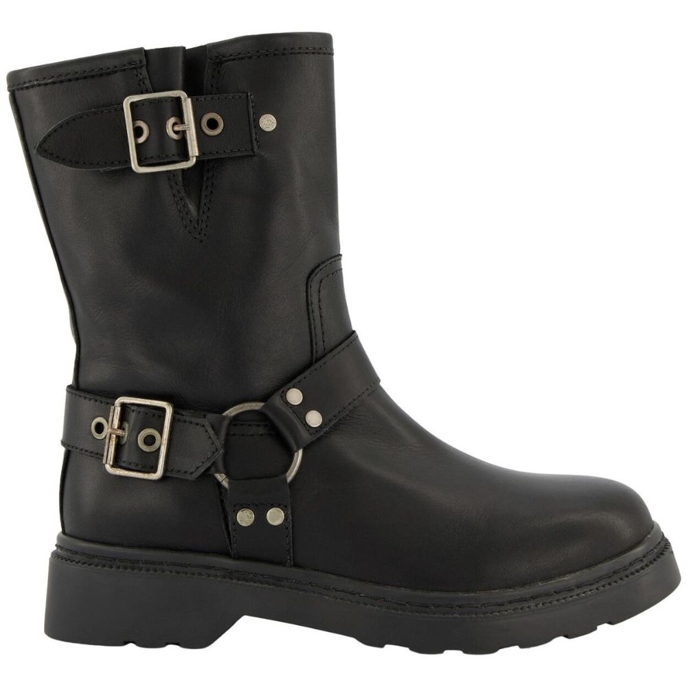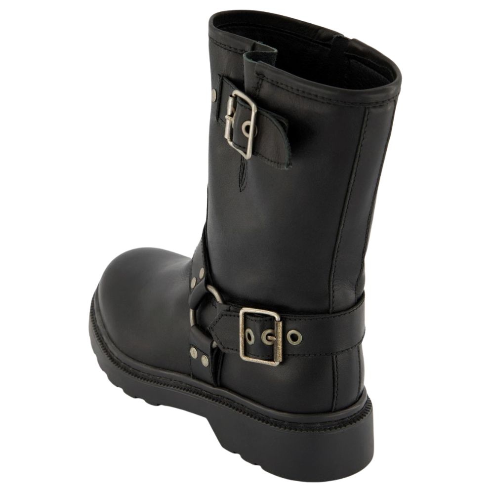 Musse & Cloud – musta nahkabootsit, joissa hopeanväriset solki-yksityiskohdat. Biker-tyyliset nahkasaapikkaat sopivat moneen tyyliin ja tilaisuuteen!