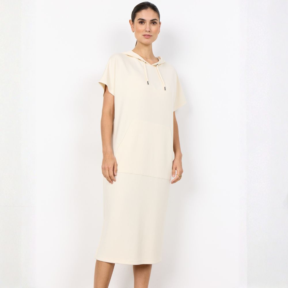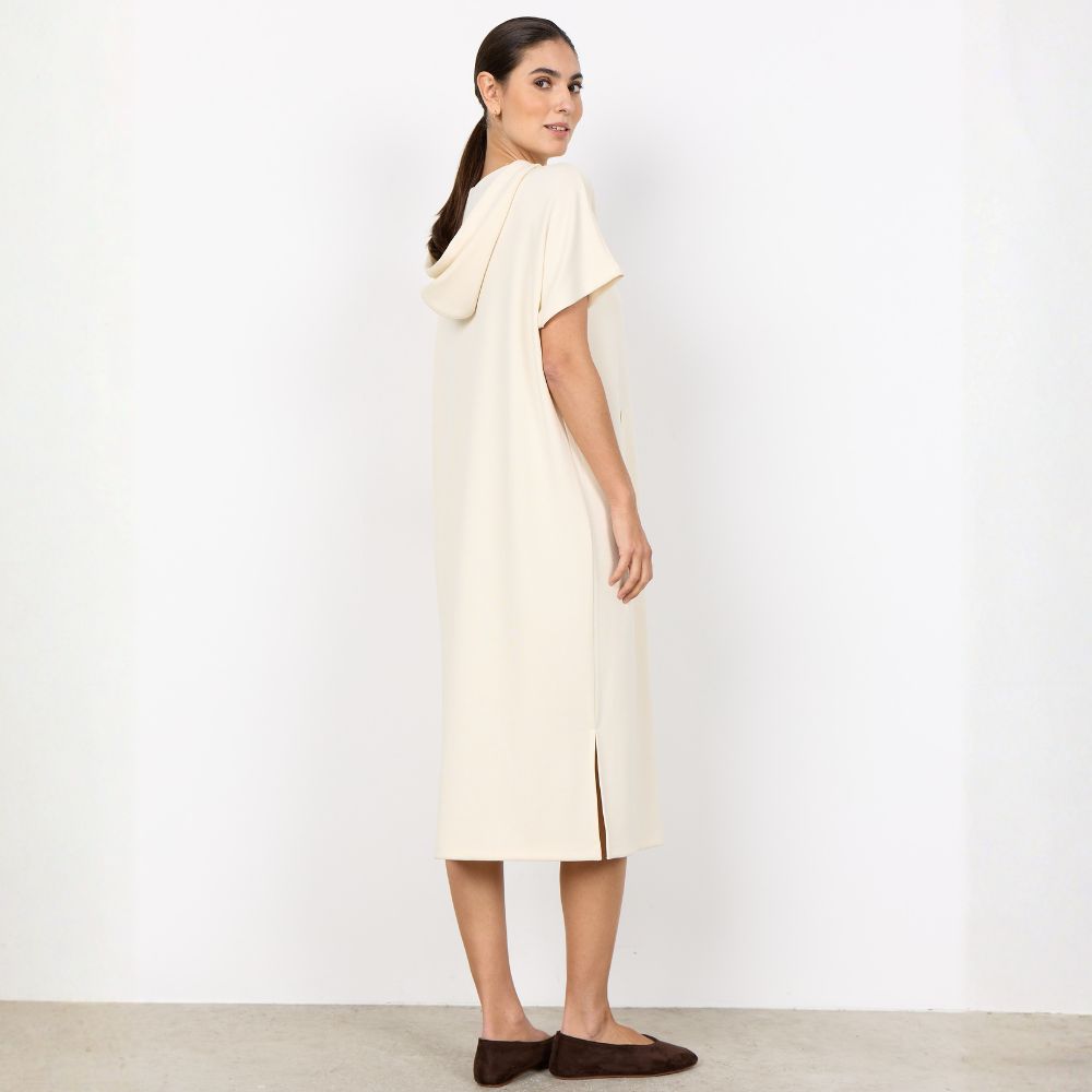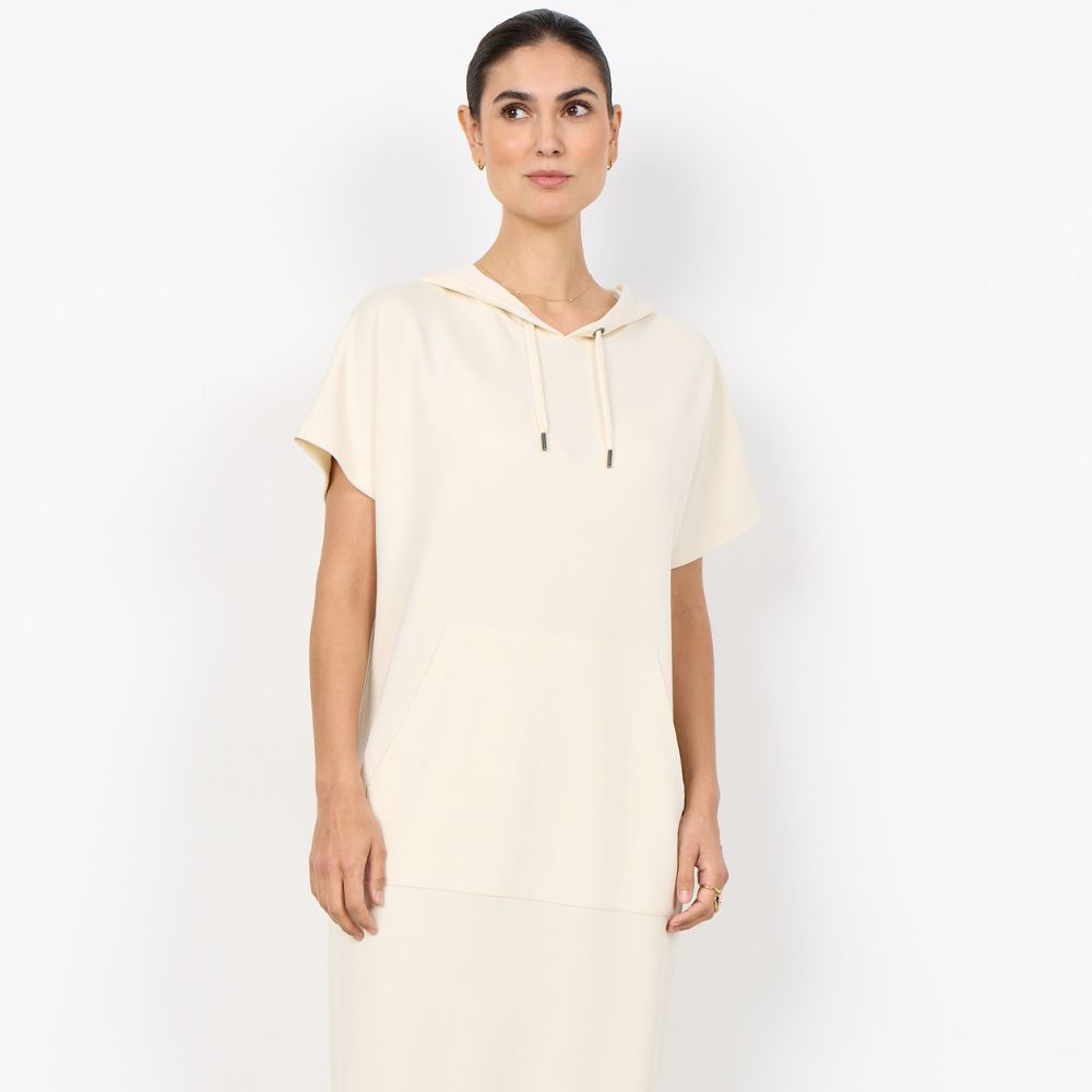 SC – rento ja pehmeä luonnonvalkoinen collegemekko lyhyillä hihoilla ja hupulla. Kevyt huppumekko sopii hyvin vapaa-aikaan ja tuo mukavuutta pukeutumiseen. Hieman joustava kangas tuntuu miellyttävältä päällä ja laskeutuu kauniisti.