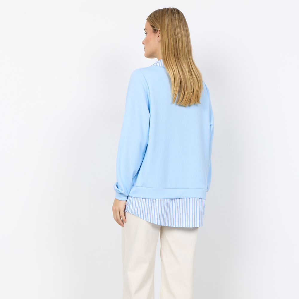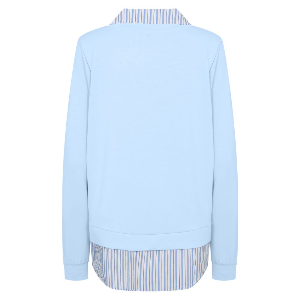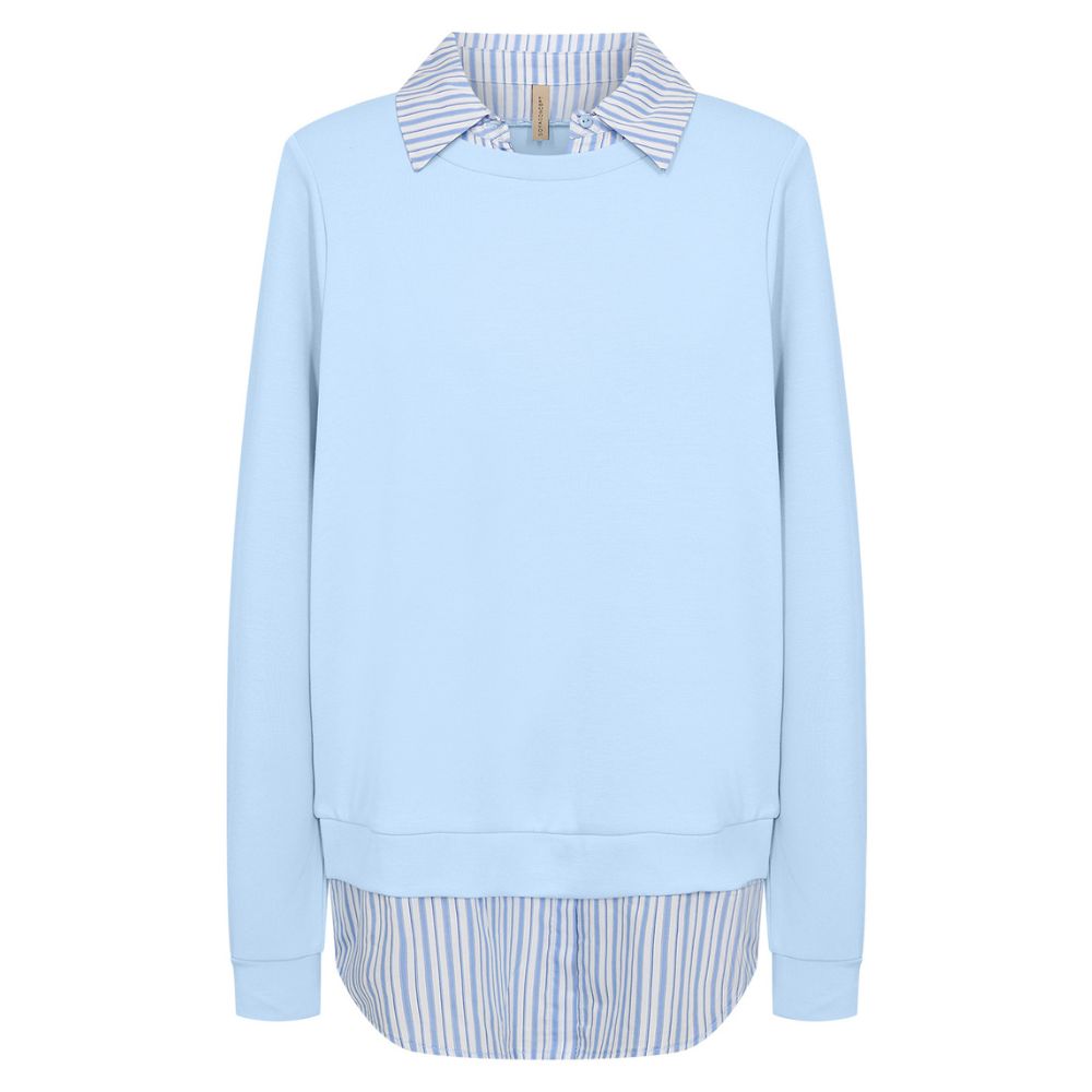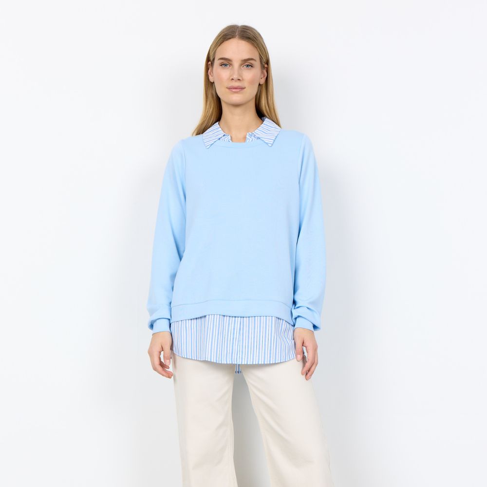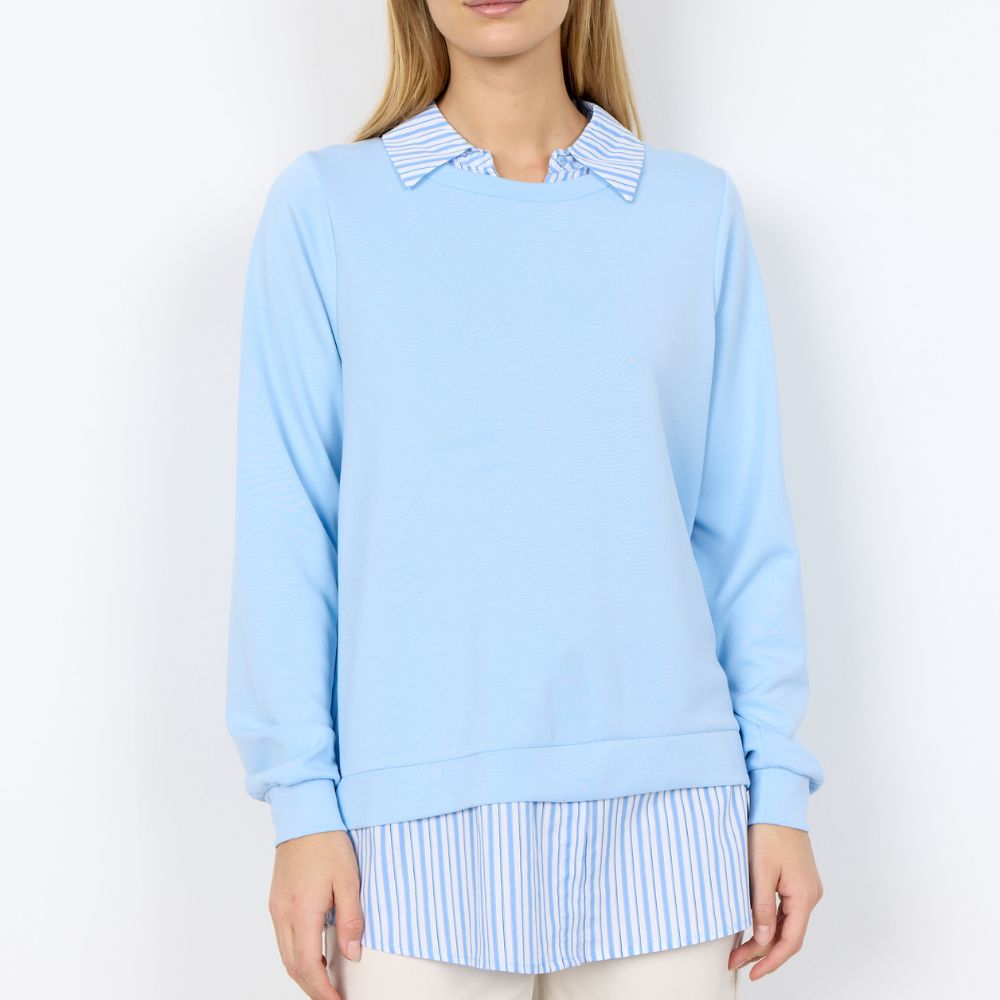 Soyaconcept – vaaleansininen collegepaita yhdistää rennon mukavuuden ja kerrostetun ilmeen. Kauluksen ja helman raidalliset yksityiskohdat luovat vaikutelman paidasta neuleen alla. Helppo valinta arkeen, kun haluat siistin mutta rennon asun.