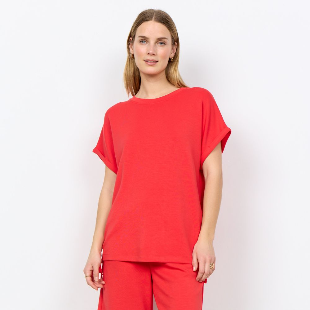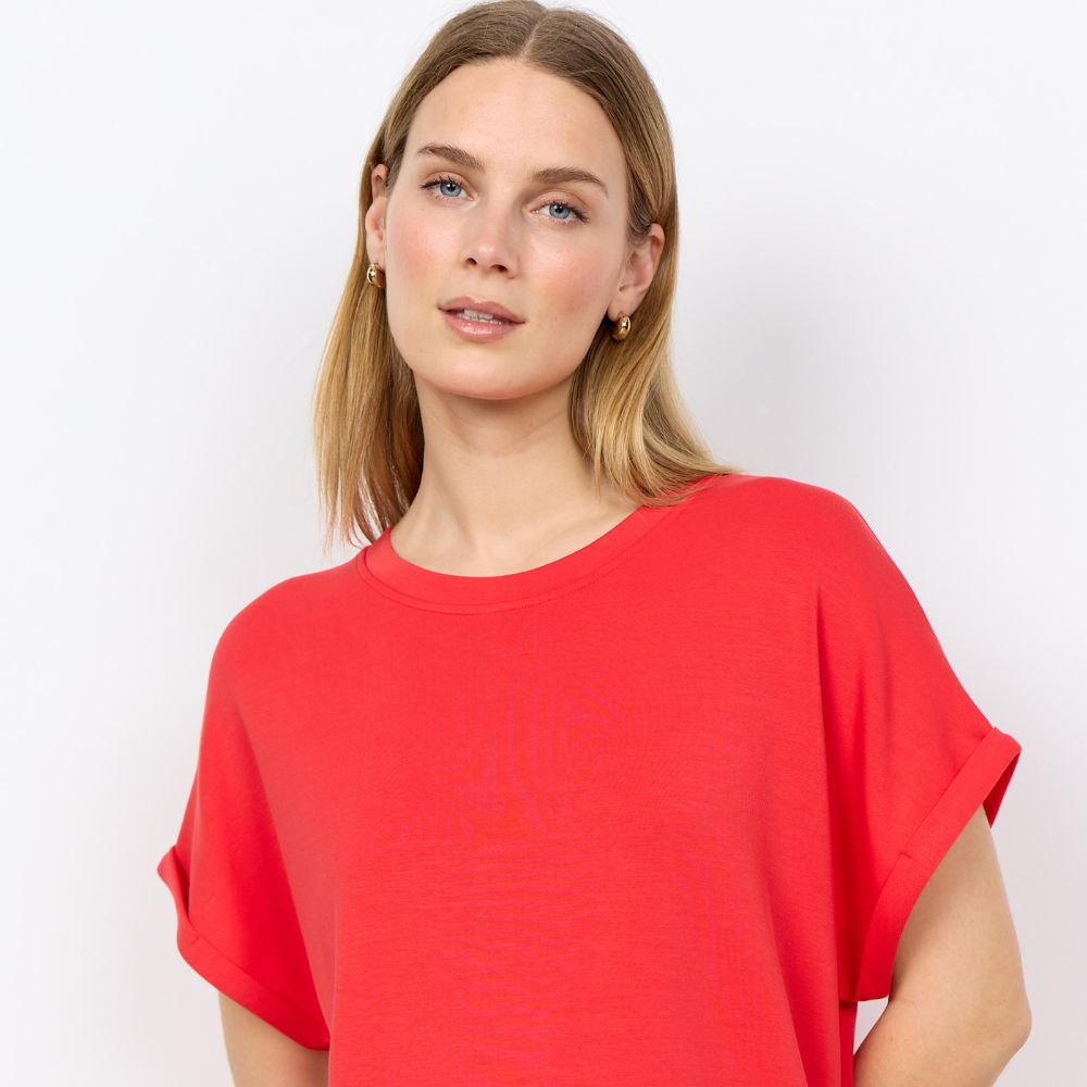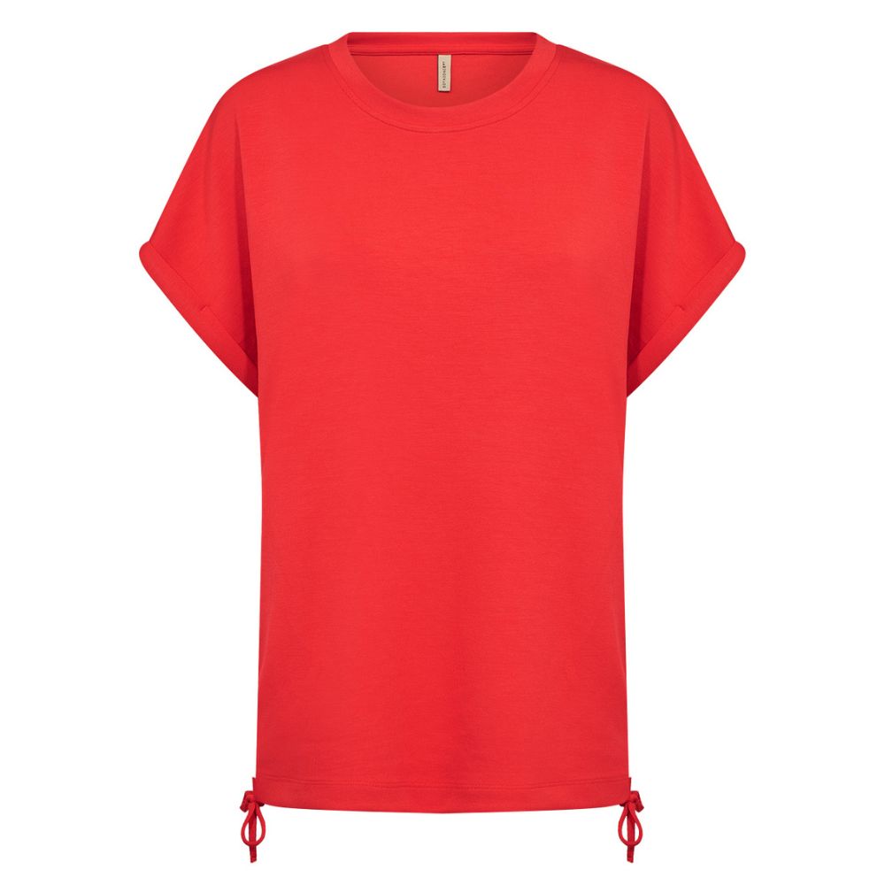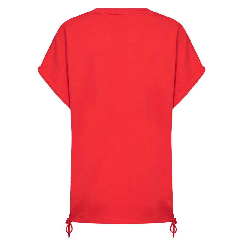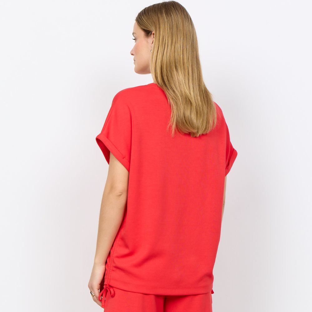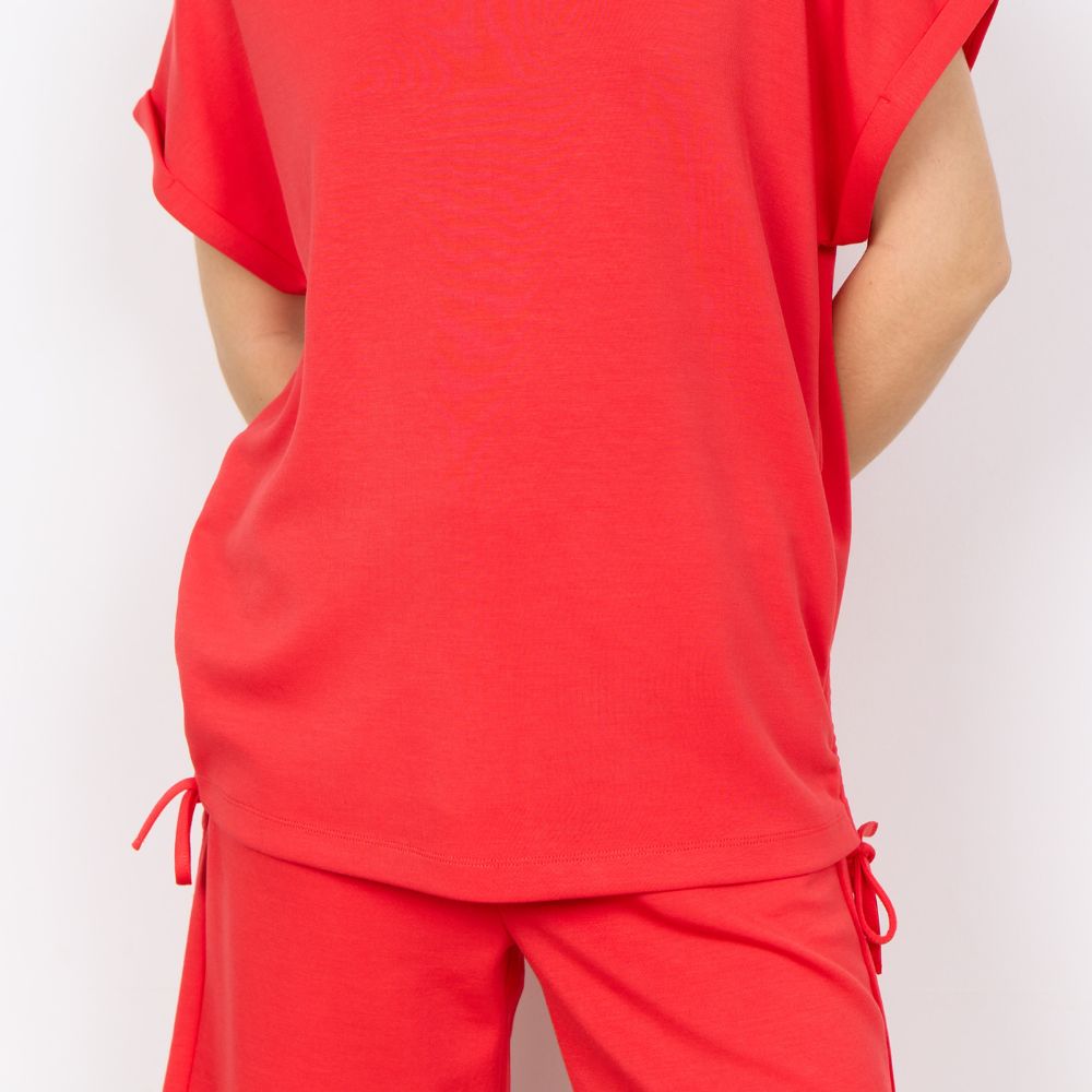 SC – punainen modaali-t-paita, jossa kätevät kiristysnauhat sivuilla. Paidassa on pyöreä pääntie ja lyhyet hihat. Ilmavasti laskeutuva paita on ihanan rento valinta arkipukeutumiseen.