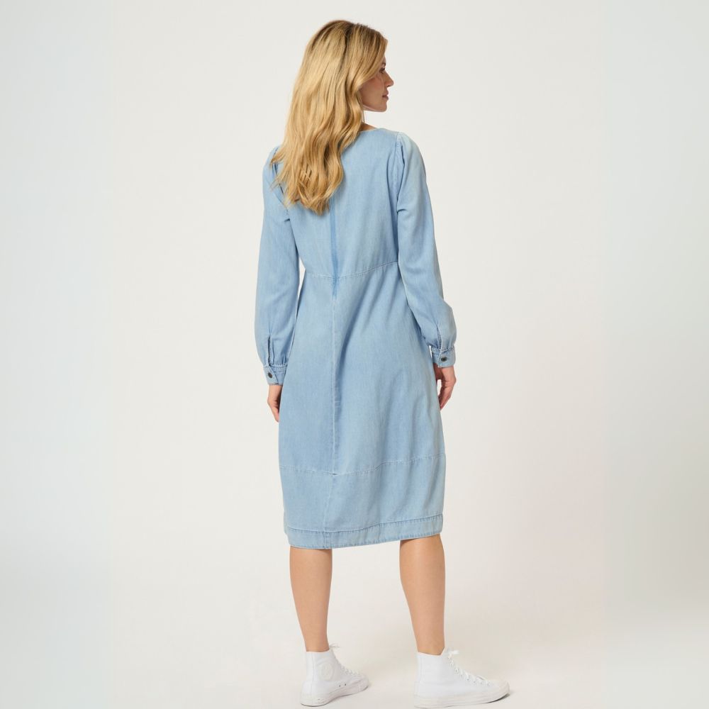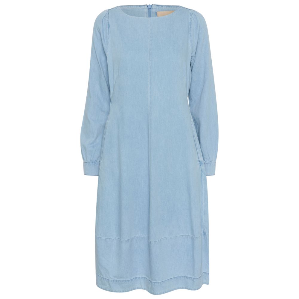Culture – vaaleansininen farkkumekko, jossa pitkät hihat. Mekossa on kauniin tulppaanimallisesti laskeutuva helma ja naiselliset rypytykset olkapäillä. Vaaleassa farkkumekossa on venepääntie ja takana vetoketjusuljenta.