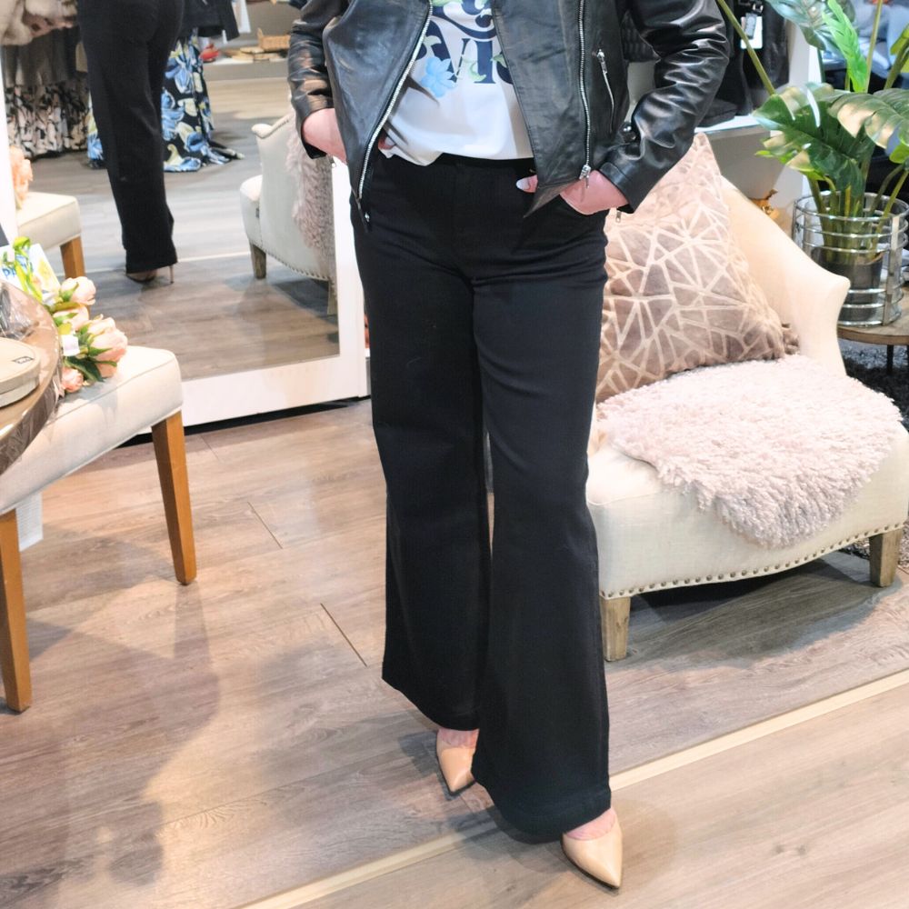 Mustat leveälahkeiset farkut soveltuvat niin arkimenoihin kuin juhlavempiinkin tilanteisiin. Farkuissa on korkea vyötärö ja rennosti laskeutuvien lahkeiden kanssa ne luovat kauniin siluetin.