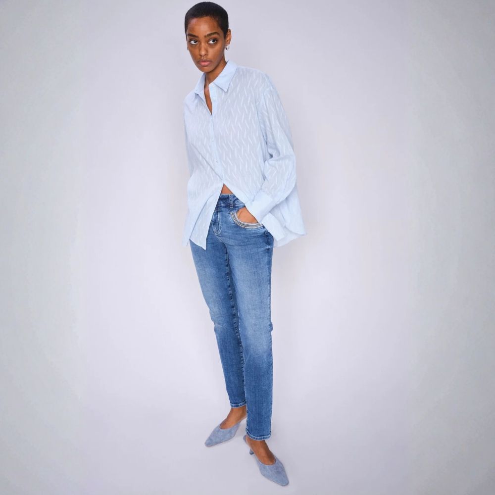 Mos Mosh – keskisiniset fakut, joissa kapeat käännetyt lahkeet ja koristeelliset etutaskut. Tyylikkäät farkut istuvat erinomaisesti ja voit muuttaa ilmettä kääntämällä lahkeet suoriksi. Keskikorkea vyötärö ja kapeneva lahje takaavat erinomaisen istuvuuden.