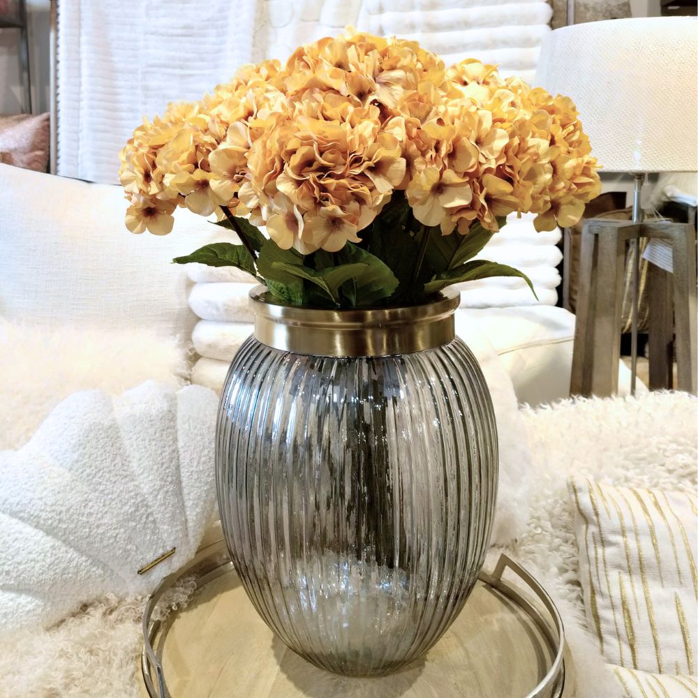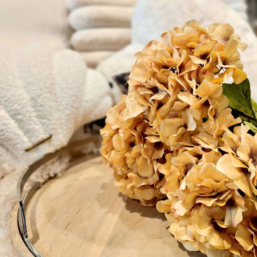 Ib Laursen – keltainen hortensia tuo sisustukseen lämpöä ja pehmeää väriä. Aidonnäköinen tekokukka toimii kauniina yksityiskohtana ympäri vuoden. Se on helppo tapa lisätä kukkatunnelmaa ilman hoitoa.