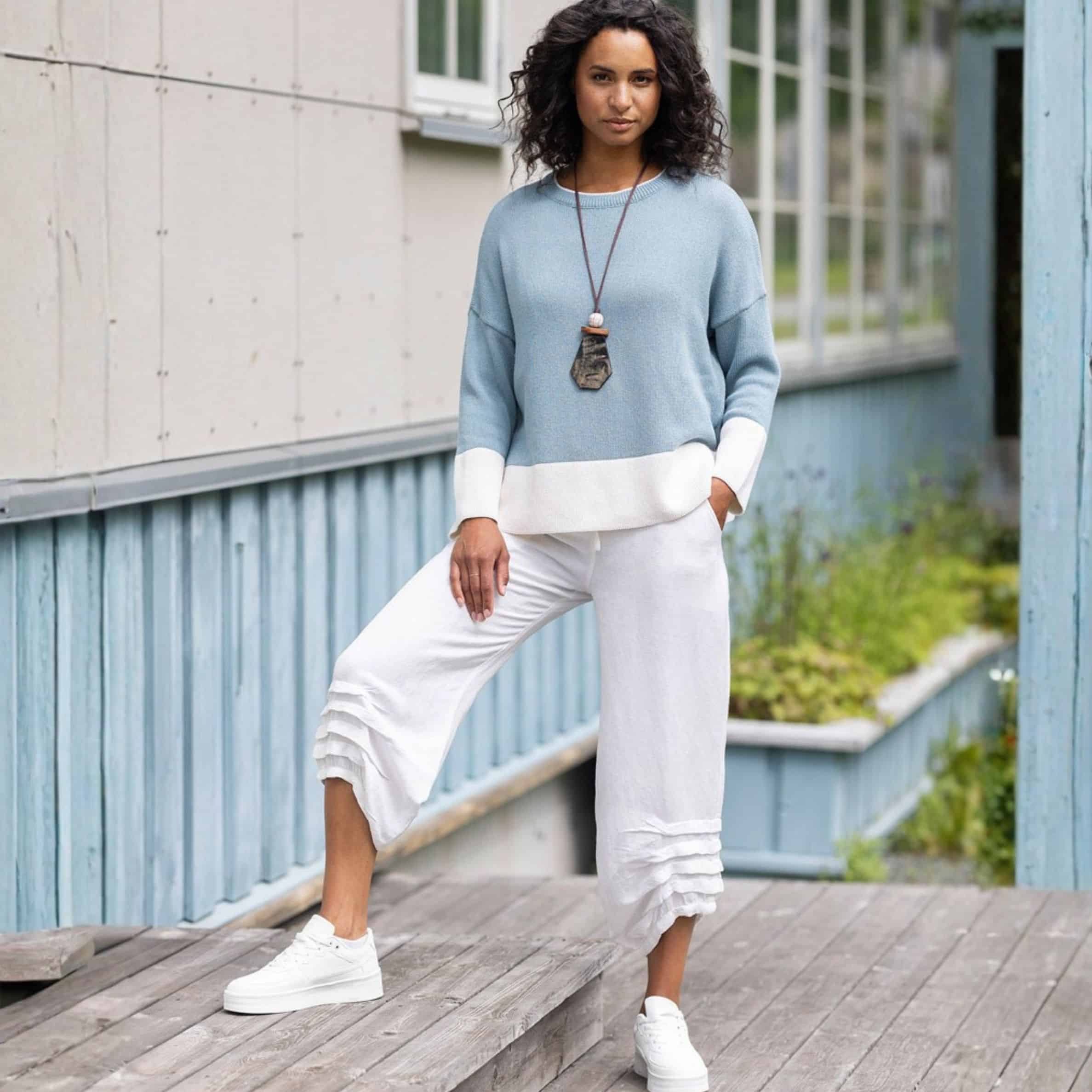 Housujen väljä leikkaus ja leveät lahkeet tekevät liikkumisesta helppoa ja vaivatonta. Joustava vyötärö kiristysnauhalla antaa mahdollisuuden säätää istuvuutta oman tarpeen mukaan. Ne sopivat hyvin niin kotiin, töihin kuin vapaa-aikaan. Yksinkertainen malli tekee housuista helposti yhdisteltävät erilaisten yläosien kanssa. Lahkeensuun kevyt vekitys tuo ilmeeseen pienen yksityiskohdan ilman liiallista näyttävyyttä. Kevyt kangas tekee housuista miellyttävät lämpimällä säällä.
