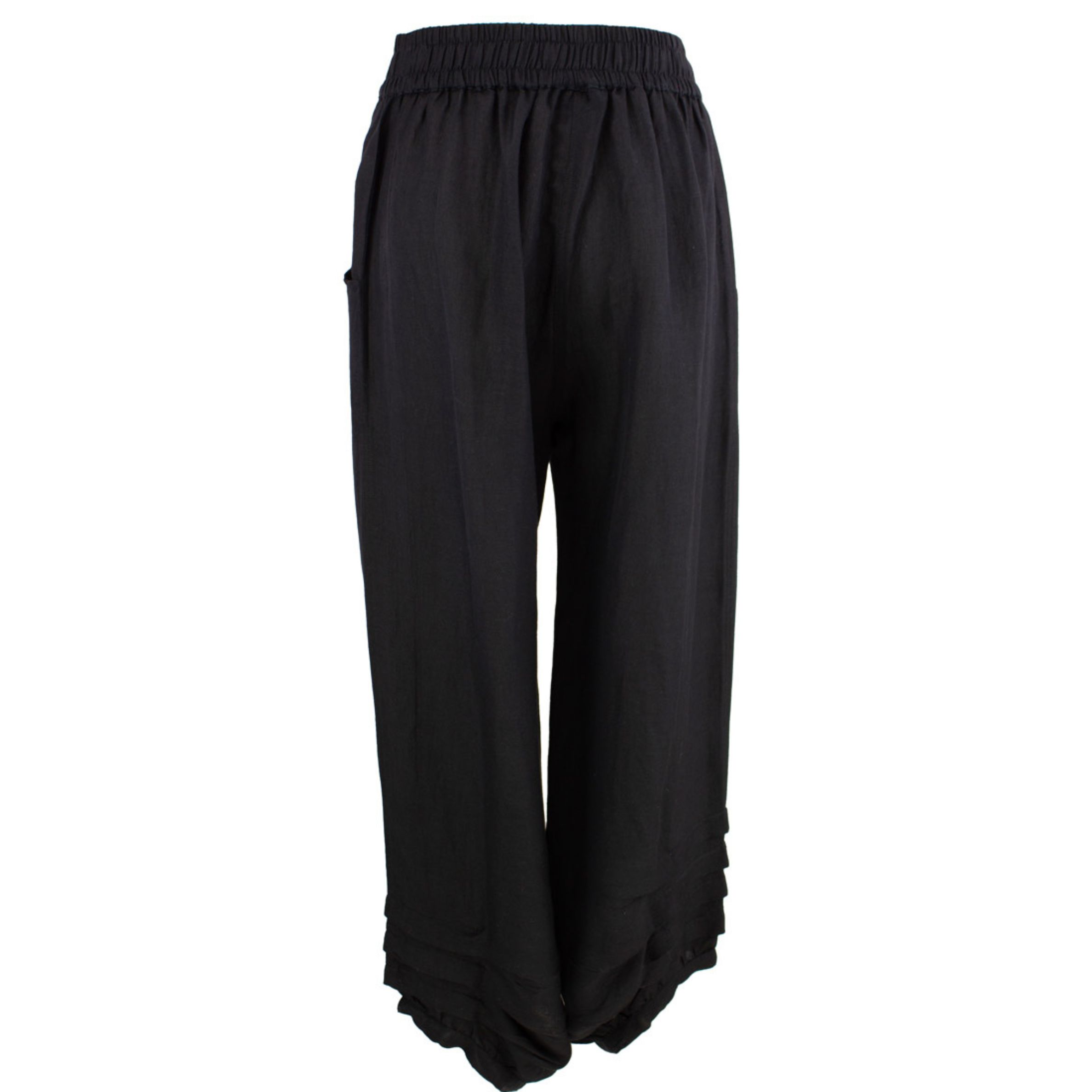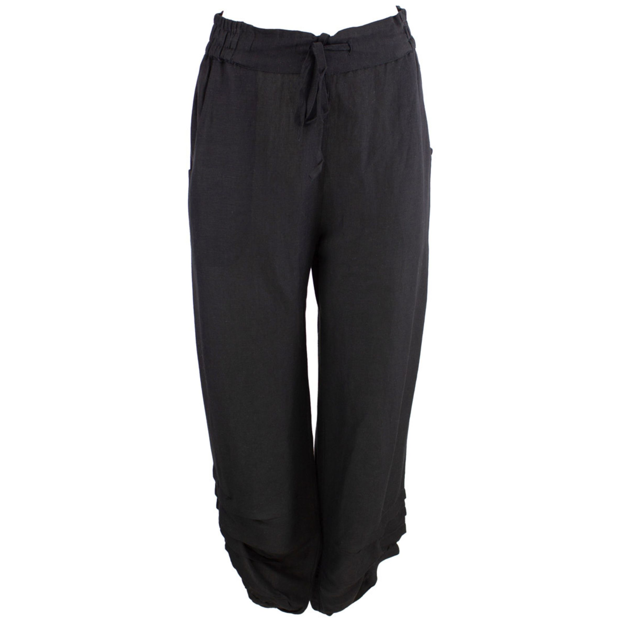 Mustat pellavahousut ovat helppo valinta arkeen ja vapaa-aikaan. Niiden kevyt materiaali ja väljä istuvuus tekevät niistä miellyttävät käyttää koko päivän. Selkeä ilme tekee housuista monikäyttöiset eri tilanteisiin.