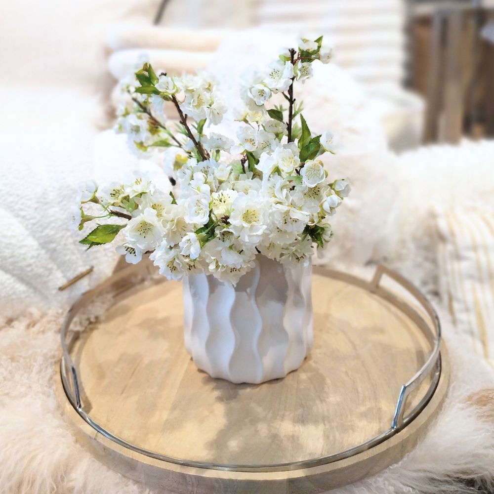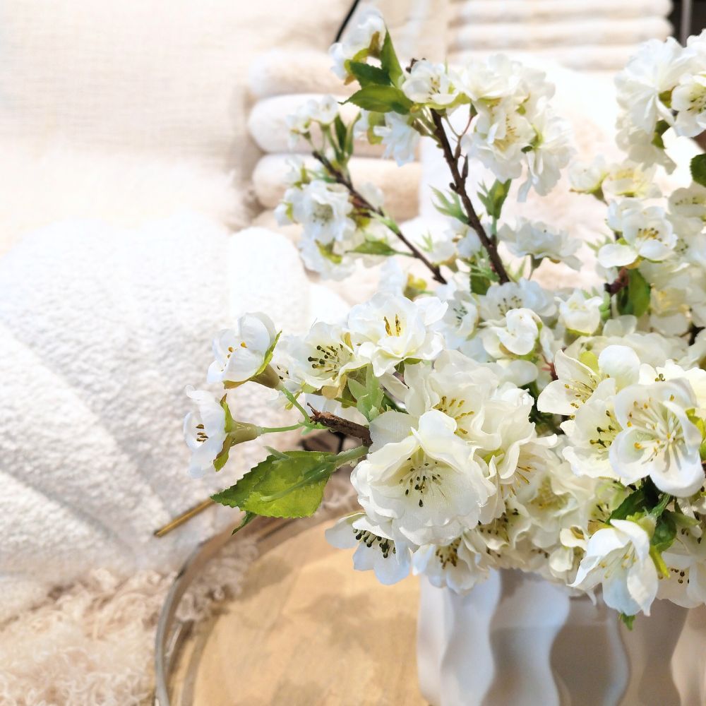 Upea valkokukkainen kirsikkapuunoksa, jossa kauniit kirsikankukat. Kirsikankukka on kaunis ja helppohoitoinen kasvi sisustukseen.