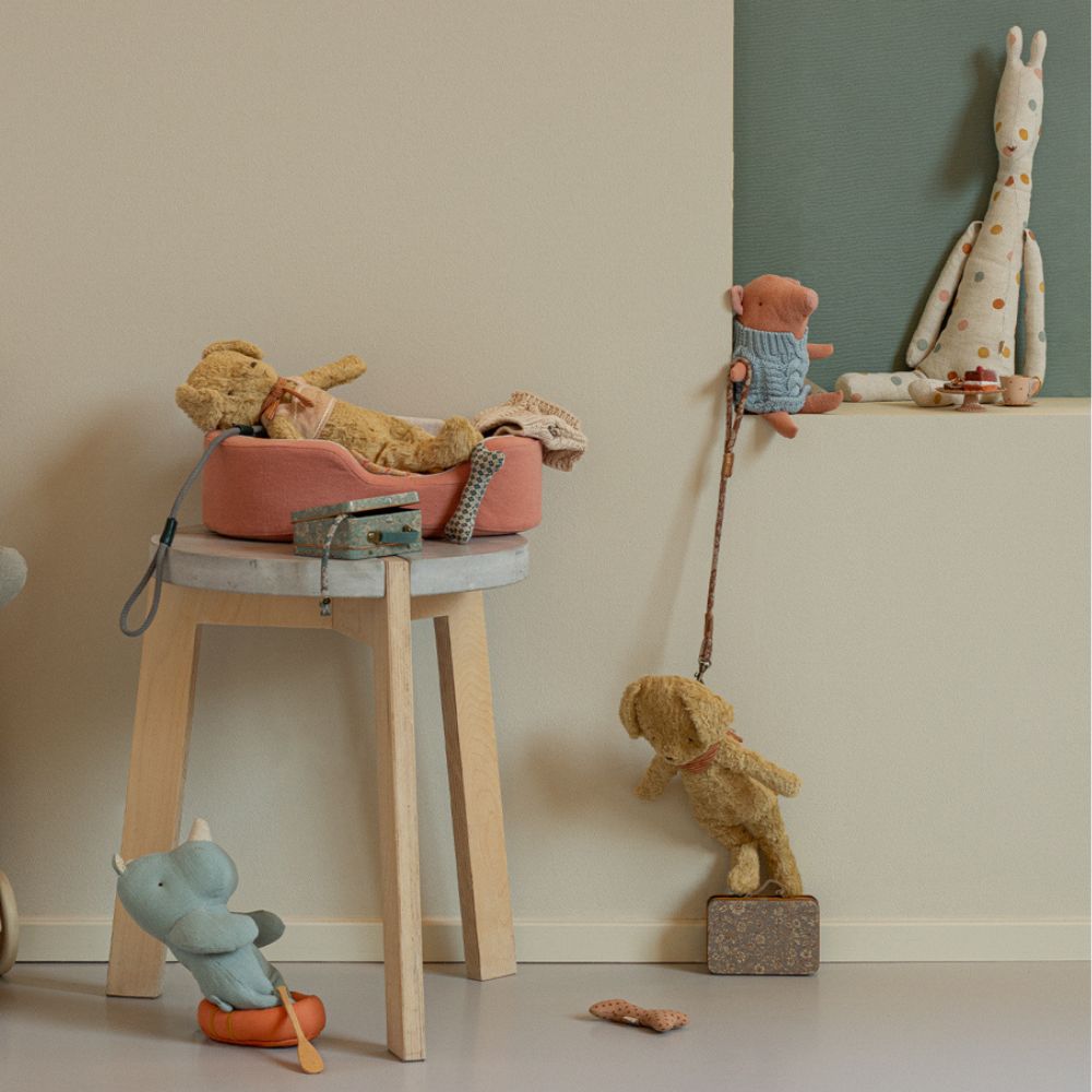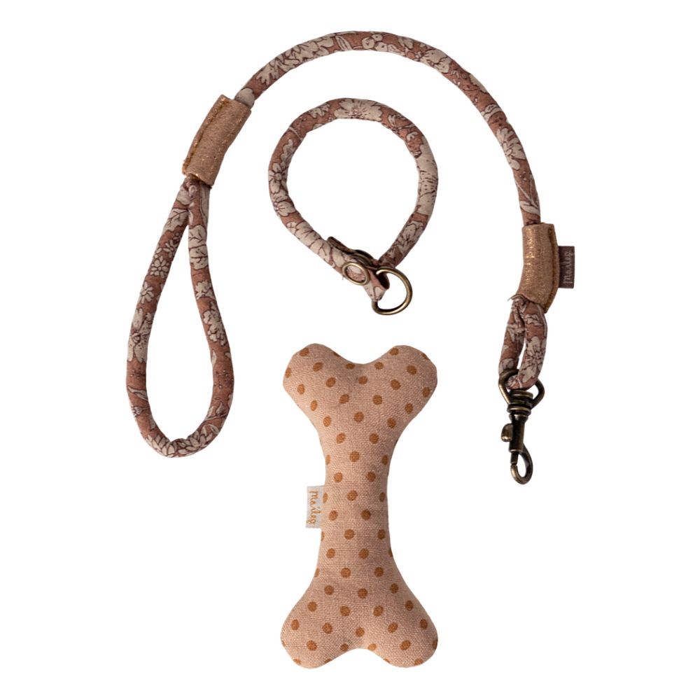 Tarvikkeet tuovat pehmokoiran arkeen uusia tarinoita ja tilanteita. Niiden avulla lapset voivat harjoitella koiran hoitoa, lenkittämistä ja palkitsemista leikin kautta. Mukana tuleva laukku tekee lelujen säilytyksestä helppoa ja hauskaa. Tuote sopii täydellisesti muiden Maileg-hahmojen ja -tarvikkeiden rinnalle. Yksityiskohtainen viimeistely ja laadukkaat materiaalit tekevät setistä pitkäikäisen ja miellyttävän käyttää, kerta toisensa jälkeen.
