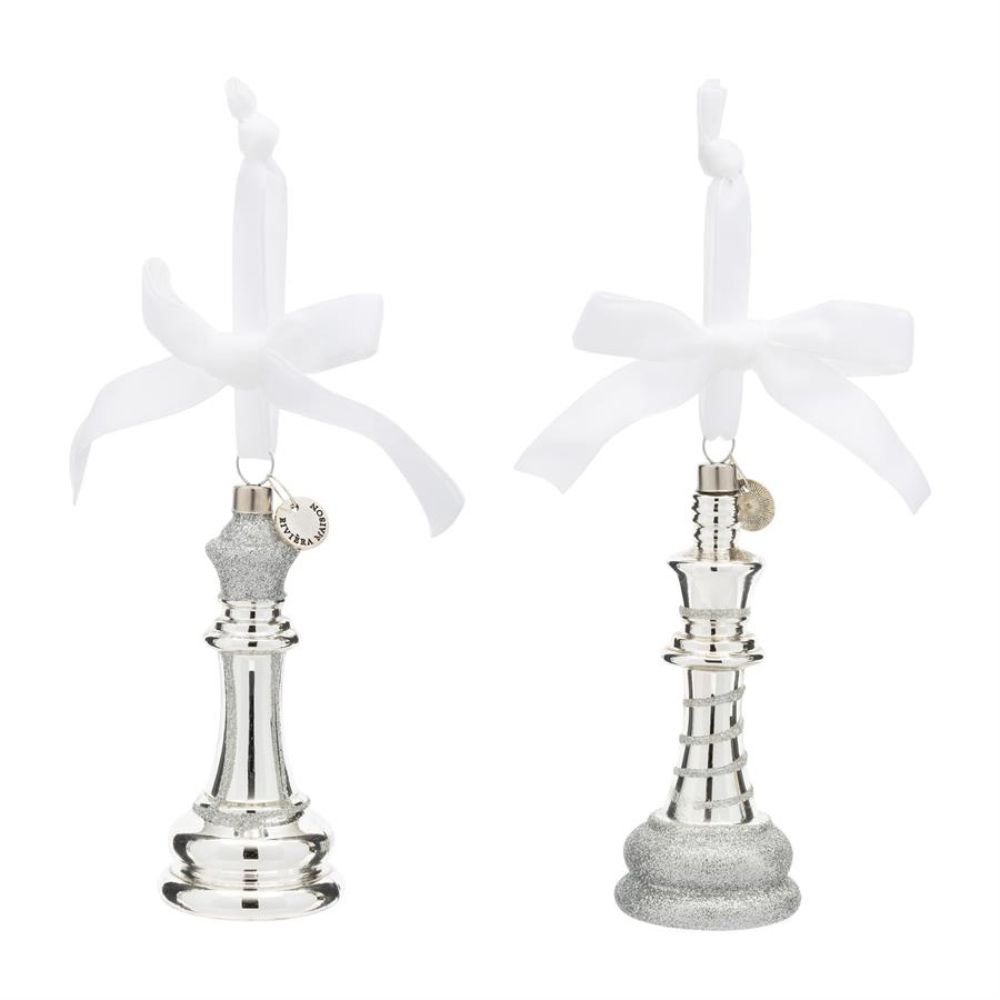 Ornament Chess Game 2pcs Rivièra Maison – hopeiset shakkinappulan muotoiset kuusenkoristeet tuovat joulukuuseen persoonallista ja leikkisää ilmettä. Glitteryksityiskohdat heijastavat valoa kauniisti ja tekevät koristeista näyttäviä. Setti sopii hyvin moderniin ja hieman erilaiseen joulusisustukseen.