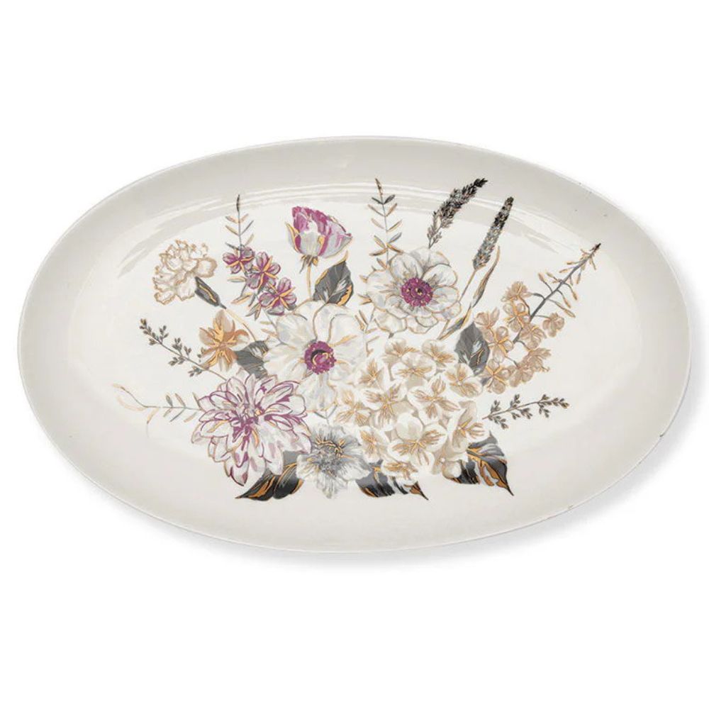 Greengate – ovaalinmuotoinen Estella-lautanen hurmaa kauniilla kukkakuosilla ja pehmeällä värimaailmallaan. Ovaalinmuotoinen lautanen sopii täydellisesti erilaisten herkkujen tarjoiluun ja tuo kattaukseen viehättävän yksityiskohdan. Kullatut yksityiskohdat viimeistelevät sen ylellisen ilmeen.