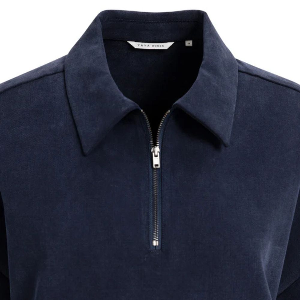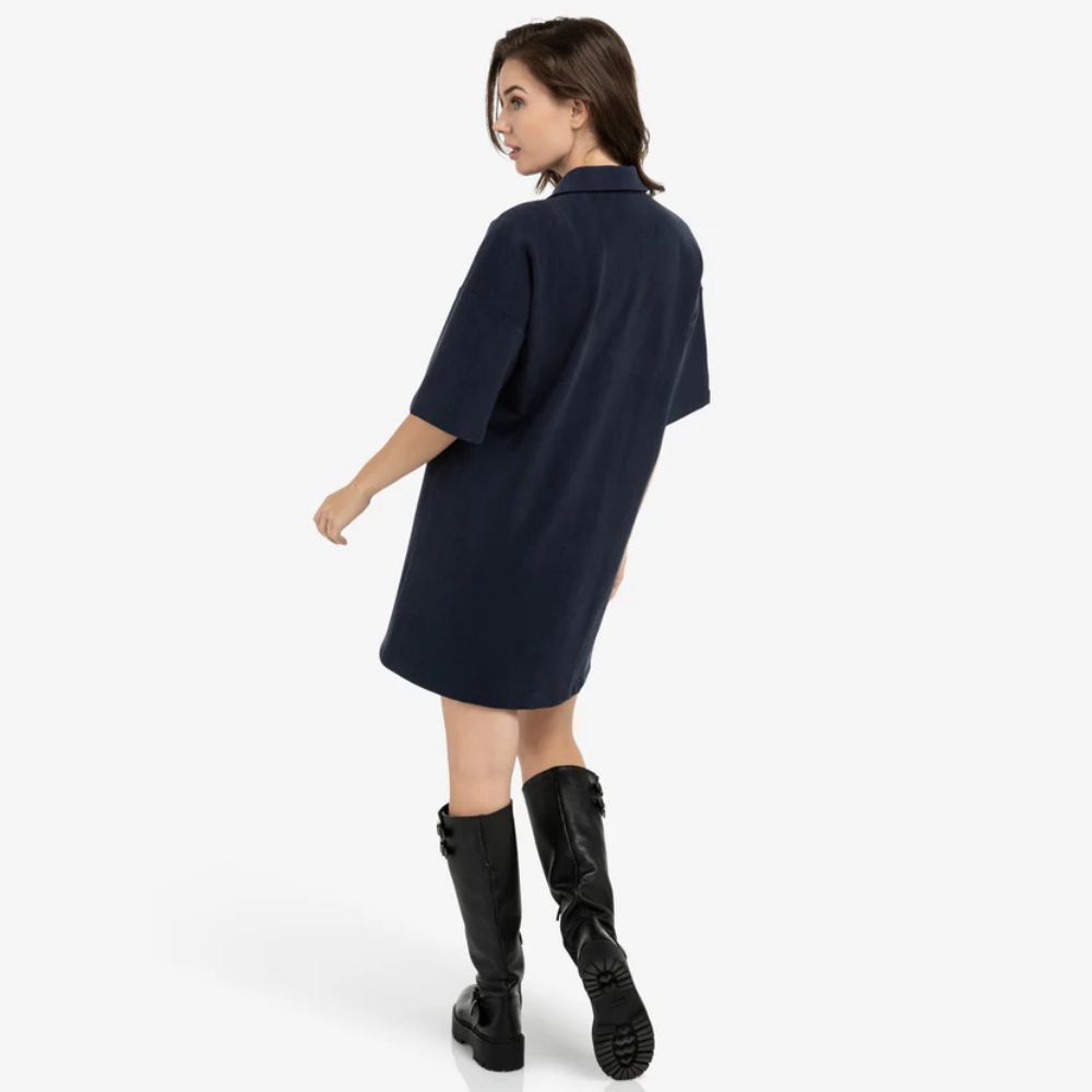 Yaya – tummansininen lyhythihainen mekko on mukava ja helposti yhdisteltävä valinta arkeen. Yaya-mekossa yhdistyvät rento istuvuus ja sporttinen polo-tyyli. Kevyt materiaali tekee siitä miellyttävän käyttää koko päivän.