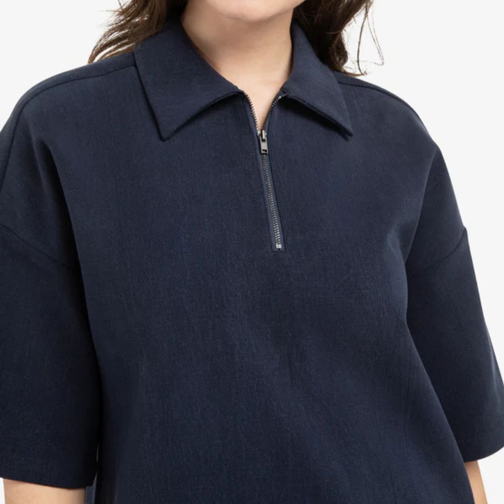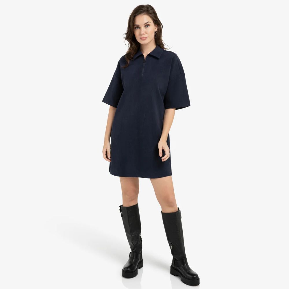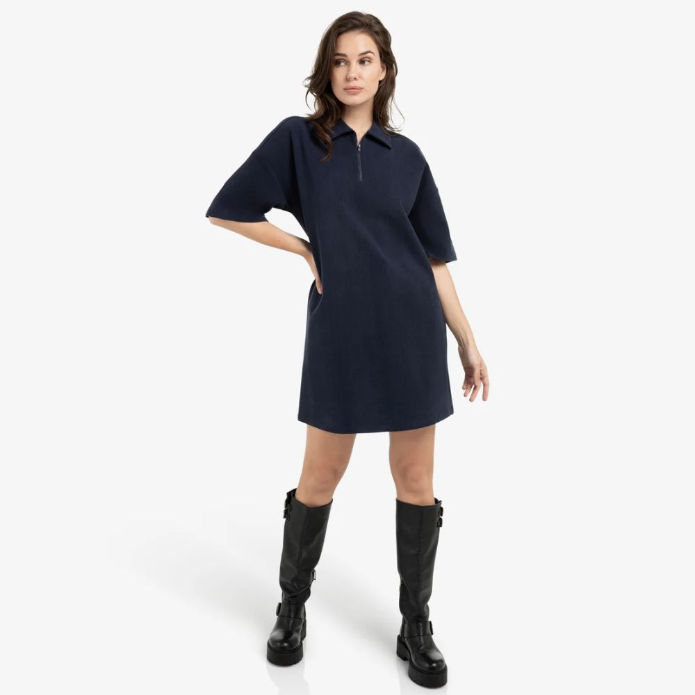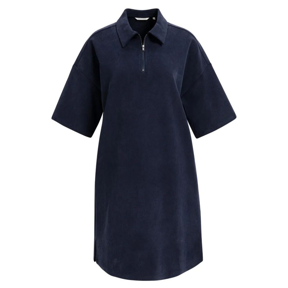Mekossa on väljä leikkaus, joka tekee siitä mukavan ja rennon käyttää. Polvipituinen helma antaa sille selkeän ja modernin ilmeen. Malli sopii hyvin arkipukeutumiseen. Polokaulus ja puolivetoketju tuovat mekkoon sporttisen ilmeen. Vetoketjun ansiosta pääntietä voi säätää oman tyylin mukaan. Yksityiskohdat tekevät mekosta helposti tunnistettavan. Mekko toimii hyvin tennareiden, sandaalien tai kevyiden kenkien kanssa. Tummansininen väri on ajaton ja helppo yhdistää moniin asusteisiin. Se sopii niin arkipäiviin kuin rennompaan vapaa-aikaan.
