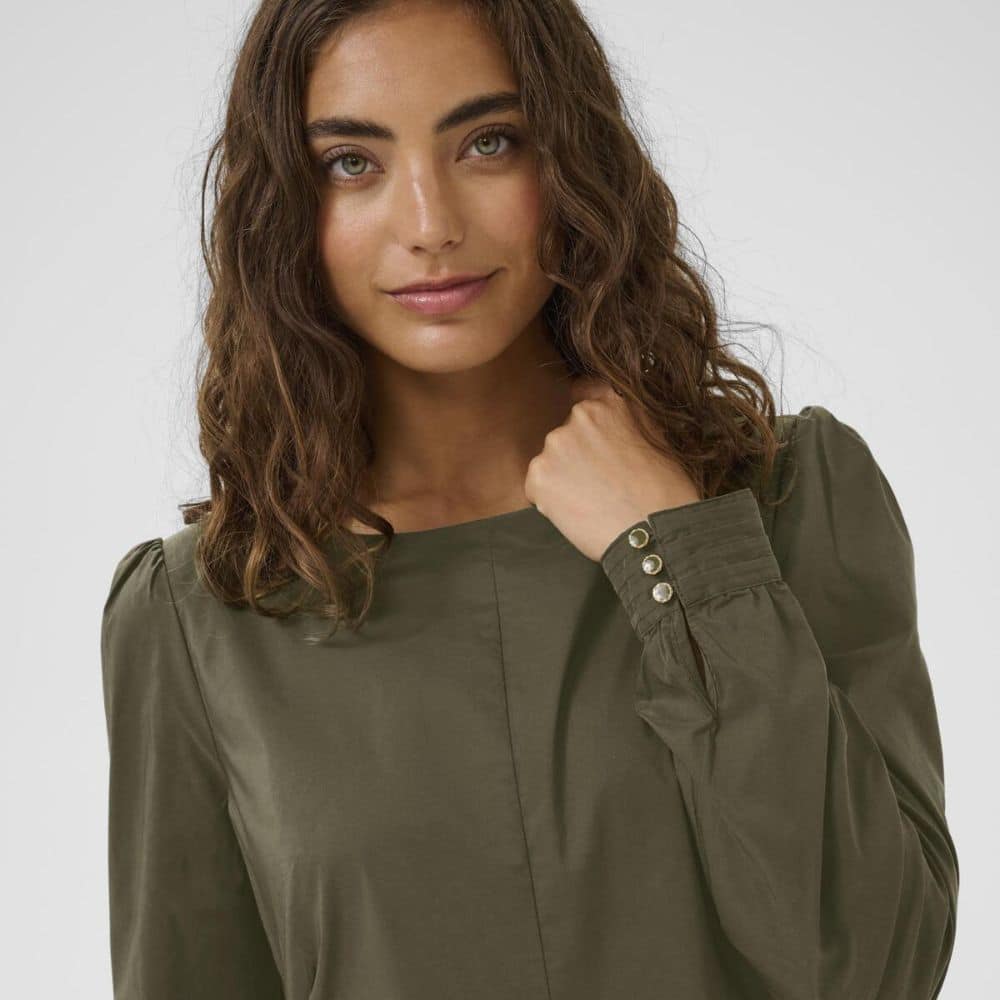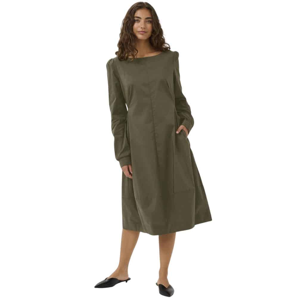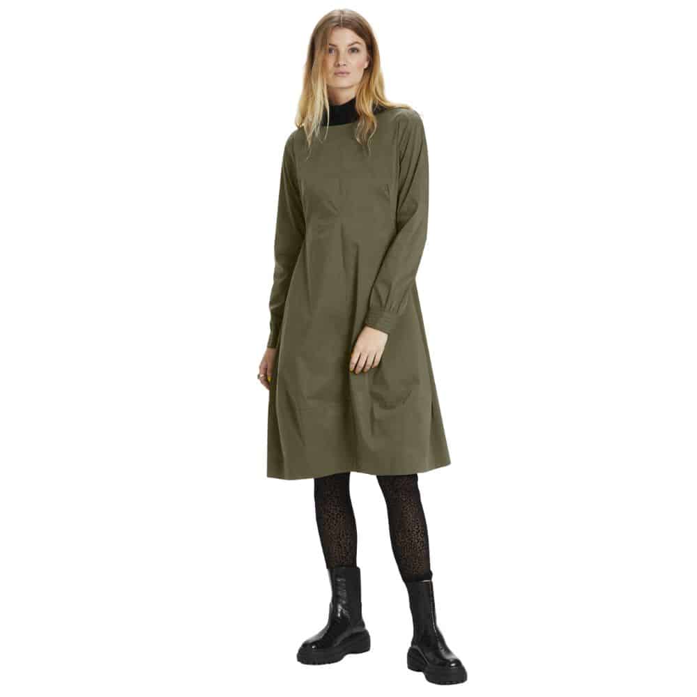 Culture – oliivinvihreä mekko, jossa ihanan kevyt materiaali ja rento mitoitus. Mekossa on pitkät hihat, olkapäillä pieni puhvirypytys ja hihansuissa kauniit napit. Upea midimittainen mekko on kaunis valinta juhliin tai arkeen.