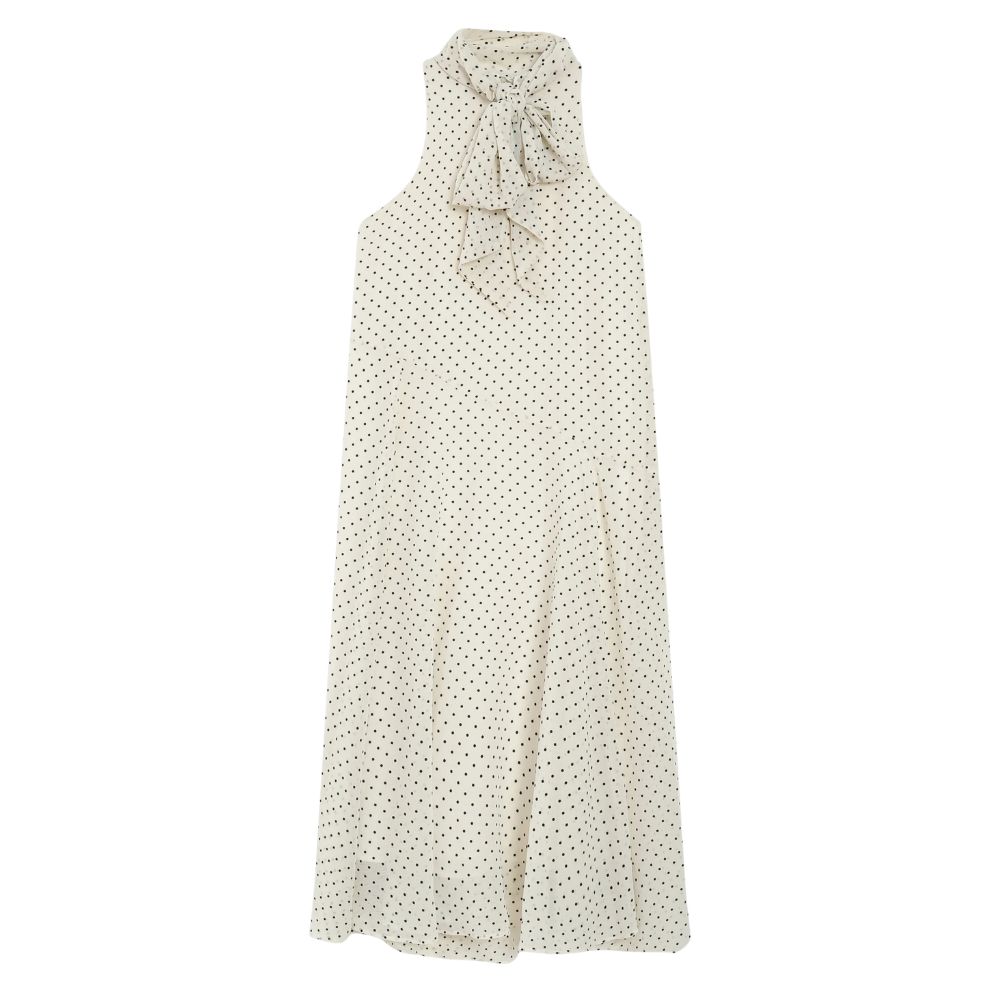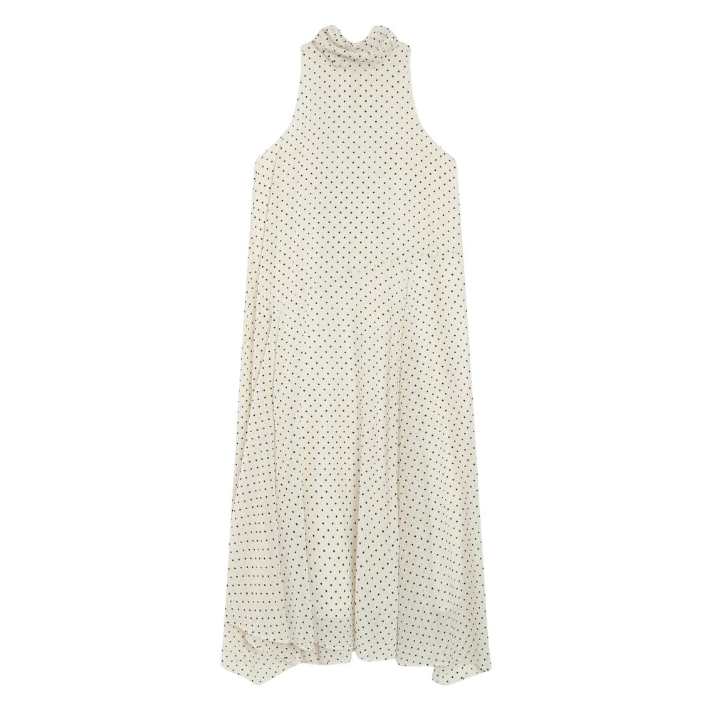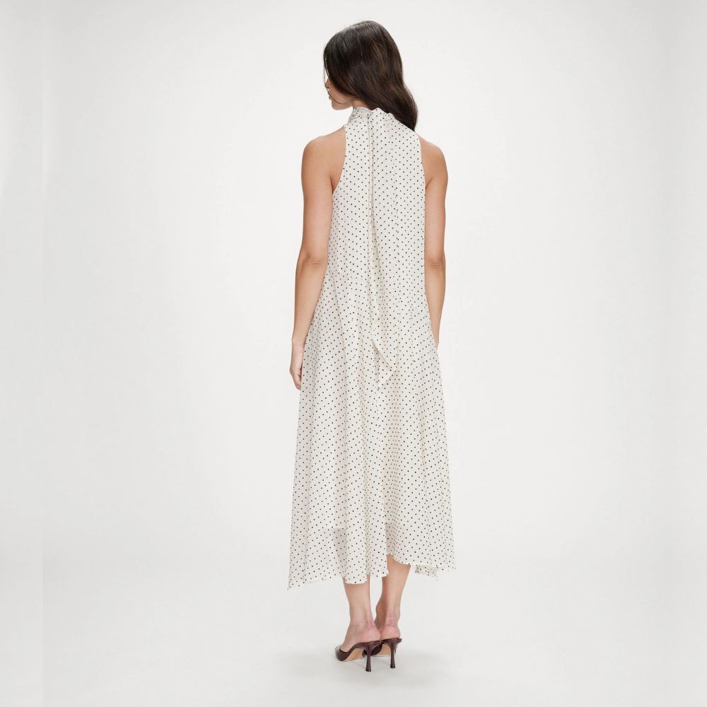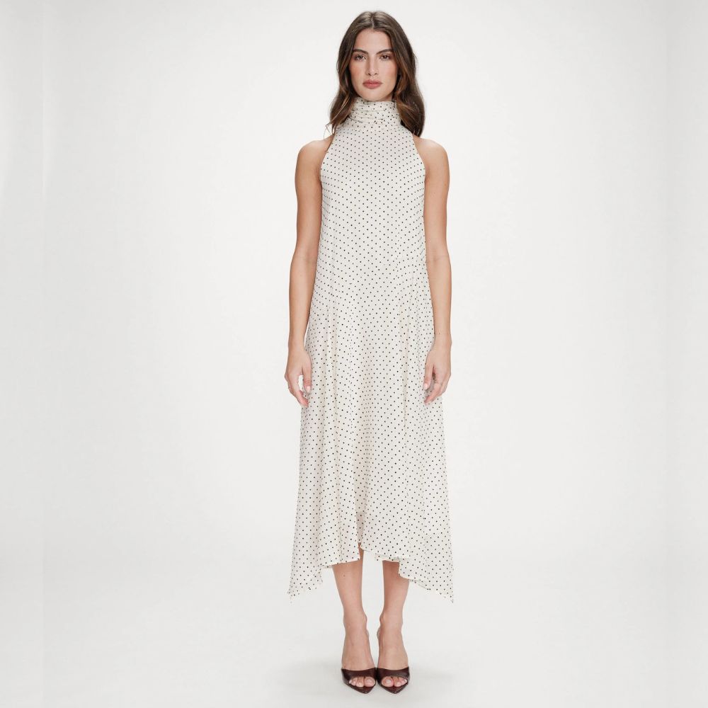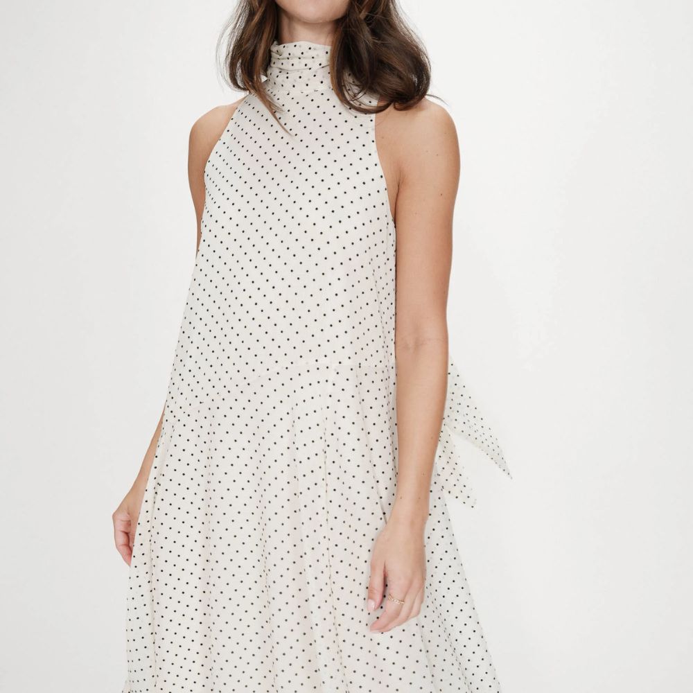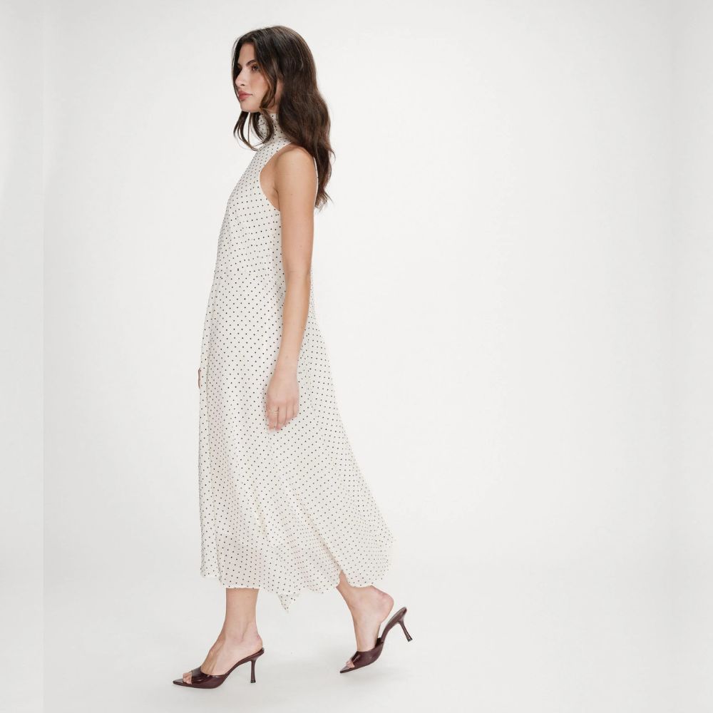 Valkoinen pilkullinen hihaton mekko on näyttävä ja kevyt valinta juhlaan tai kesäiseen tilaisuuteen. Ilmava leikkaus ja epäsymmetrinen helma luovat kauniisti liikkuvan siluetin. Korkea solmittava pääntie ja selän pisaranmallinen halkio viimeistelevät kokonaisuuden.