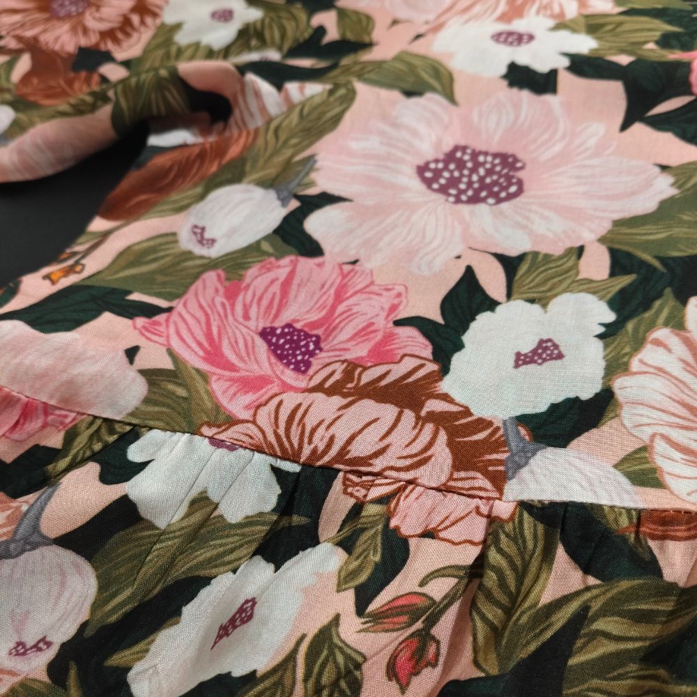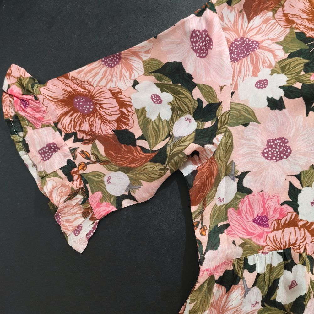 Roosan sävyinen kukallinen mekko, jossa kaunis röyhelö helmassa. Mekossa on pyöreä pääntie ja lyhyet hihat. Upea mekko niin juhliin kuin arkisempaan päivään!