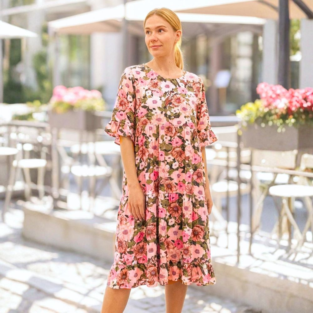 Ihanan kevyt lyocell-mekko laskeutuu kauniisti ja tuntuu ihanan vilpoiselta iholla. Mekon kaunis kukkakuosi hurmaa kauniilla vaaleanpunaisen eri sävyillä. Mekossa on imarteleva malli ja se soveltuu eri asustein niin juhlaan kuin arkisempaankin menoon.