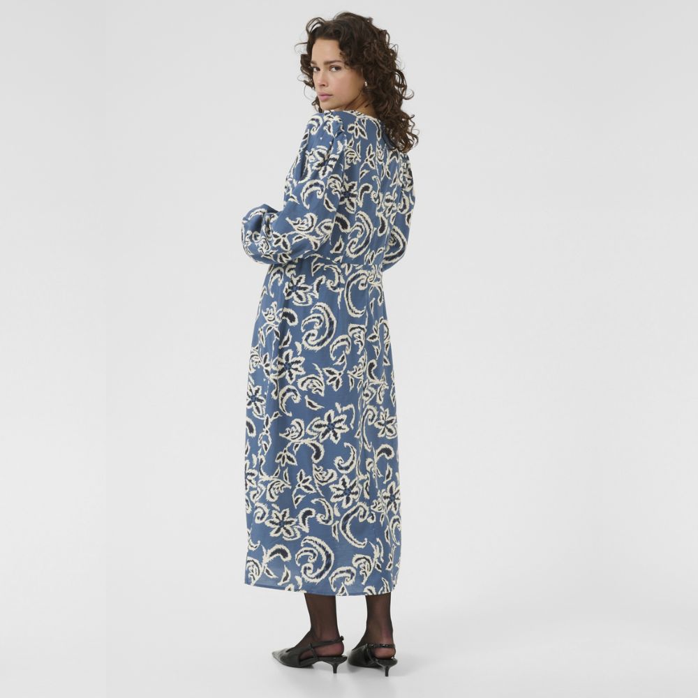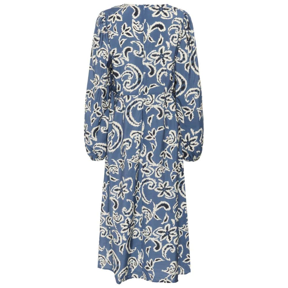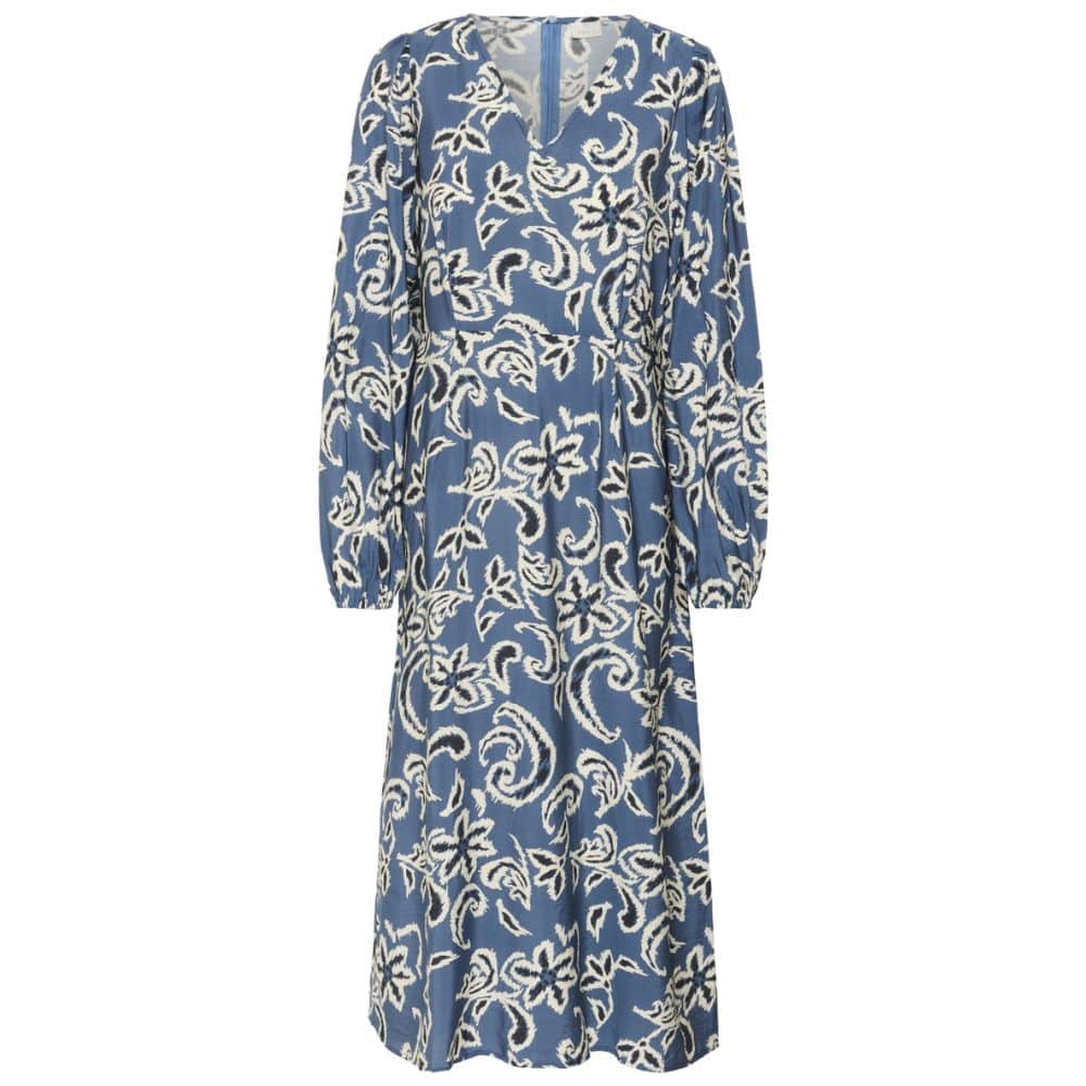 Kaffe – vaaleansininen kukkakuviollinen midi-mekko on kauniisti istuva ja monikäyttöinen valinta arkeen ja juhlavampiin hetkiin. V-pääntie ja pitkät, väljät hihat tuovat asuun pehmeyttä. Kevyt materiaali ja vyötärösauma korostavat siluettia miellyttävästi.