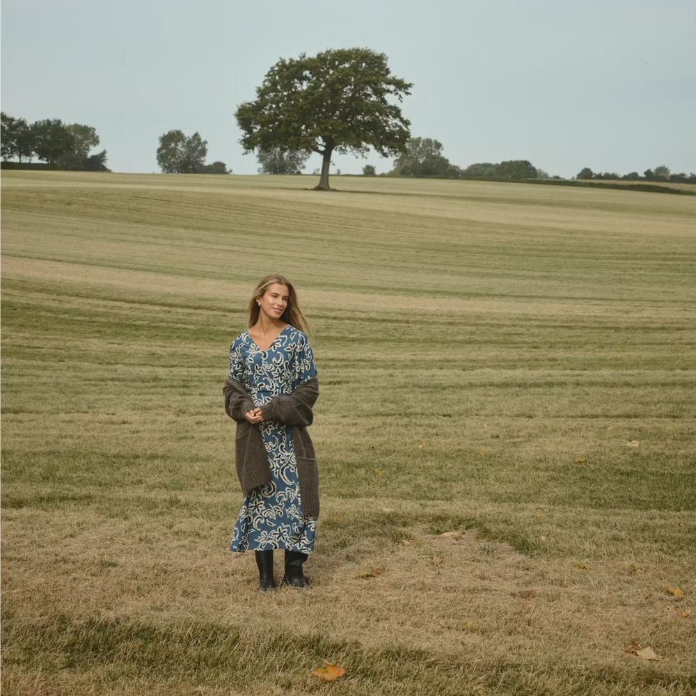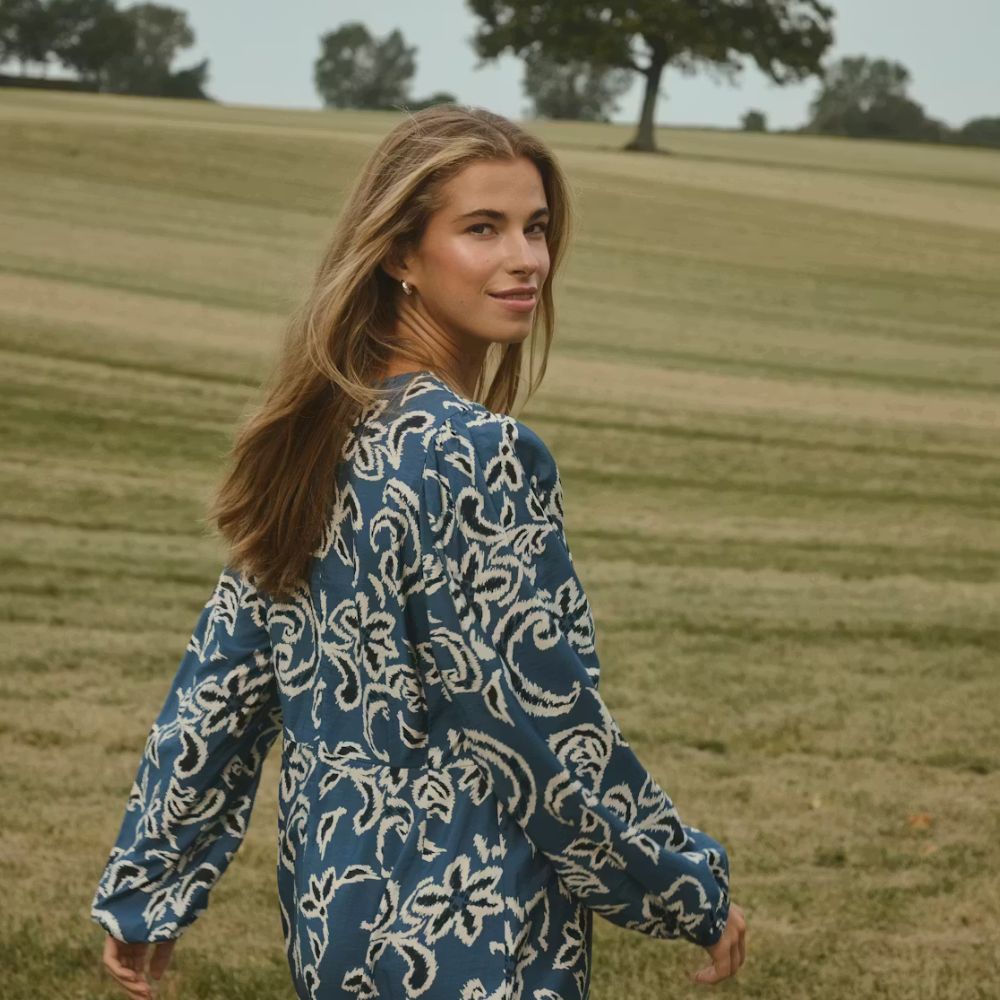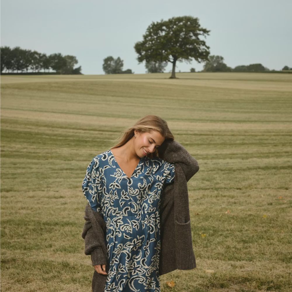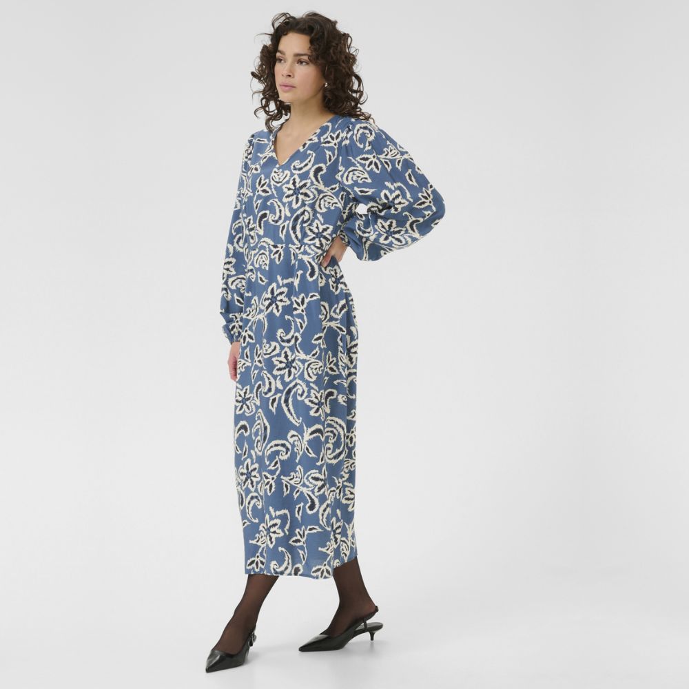 Kaffe – vaaleansininen kukkakuviollinen midi-mekko on kauniisti istuva ja monikäyttöinen valinta arkeen ja juhlavampiin hetkiin. V-pääntie ja pitkät, väljät hihat tuovat asuun pehmeyttä. Kevyt materiaali ja vyötärösauma korostavat siluettia miellyttävästi.