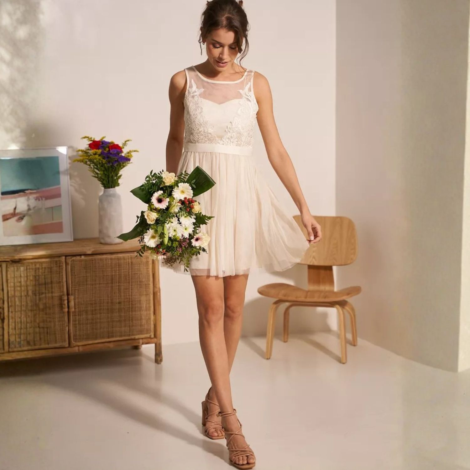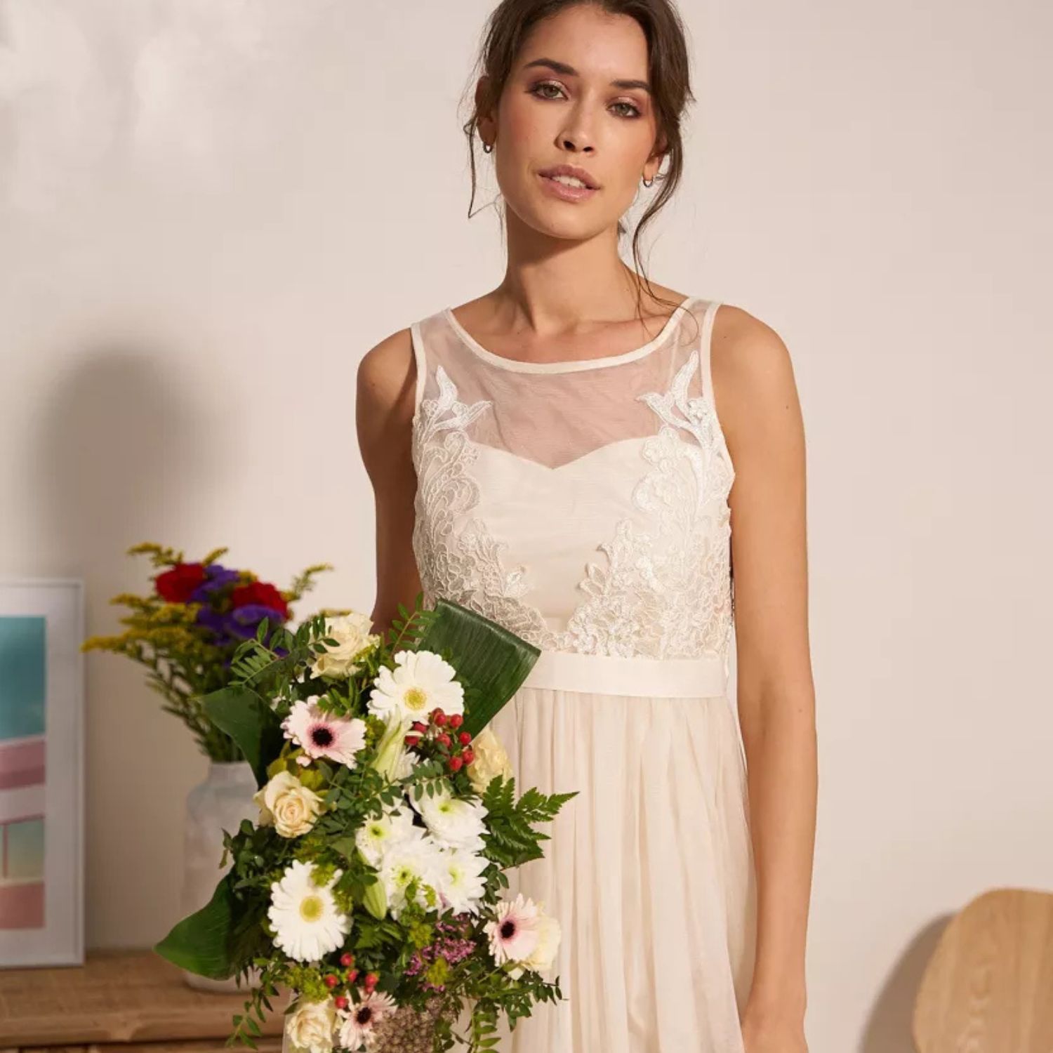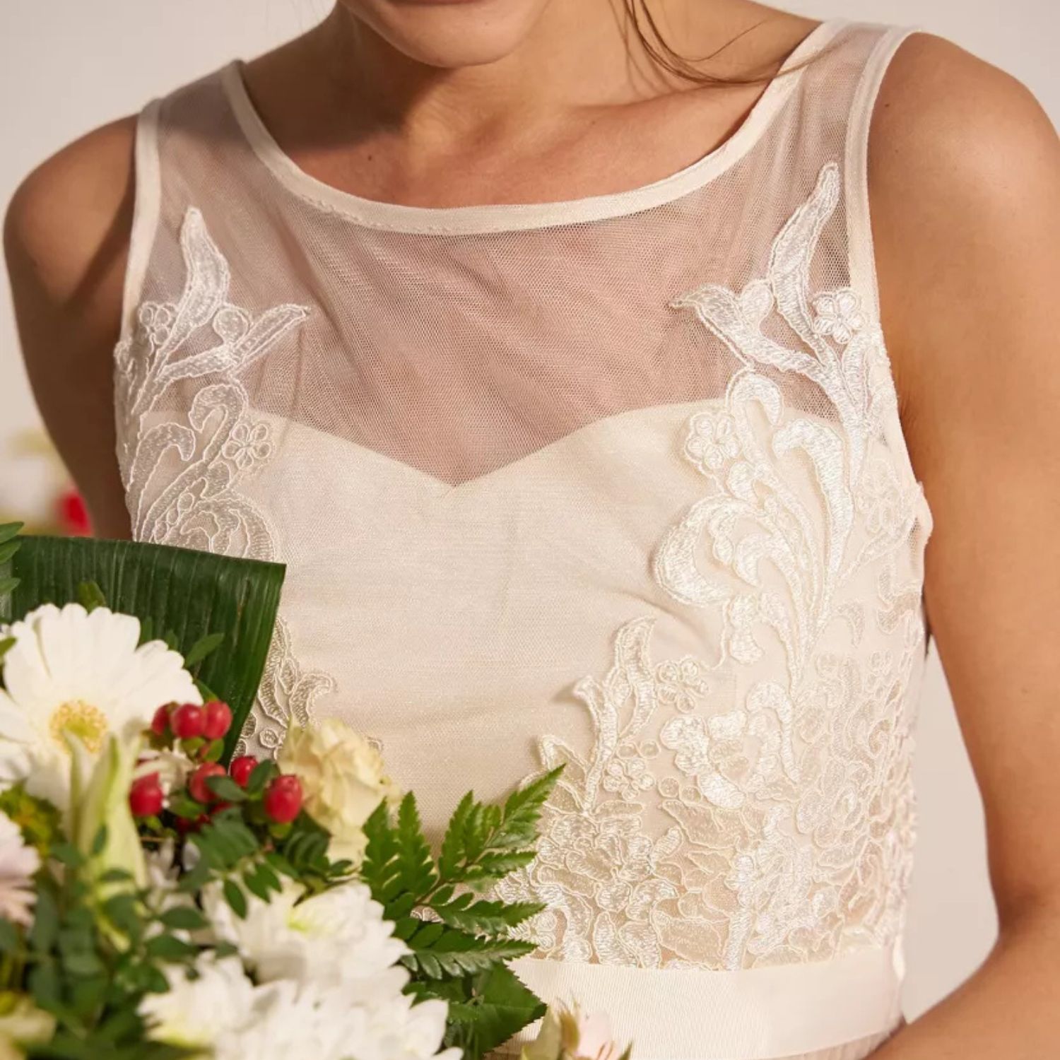 Ihastuttavan upea luonnonvalkoinen juhlamekko, jossa kauniisti laskeutuva tyllihelma. Mekon yläosassa on herkkää mesh-kangasta ja pitsiä kirjailtuna.