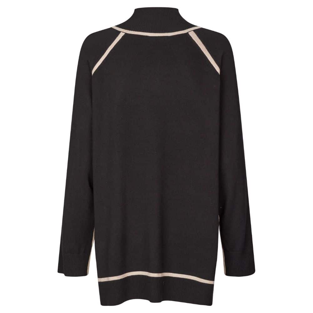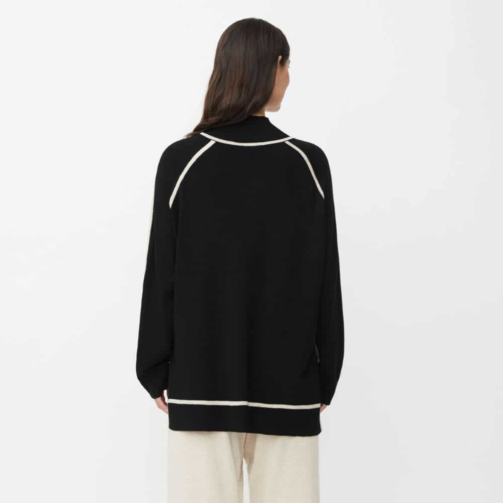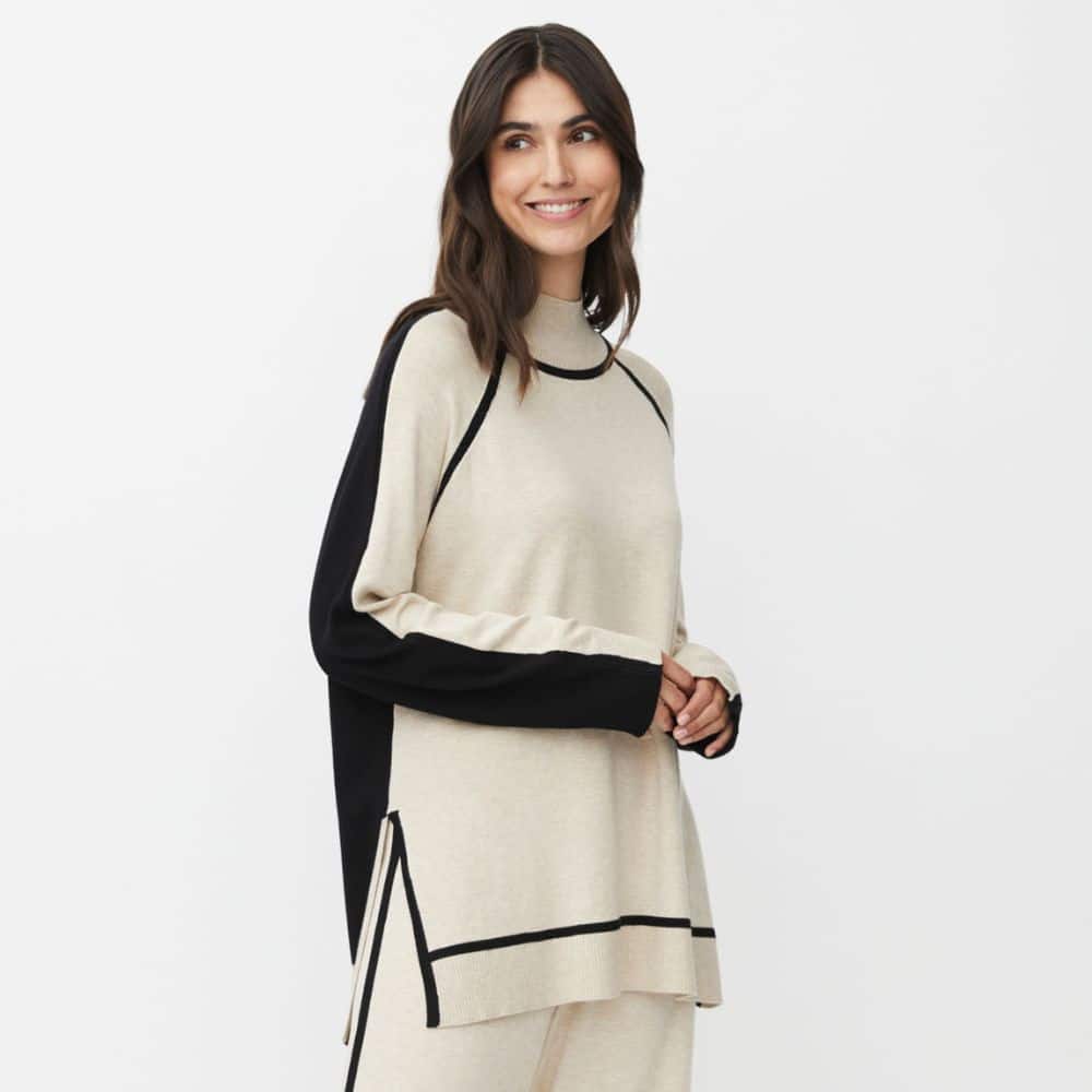 Tämä neule sopii erinomaisesti niin yksinään kuin kerrospukeutumiseen. Mustat yksityiskohdat tuovat ilmeeseen ryhtiä, ja korkea kaulus tekee puserosta tyylikkään valinnan myös viileämpiin päiviin. Voit pukea tämän neuleen esimerkiksi mustien housujen kanssa huolettoman tyylikkääseen arkilookiin. Rennompaa ilmettä saat yhdistämällä saman sarjan housuihin. Neuleen suora malli ja halkiot helmassa tekevät siitä miellyttävän käyttää myös liikkuessa.