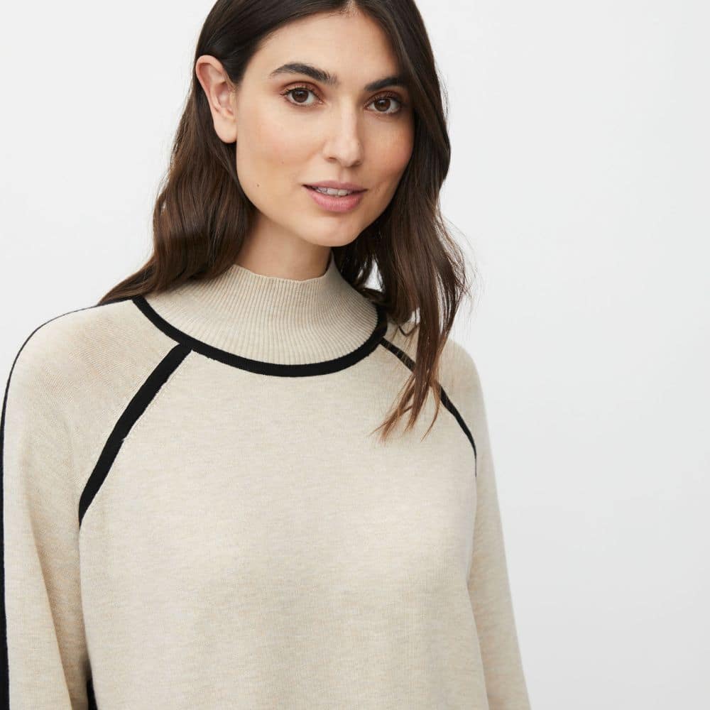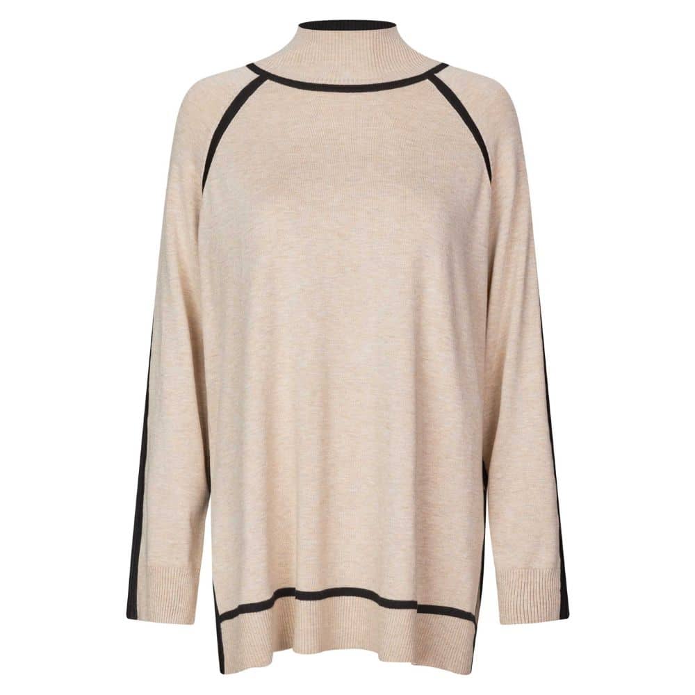 Kevyt ja pehmeä neulepusero, jossa on ajattoman tyylikäs muotoilu. Beigen sävy, mustat tehosteyksityiskohdat ja suora leikkaus tekevät tästä neuleesta helposti yhdisteltävän arkeen ja rentoon juhlaan.