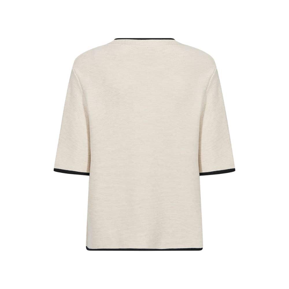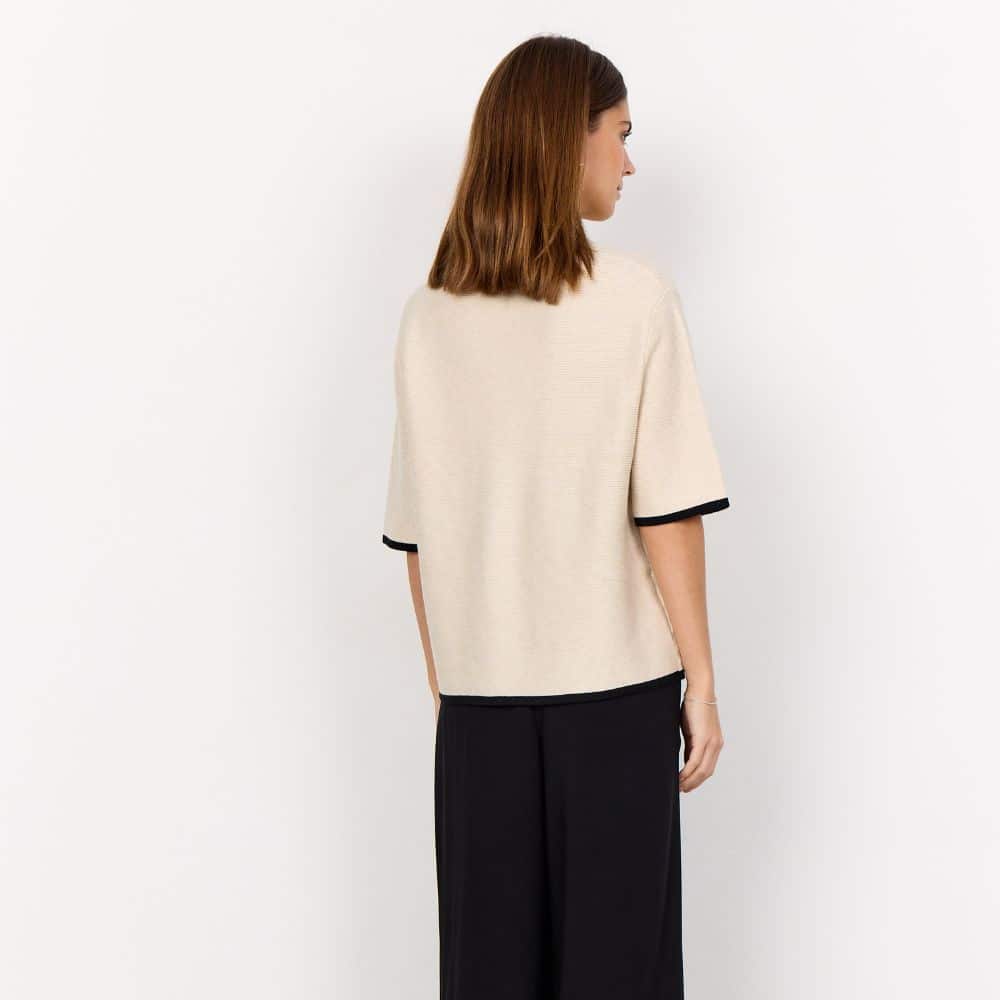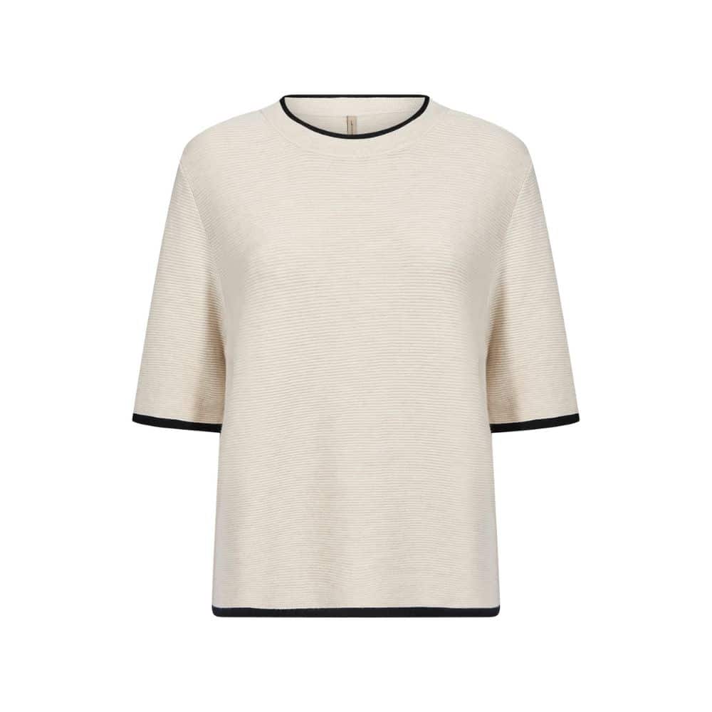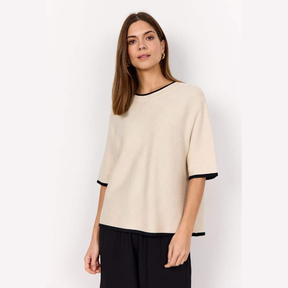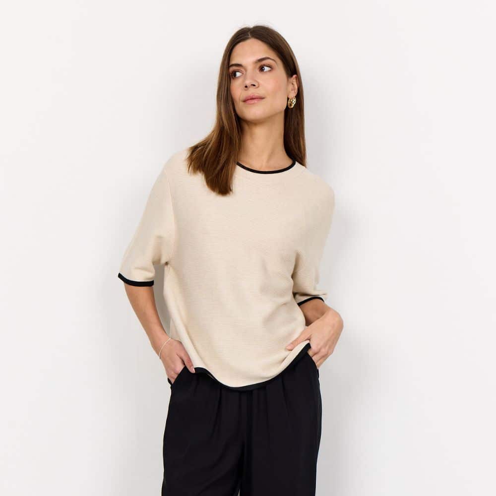 SC – luonnonvalkoinen neulepusero mustilla yksityiskohdilla tuo asuusi raikkaan ja huolitellun ilmeen. Kevyt ja pehmeä neulos tekee siitä mukavan valinnan arkeen.