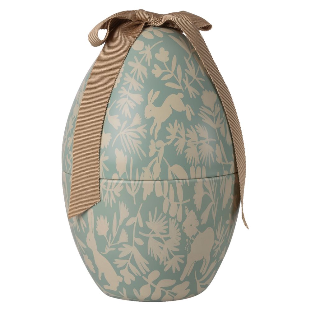 Maileg – vaalean sinisen sävyinen pääsiäismuna on ihana koriste kevätkotiin ja pääsiäissisustukseen. Metallinen muna on koristeltu kauttaaltaan yksityiskohtaisella kuviolla, josta voi löytää erilaisia eläinhahmoja. Munan päällä on kaunis beige rusetti.