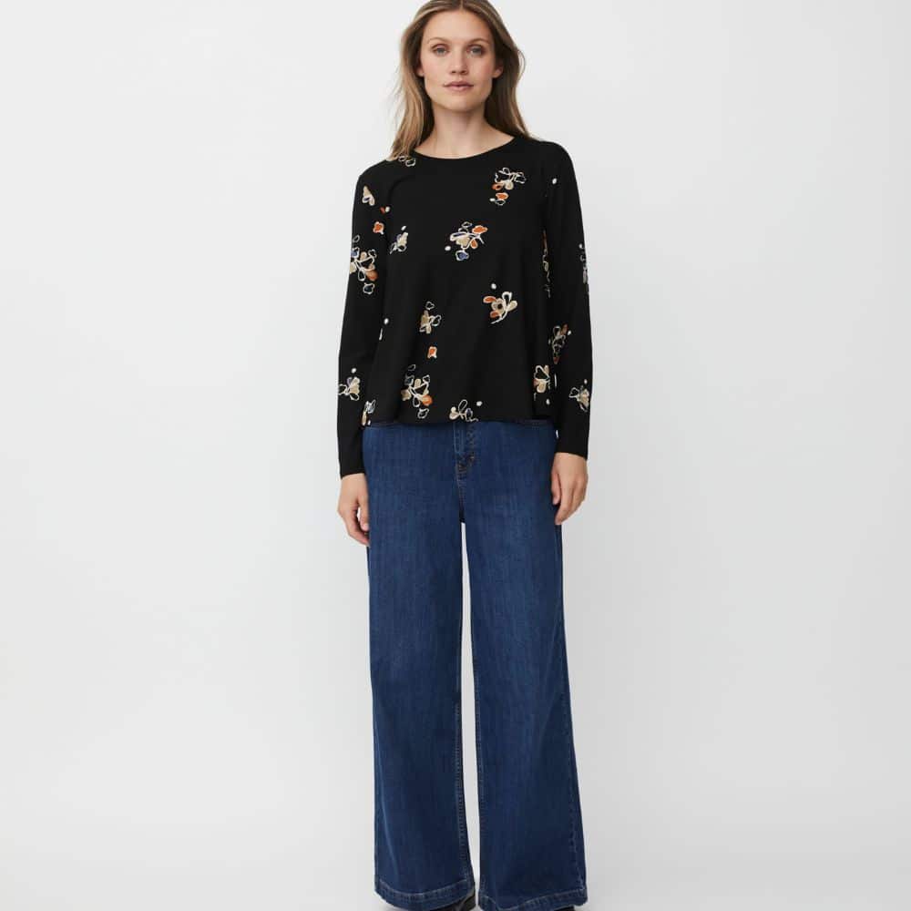 Trikoopaita sopii yhteen niin kapeiden housujen, leveiden lahkeiden kuin hameen kanssa. Kuviollinen pinta tekee asusta kiinnostavan, mutta samalla helpon yhdistellä eri kokonaisuuksiin. Pehmeä ja joustava kangas tuntuu hyvältä ihoa vasten. Paita on suunniteltu istumaan mukavasti ja antamaan liikkumavapautta koko päivän ajaksi.