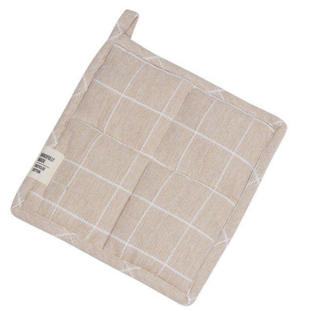 Fondaco – beigensävyinen ruudullinen patalappu on kaunis ja käytännöllinen apuväline keittiöön. Sen hillitty ruutukuvio tuo perinteistä tunnelmaa, ja luonnonvalkoinen sävy sopii helposti monenlaisiin keittiöihin. Patalappu suojaa käsiä kuumilta astioilta ja on aina kätevästi saatavilla.