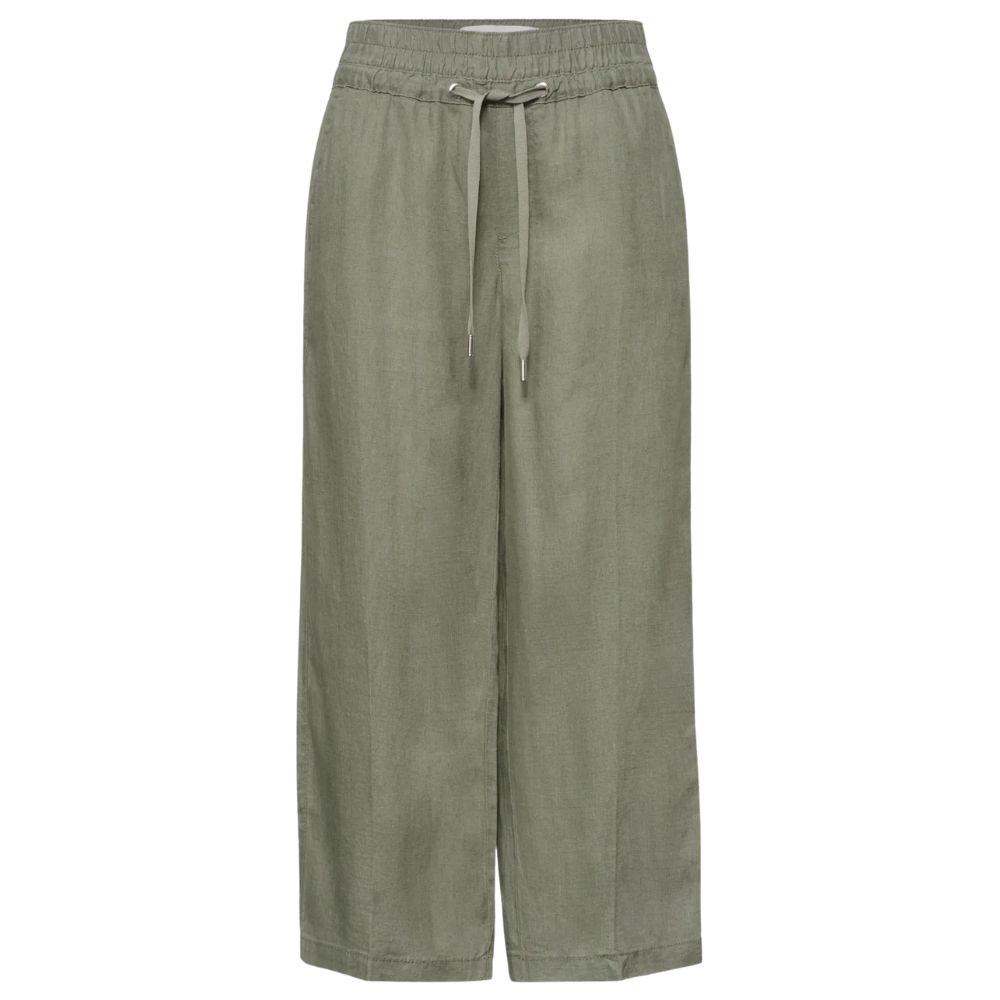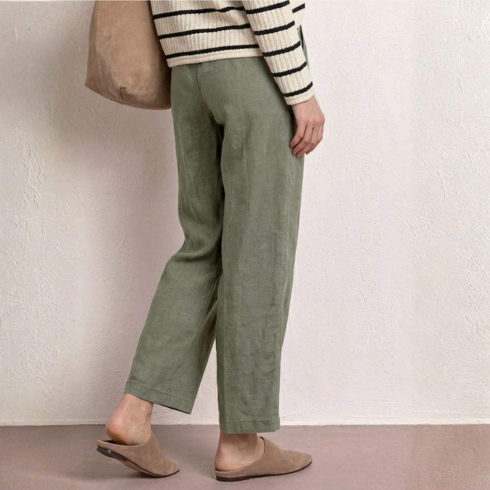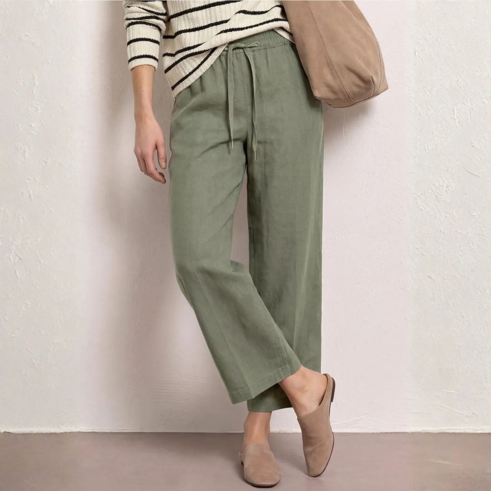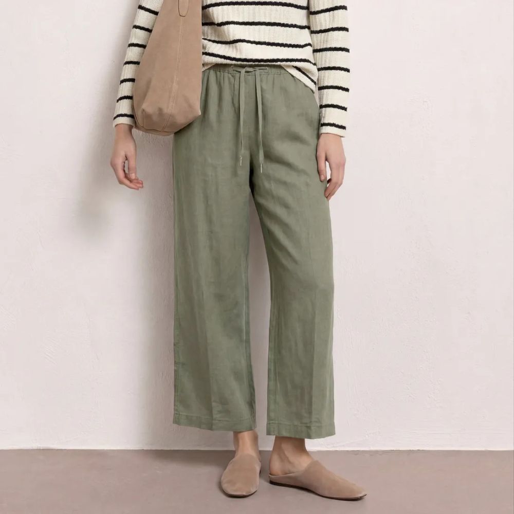Pellavahousut tuovat kesäpukeutumiseen keveyttä ja rentoa ilmettä. Vihreä sävy tekee asusta raikkaan ja helposti yhdisteltävän. Väljä malli tekee housuista mukavat käyttää lämpiminä päivinä.
