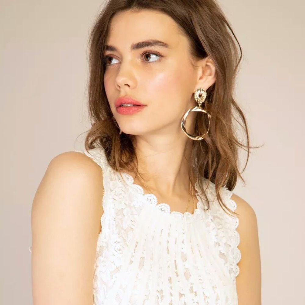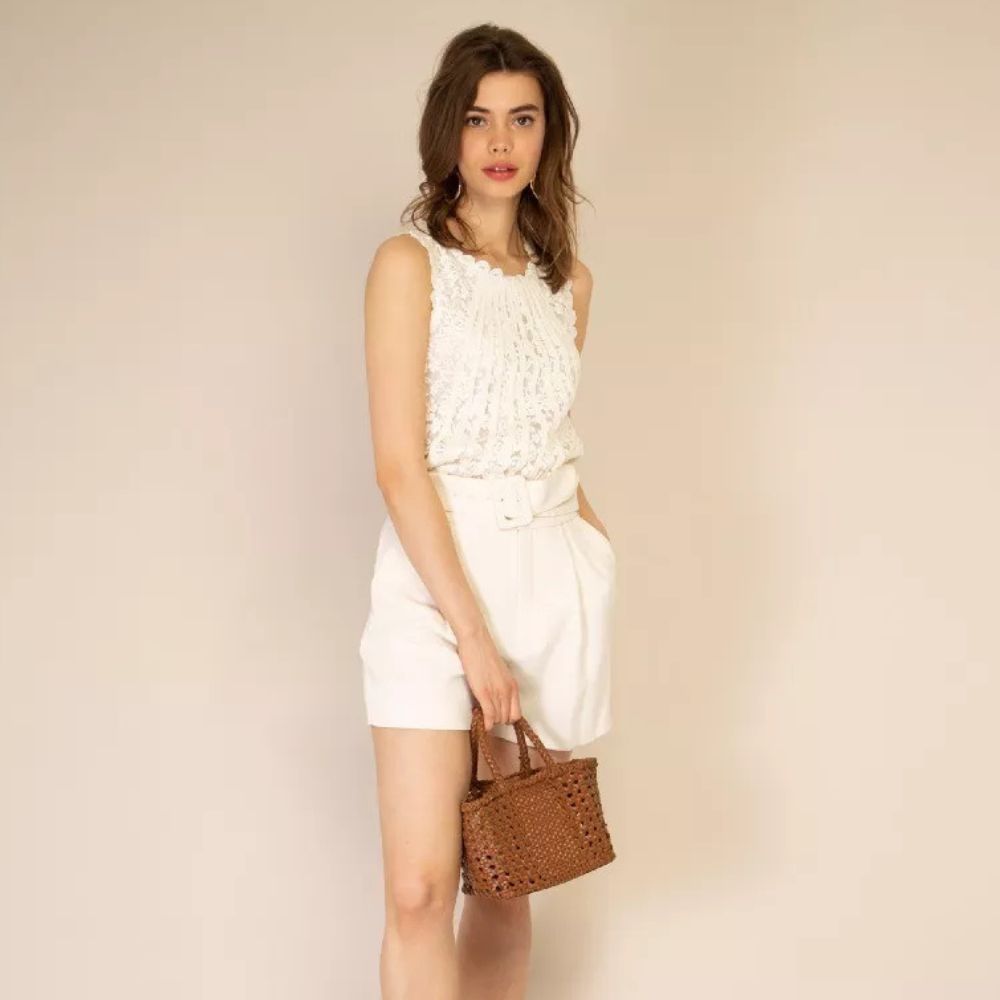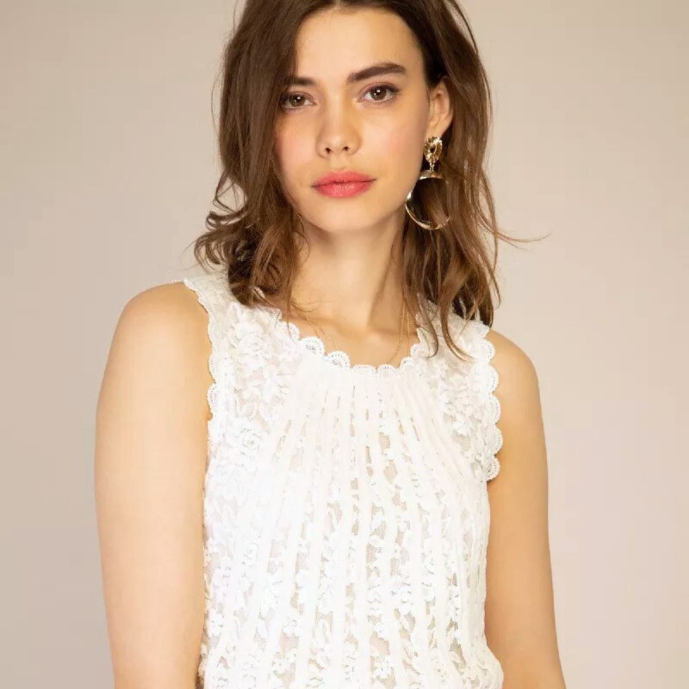 Hihaton toppi saa kauniin ilmeen herkästä pitsimateriaalista ja kauniista laskoksista edessä. Valkea toppi on kaunis osa juhlapukeutumista esimerkiksi hameen tai suorien housujen parina tai bleiseriin yhdistettynä.