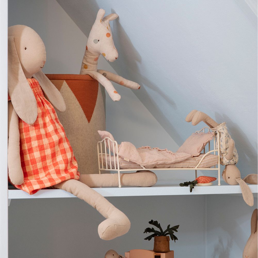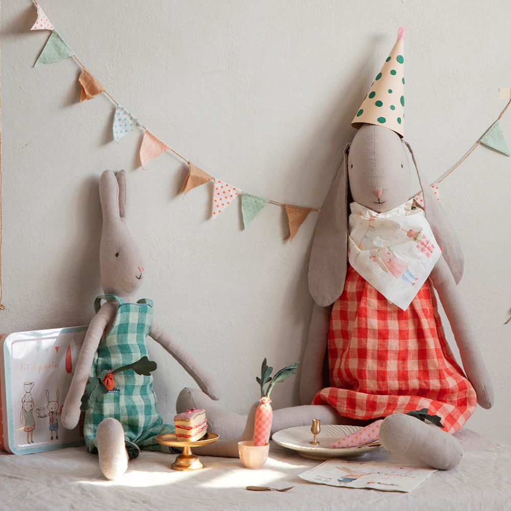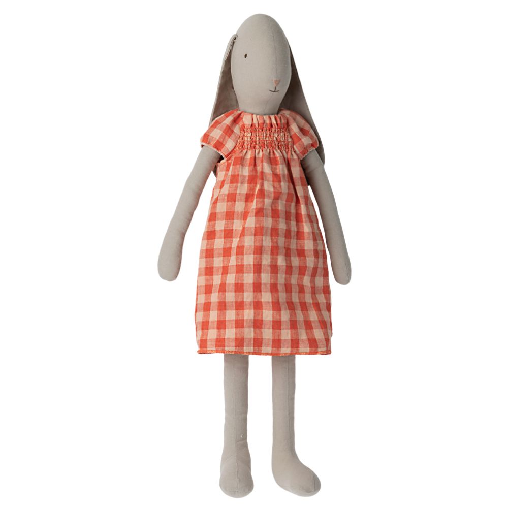 Maileg –hurmaava ja suuri pehmopupu, jolla ruudullinen mekko. Pehmeästä pellava- ja puuvillakankaasta valmistettu pupu tuntuu miellyttävältä halata, ja kaunis mekko tekee siitä valmiin sekä leikkiin että koristeeksi. Pupu sopii hyvin osaksi Mailegin satumaista maailmaa.