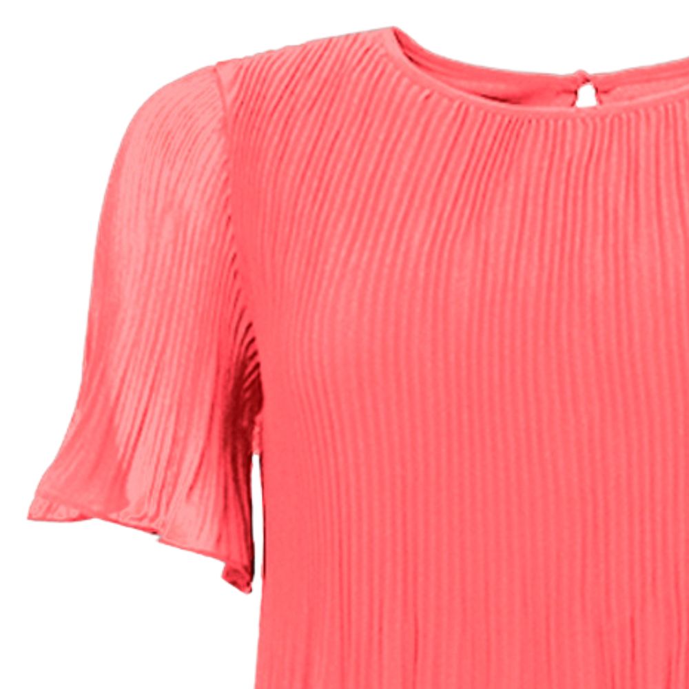 Korallin punainen pusero, jossa kauniin ilmavat lyhyet hihat. Paidassa on pyöreä pääntie ja niskassa soma nappikiinnitys.