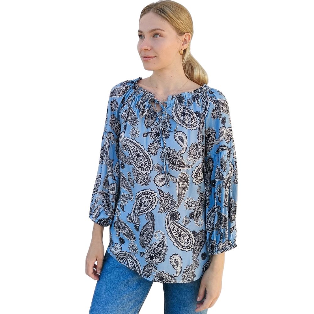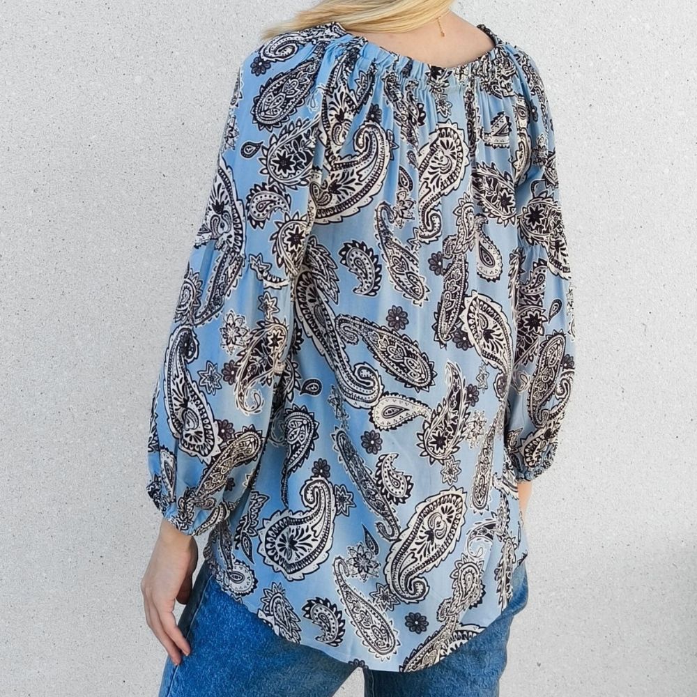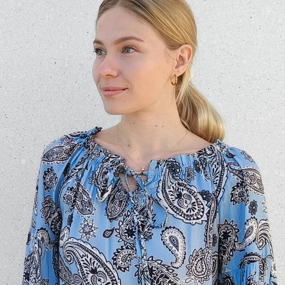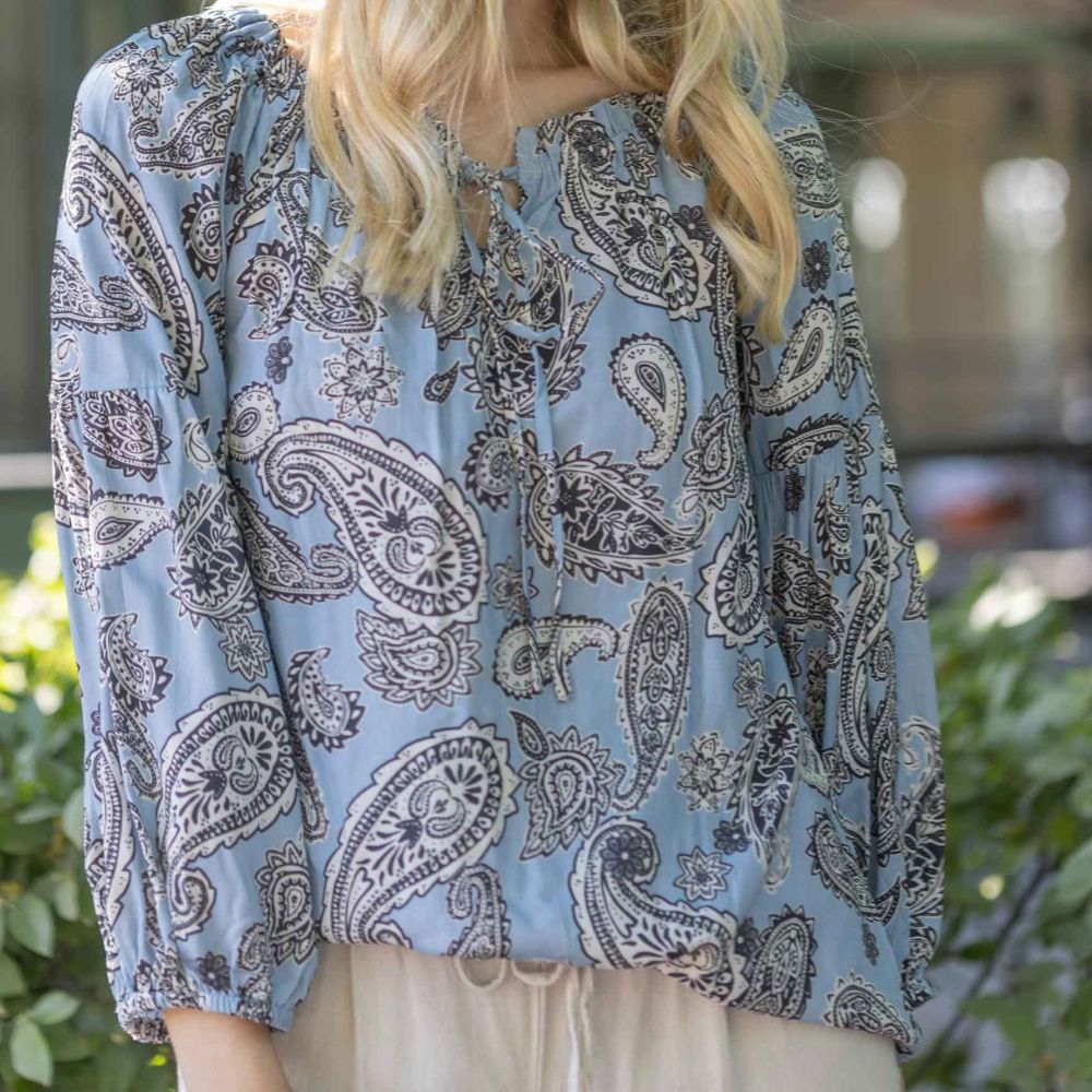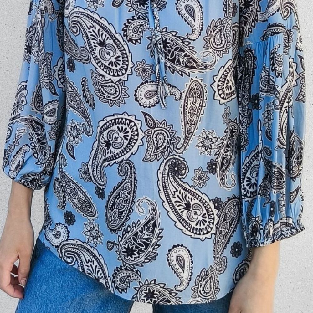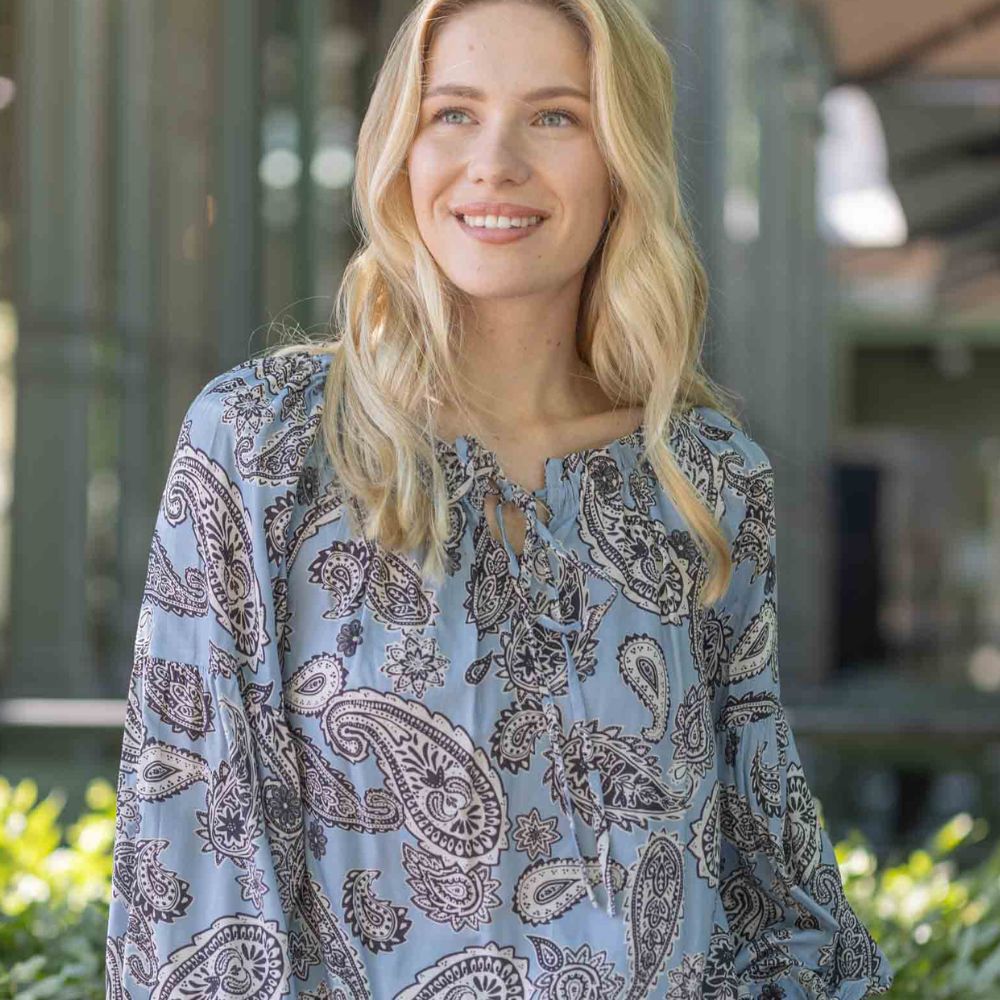 Vaaleansininen kevyt pusero, jossa kaunis paisley-kuviointi. Ihanasti laskeutuva lyocell-materiaali tuntuu pehmeältä ja vilpoiselta iholla.