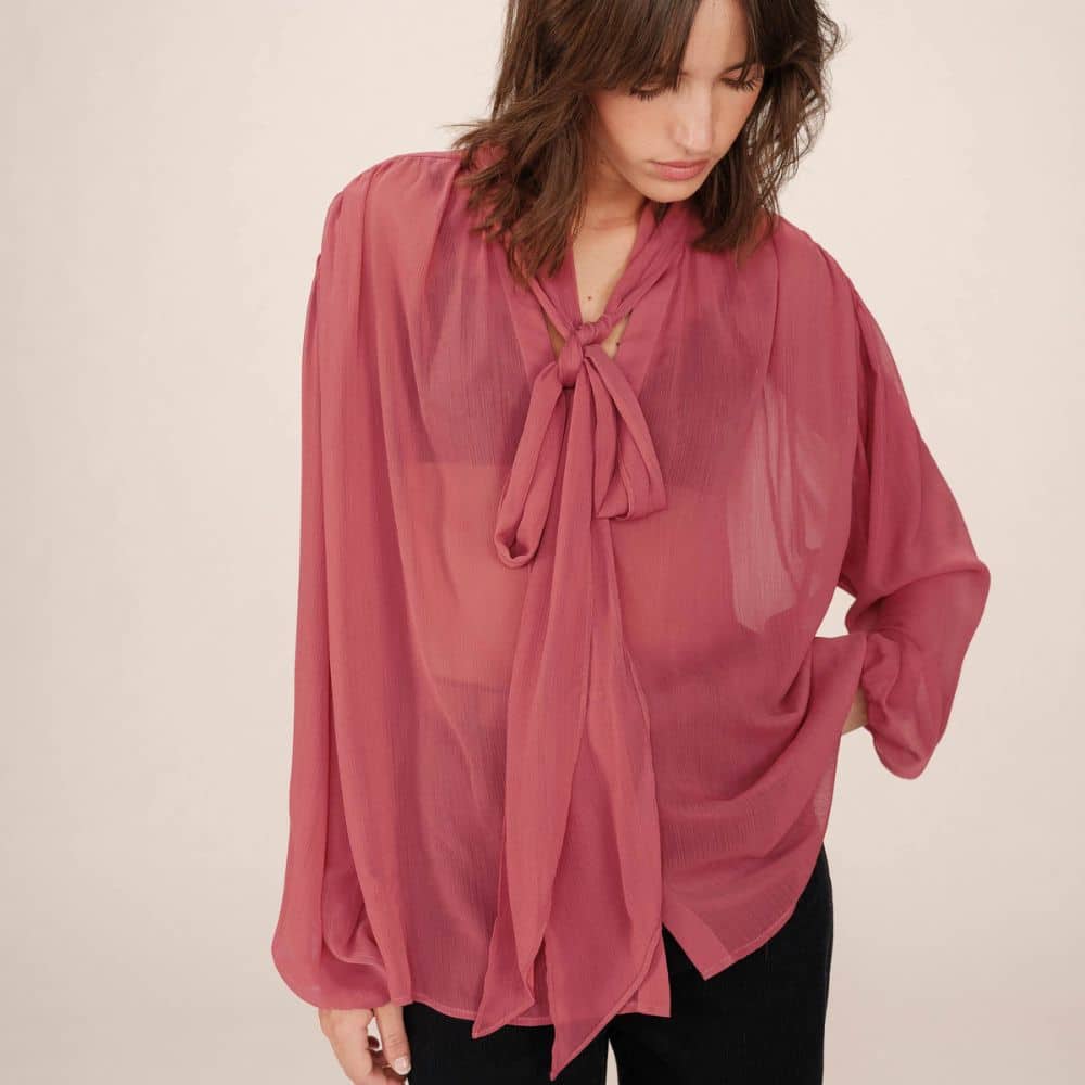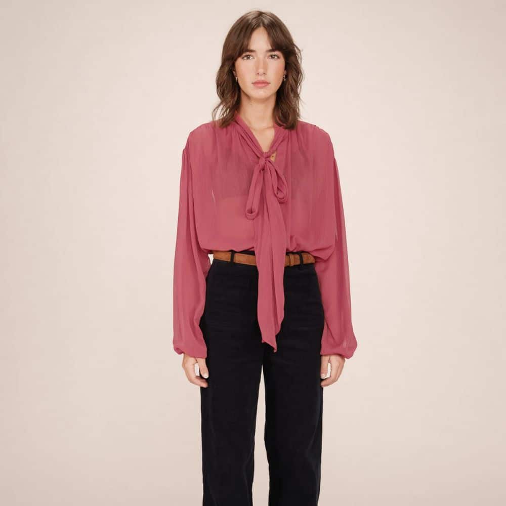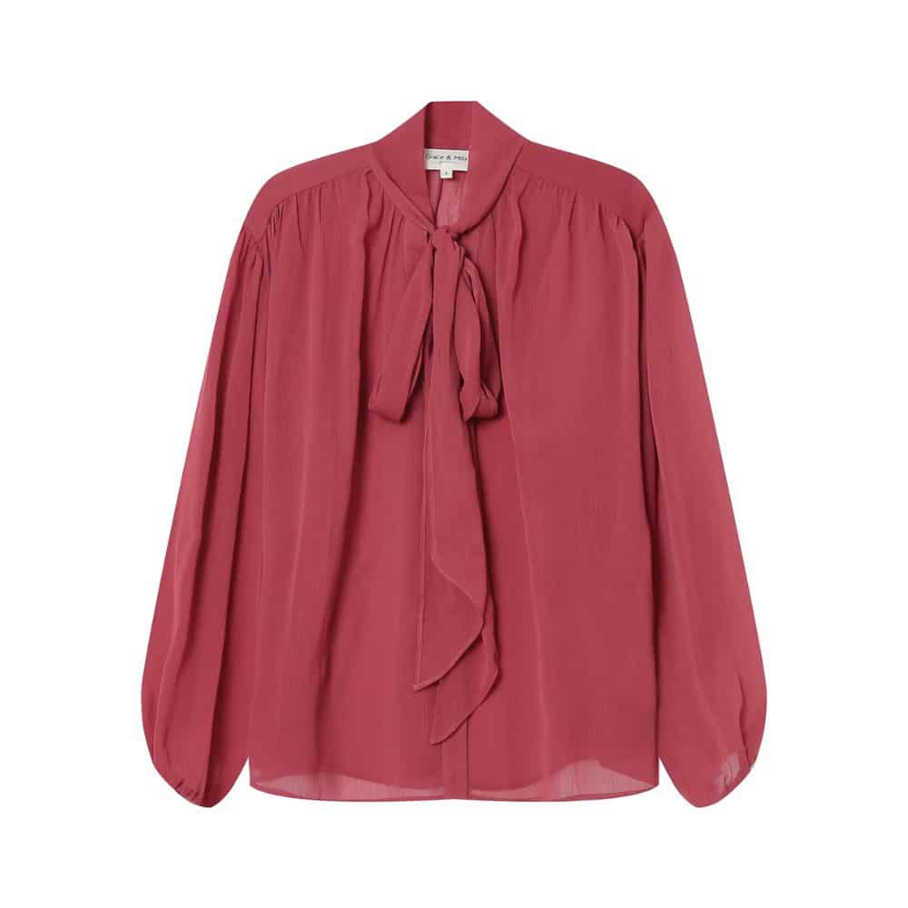 G&M – roosanpunainen kevyt ja ilmava pusero tuo asuun naisellista ilmettä. Solmittava kaulus ja kauniit yksityiskohdat tekevät siitä monikäyttöisen valinnan niin arkeen kuin juhlaan. Rentoon istuvuuteen yhdistyy laskeutuva kangas, joka tekee kokonaisuudesta huolitellun mutta rennon.