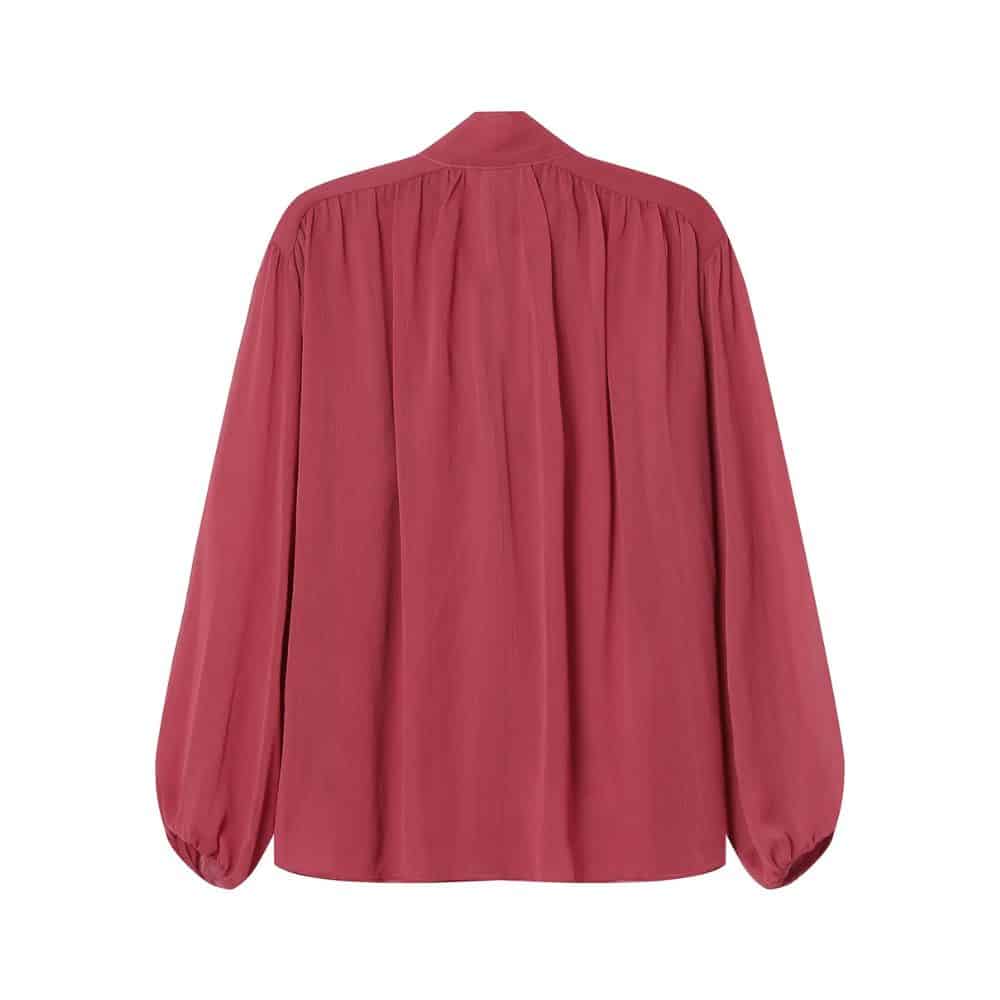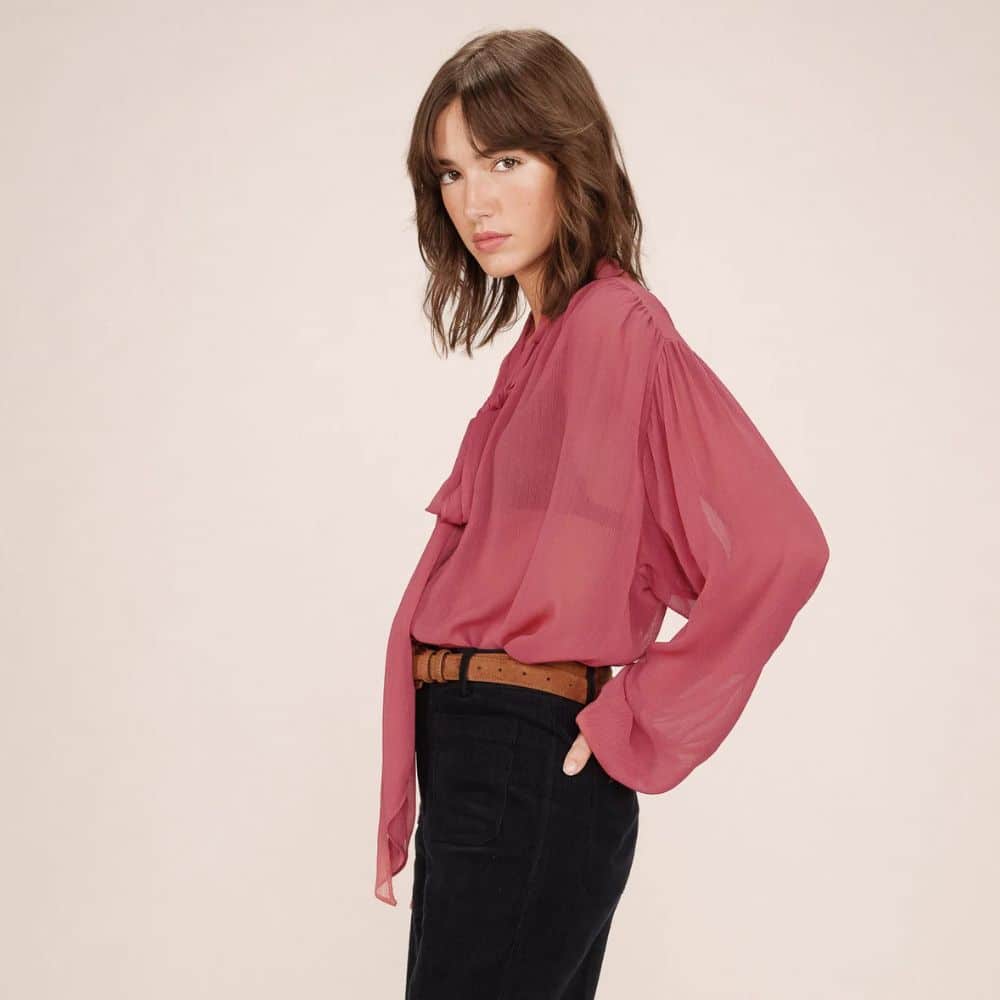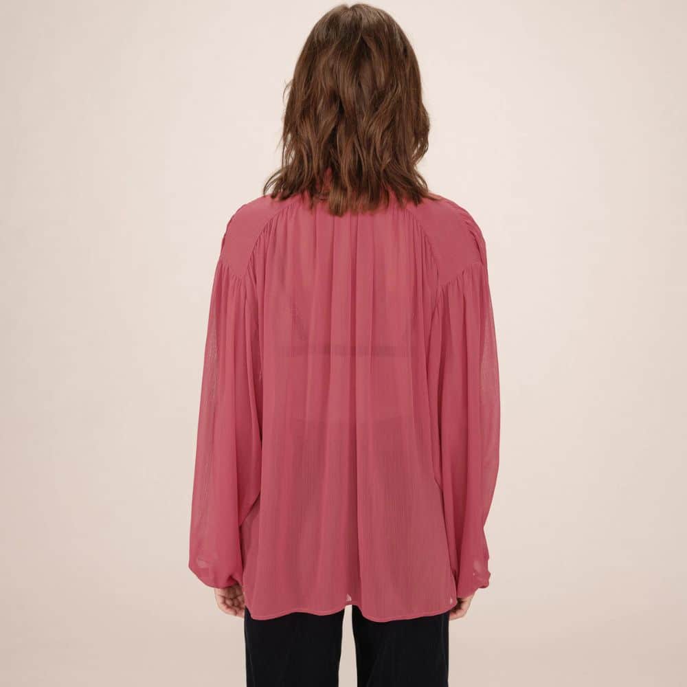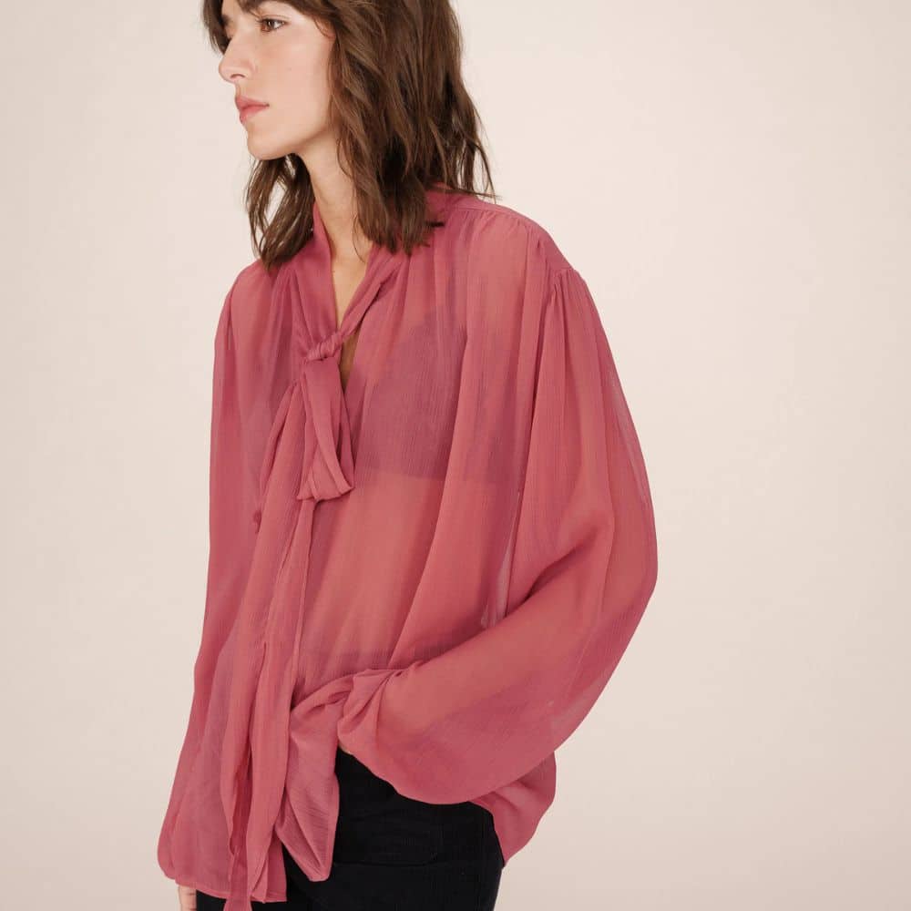 G&M – roosanpunainen kevyt ja ilmava pusero tuo asuun naisellista ilmettä. Solmittava kaulus ja kauniit yksityiskohdat tekevät siitä monikäyttöisen valinnan niin arkeen kuin juhlaan. Rentoon istuvuuteen yhdistyy laskeutuva kangas, joka tekee kokonaisuudesta huolitellun mutta rennon.