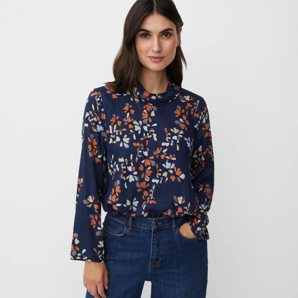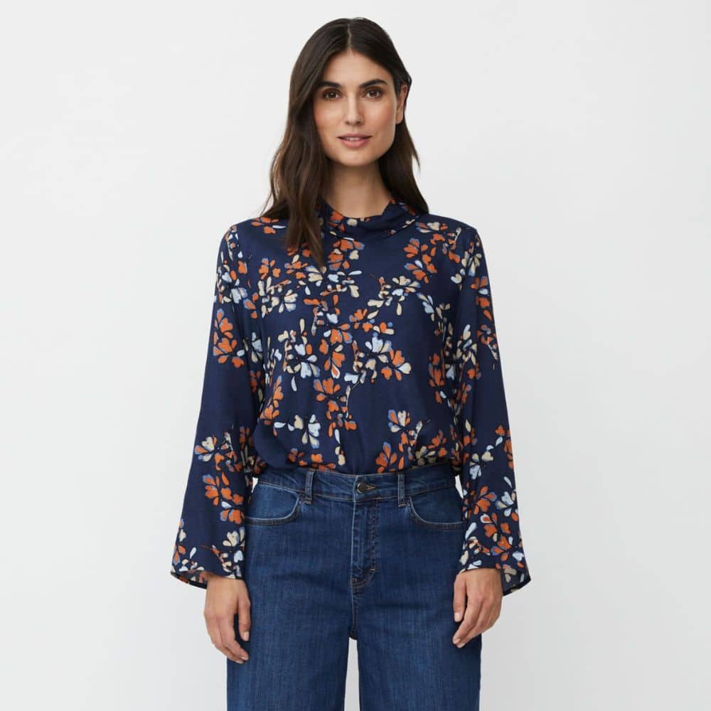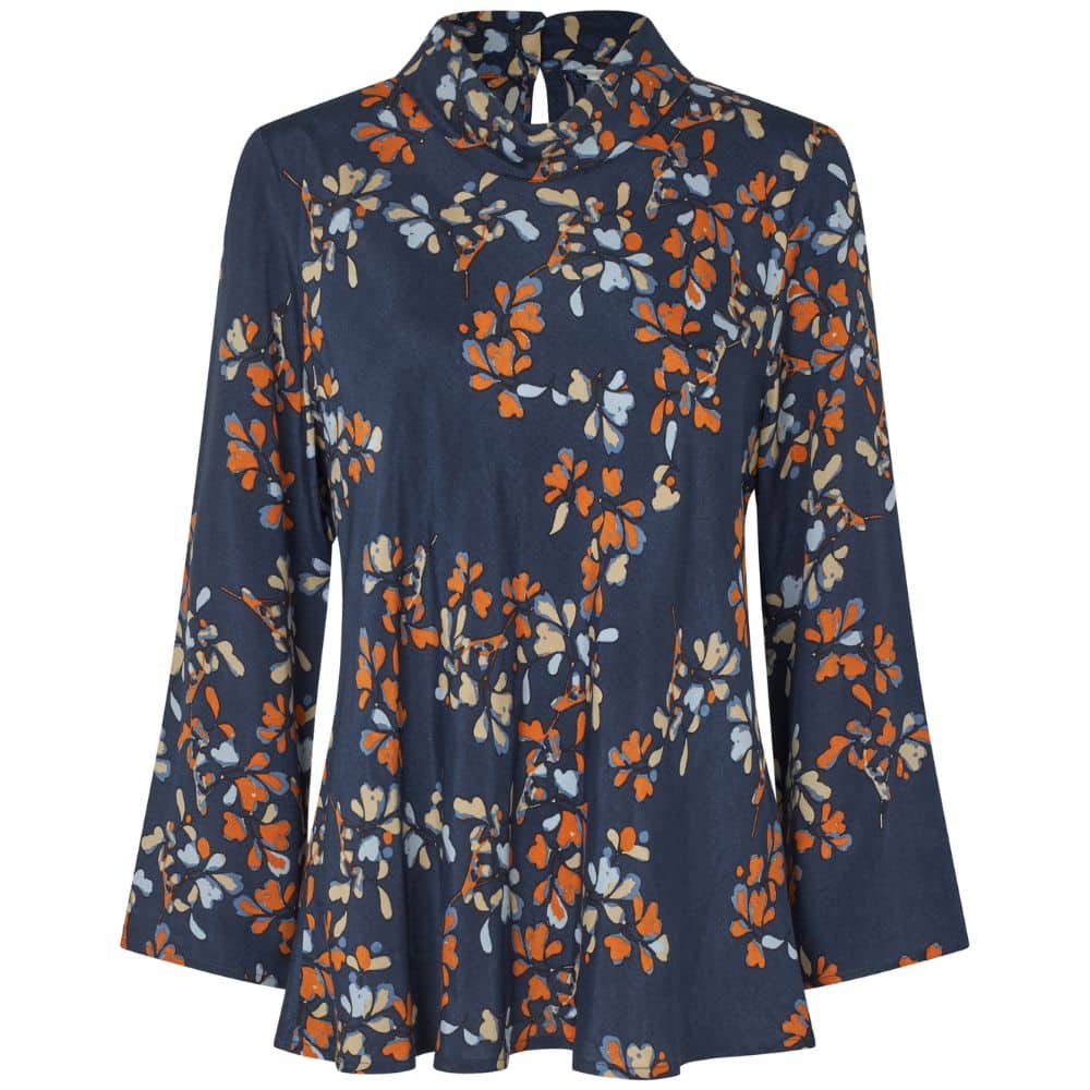 Masai – tummansininen pusero, jossa kaunis kukkakuviointi ja pieni pysty pystykaulus. Paidan niskassa on nappikiinnitys ja paidan hihat ovat hieman levenevät hihansuista. Kauniisti laskeutuva pusero on aivan ihana valinta monenlaisiin tilanteisiin.