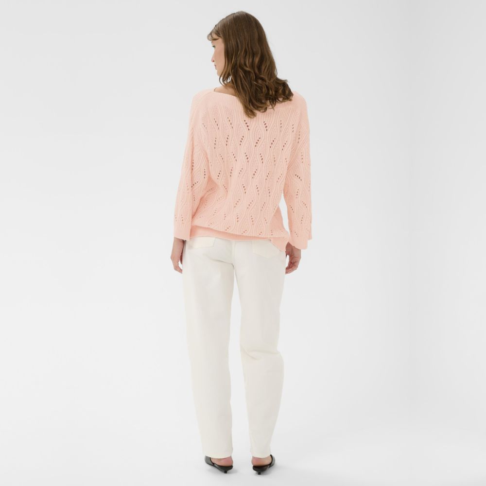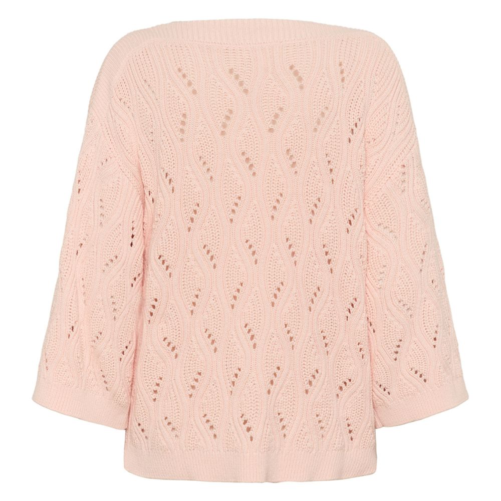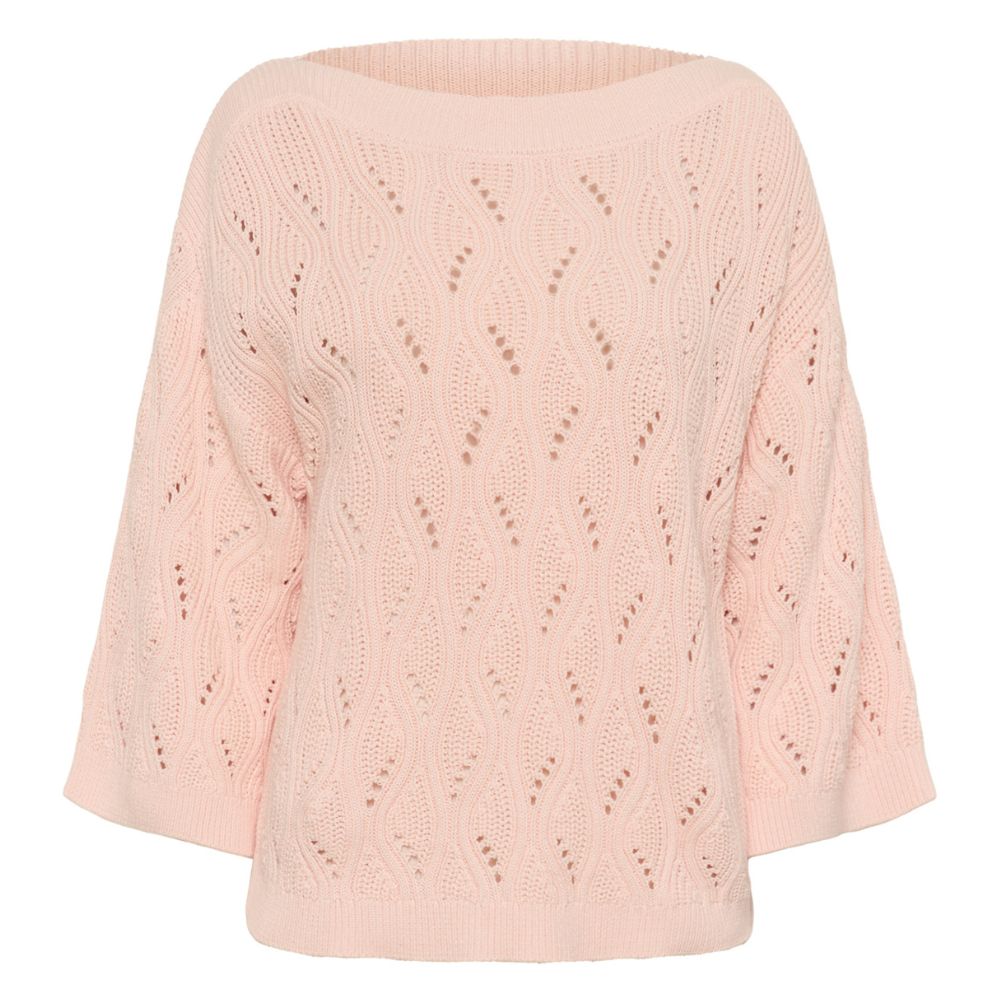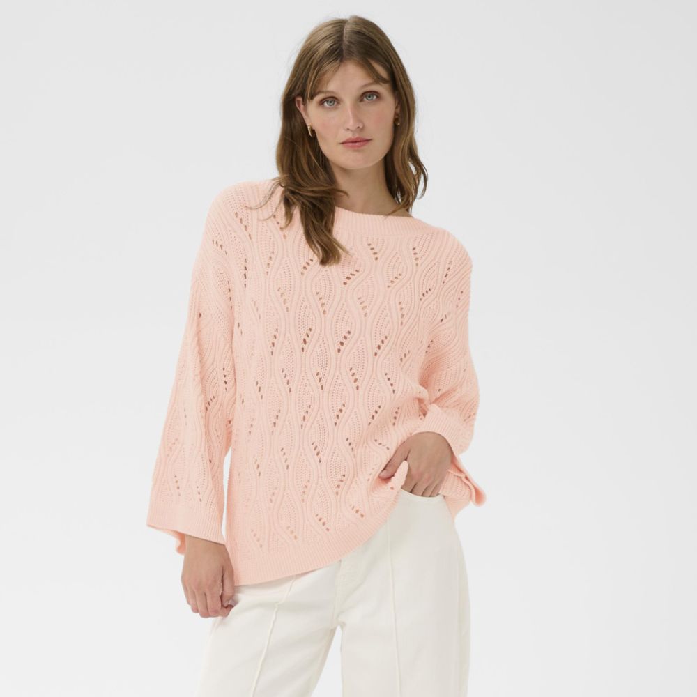 Vaalean persikan sävyinen puuvillaneule on kevyt ja ilmava valinta arkeen. Väljä malli ja avara neulos tekevät siitä rennon ja helposti yhdisteltävän. Pehmeä puuvilla tuntuu miellyttävältä ihoa vasten.