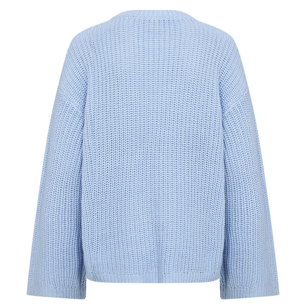 Neuleessa on klassinen pyöreä pääntie, jossa ribbiviimeistely. Väljä istuvuus tuo käyttömukavuutta ja tekee ilmeestä huolettoman. Teksturoitu pinta antaa neuleelle ilmettä ilman suuria yksityiskohtia. Vaaleansininen sävy sopii kauniisti yhteen vaaleiden ja tummien alaosien kanssa. Neule toimii hyvin farkkujen tai siistimpien housujen parina. Tämä malli on varma valinta niin töihin kuin vapaa-aikaan.