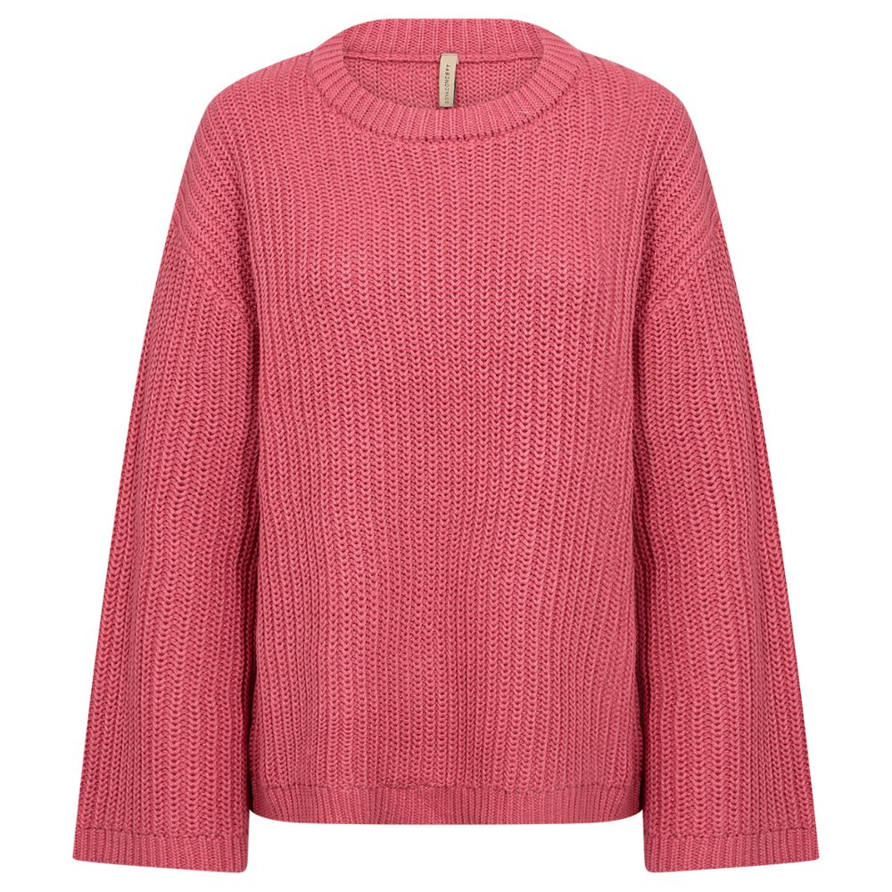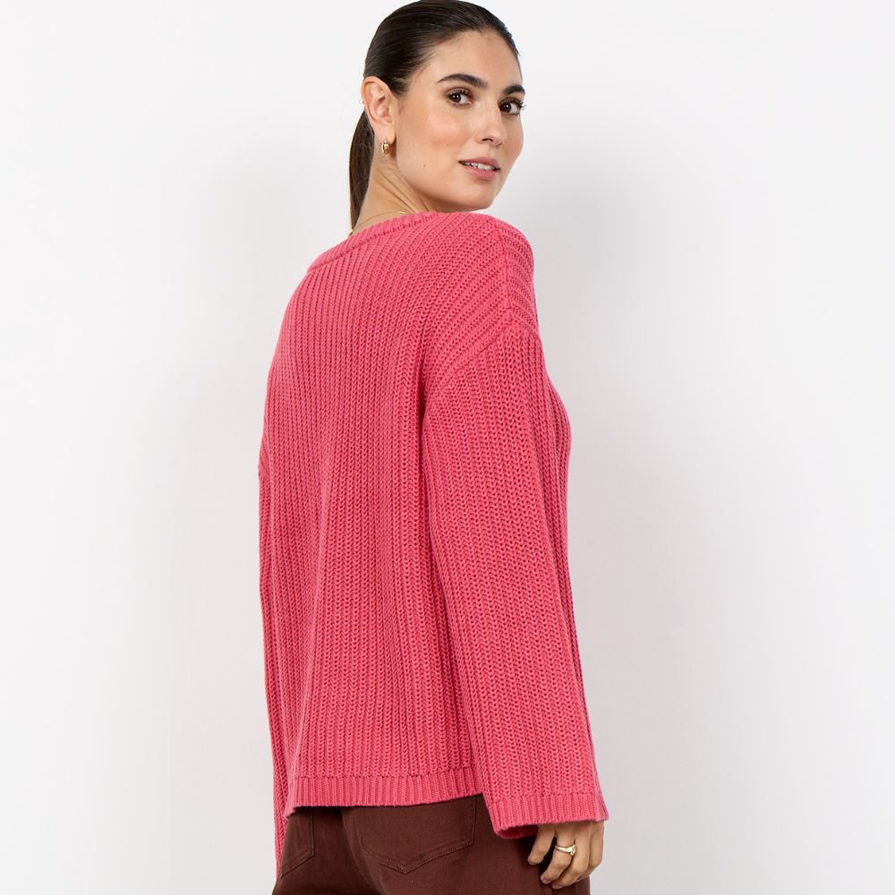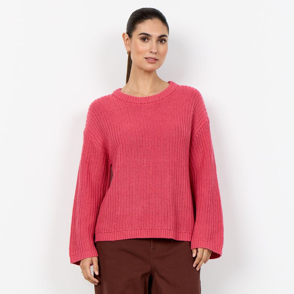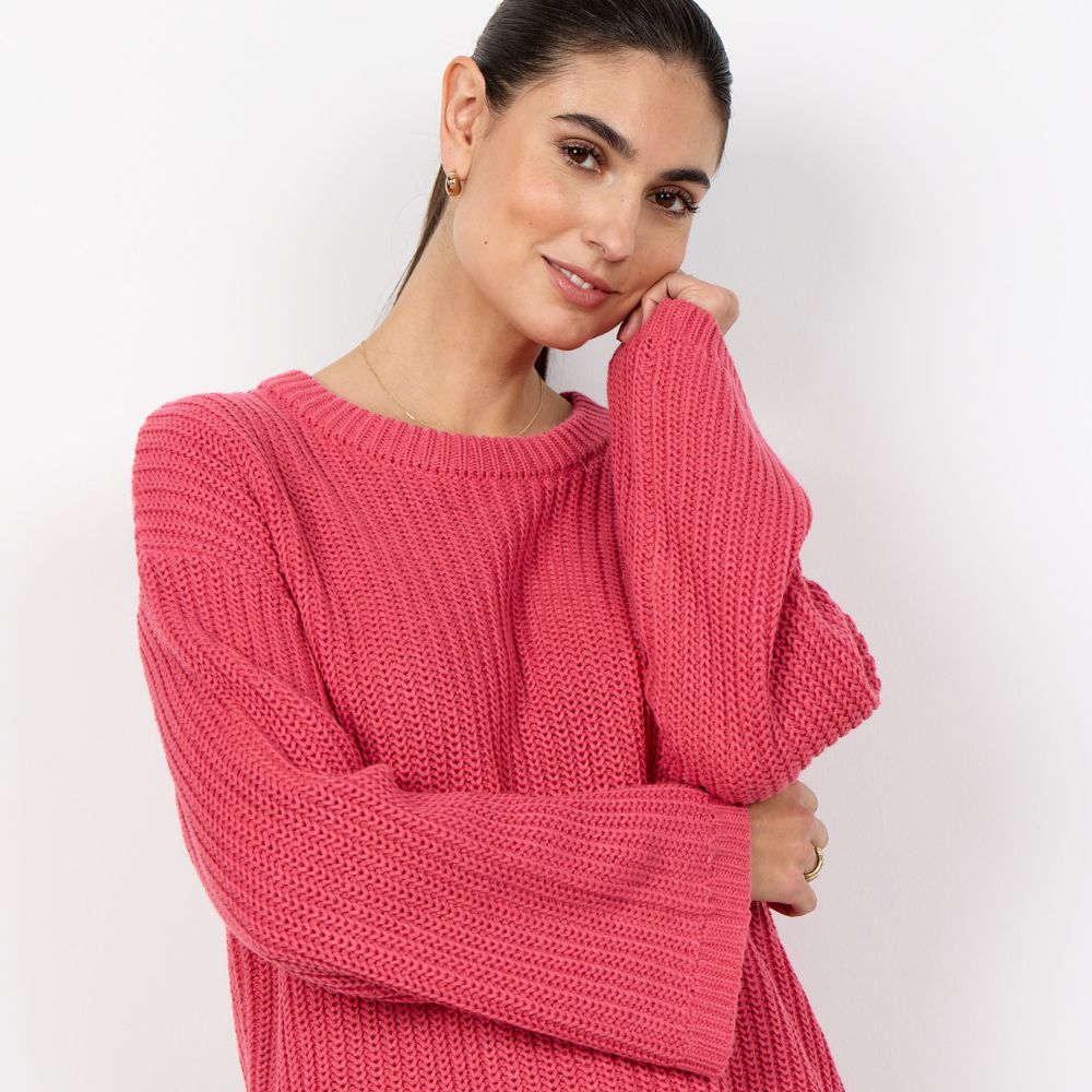 Soyaconcept – vadelmanpunainen puuvillaneule tuo väriä ja pehmeyttä arkipukeutumiseen. Rento istuvuus ja elävä neulospinta tekevät siitä mukavan ja helposti yhdisteltävän. Ajaton malli toimii niin housujen kuin farkkujen kanssa.