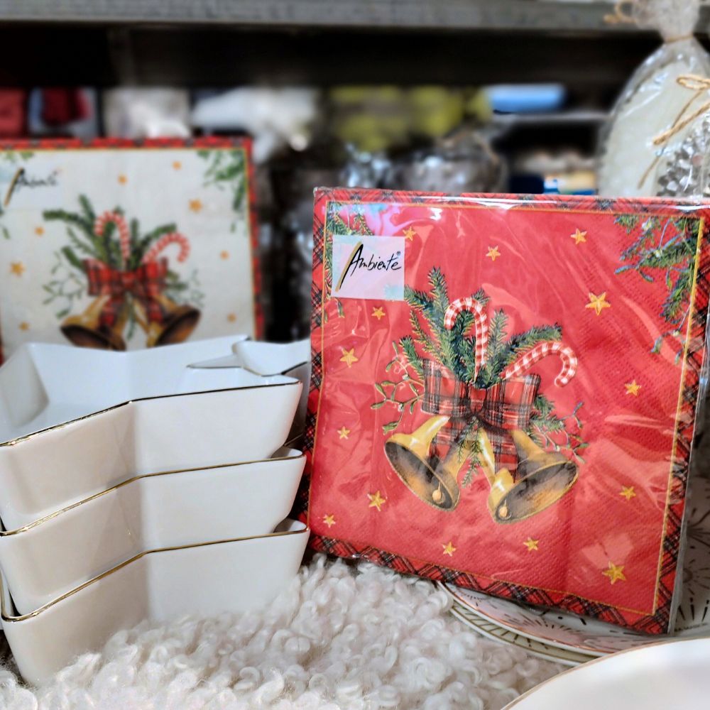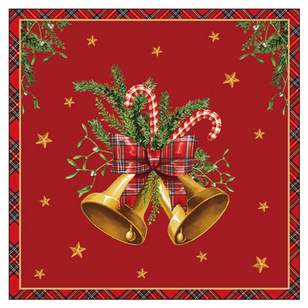 Punaiset ruokaservetit, joissa ihana joulukellojen kuva ja punainen tartan-reunus. Jouluiset ruokailuservetit antavat juhlapöydällesi viimeisen silauksen!