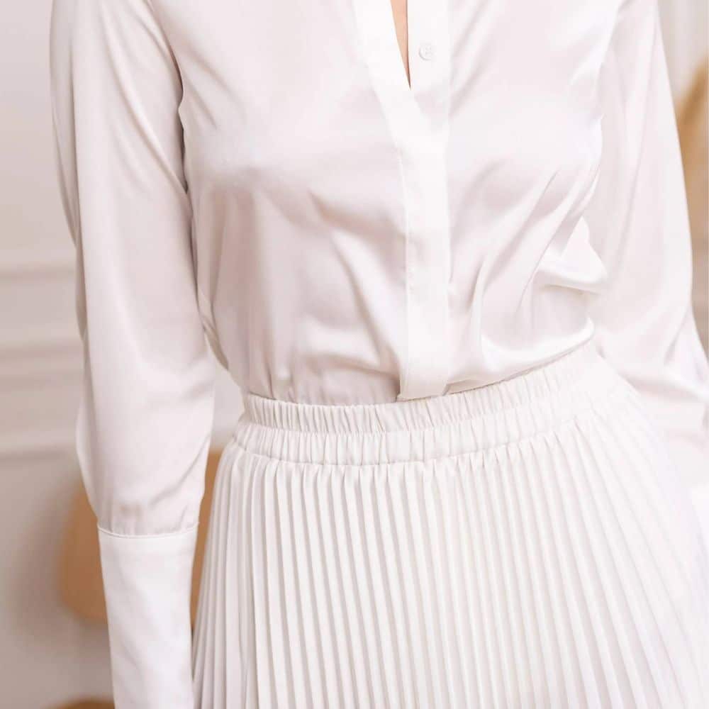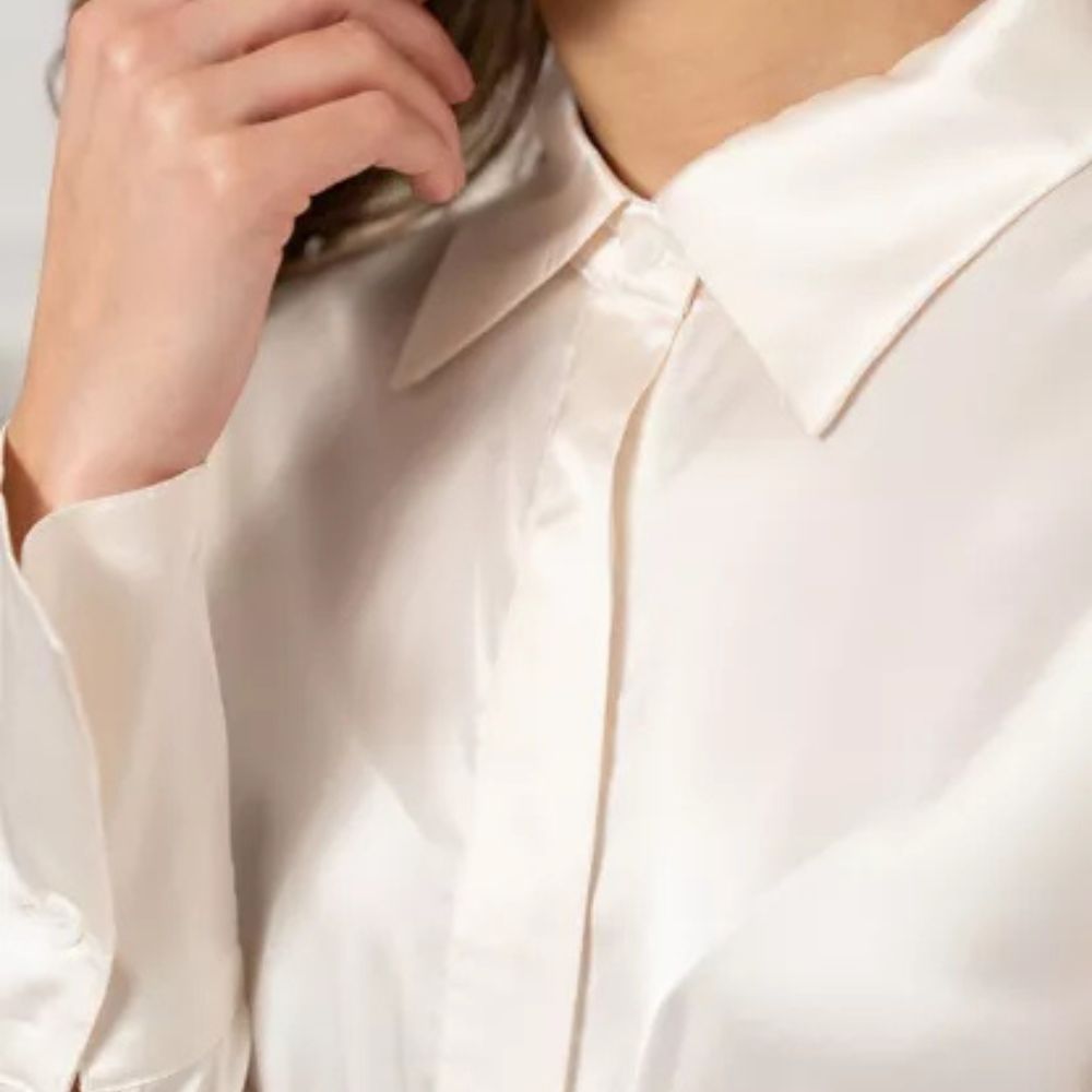 Valkoinen satiinikauluspaita on monikäyttöinen valinta arkeen ja juhlaan. Himmeästi hohtava satiinipinta tuo asuun viimeistellyn ilmeen, mutta malli on silti helppo yhdistää erilaisiin alaosiin.