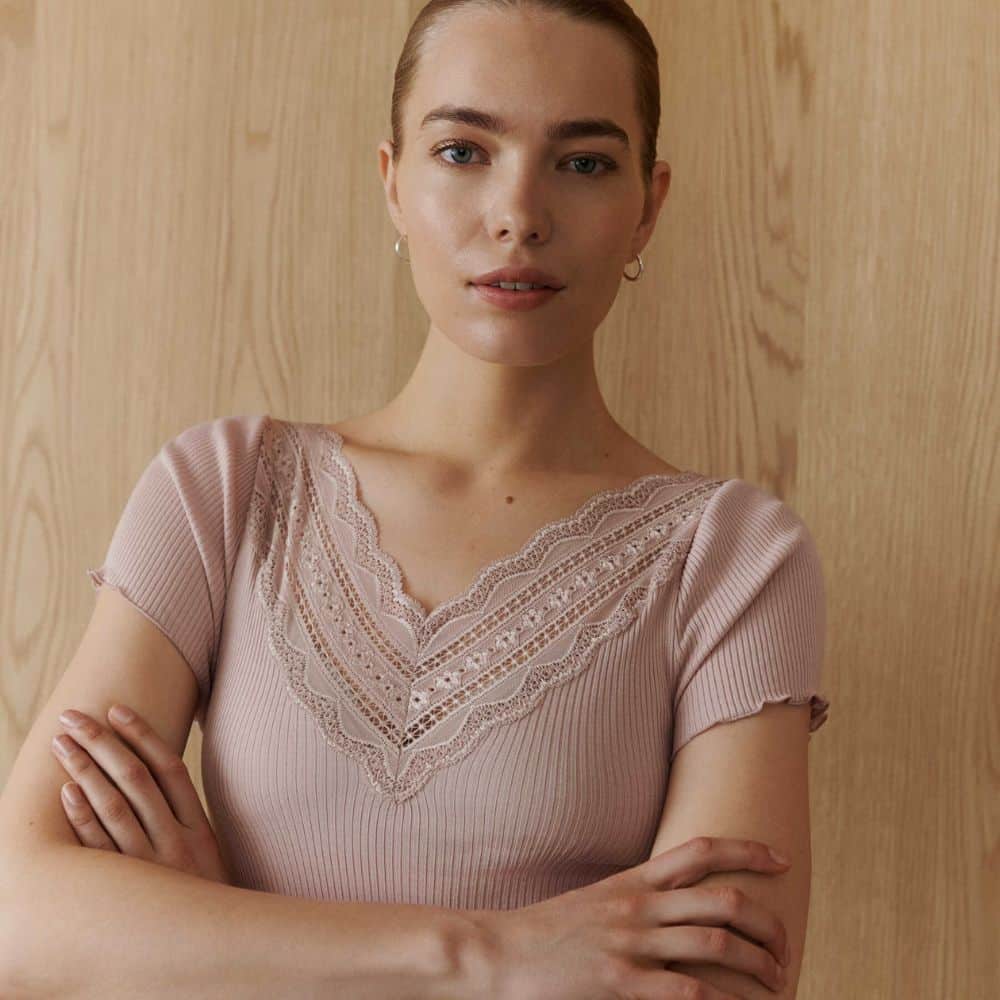 Rosemunde – ylellisen pehmeä silkkitoppi, jossa upea pitsinen V-pääntie ja pienet hihat. Miellyttävän pehmeä materiaali tuntuu ihanalta ihoa vasten ja istuu kauniisti.