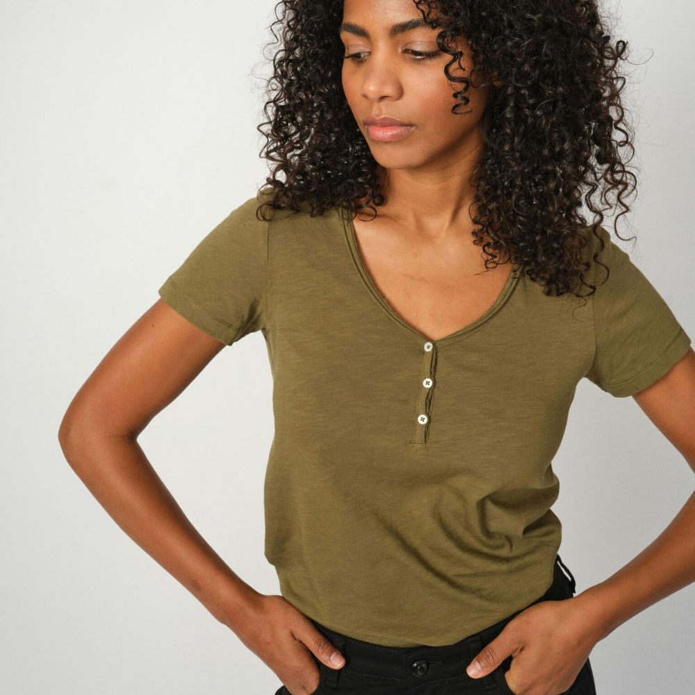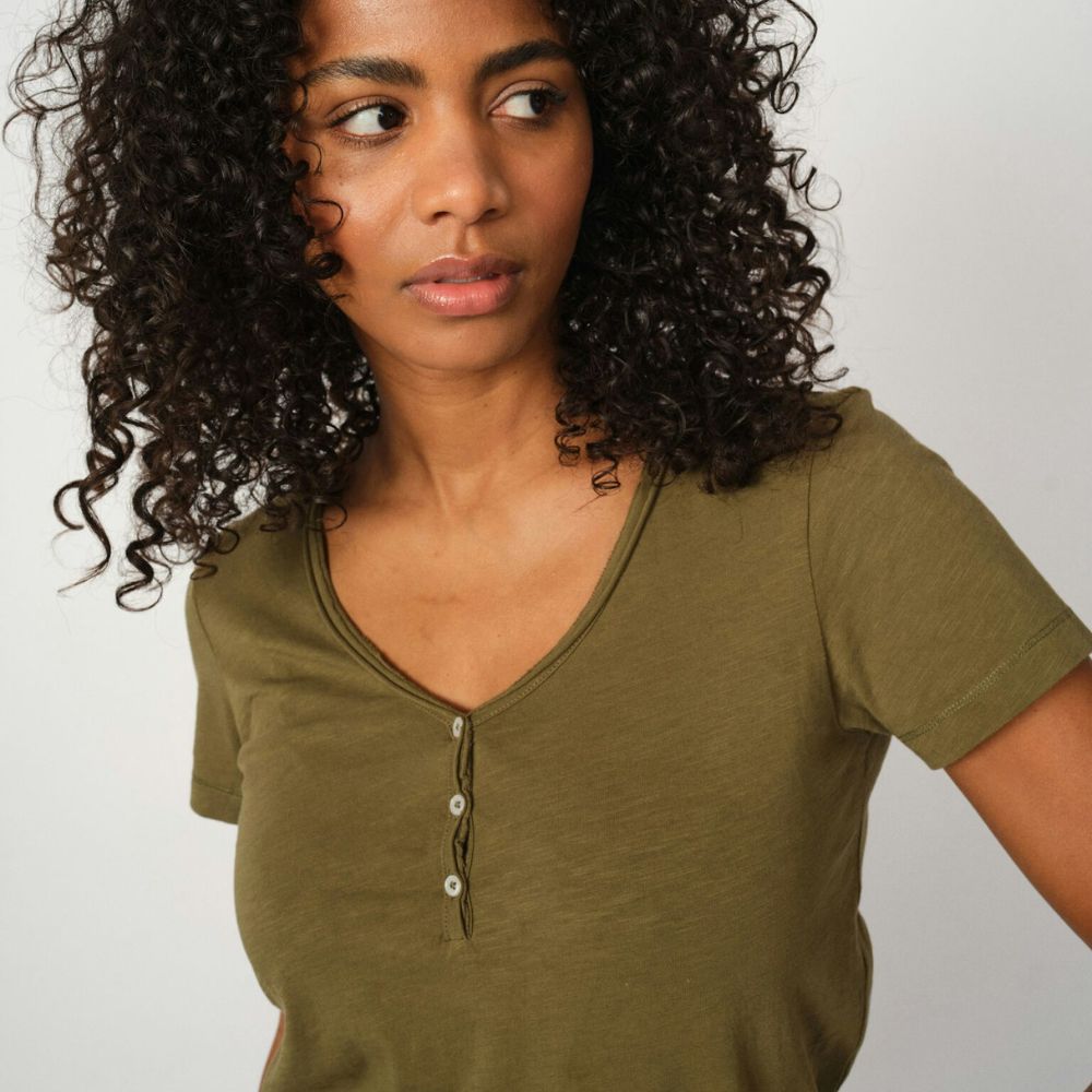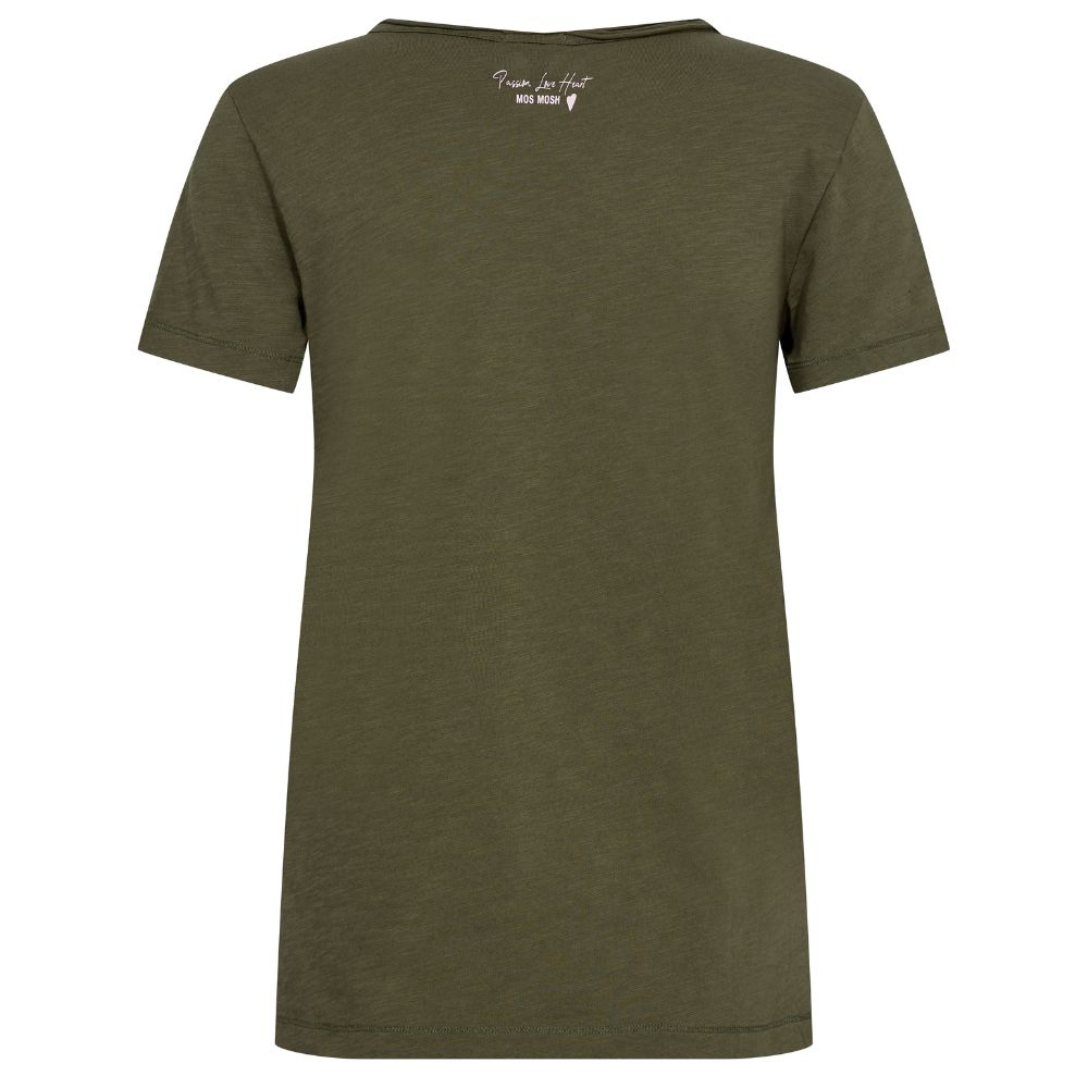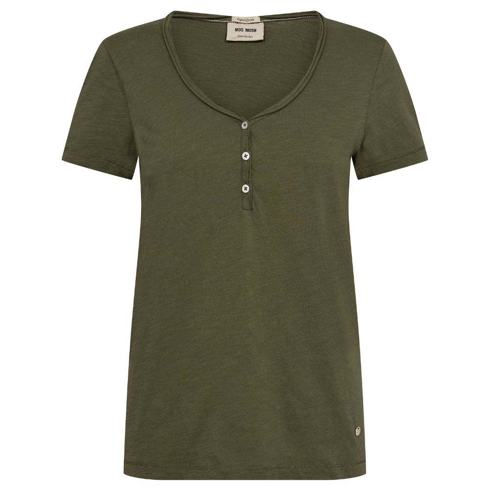 Leveä V-pääntie ja puolikas nappilista luovat paidalle huolettoman ja modernin ilmeen. Raakareunainen viimeistely lisää rentoutta ja kevyttä särmää. Pieni Mos Mosh -teksti pääntiellä viimeistelee kokonaisuuden hillitysti. Vartalonmyötäinen leikkaus istuu kauniisti ja tuntuu mukavalta päällä. Oliivinvihreä sävy on helppo yhdistää farkkuihin, shortseihin tai vaaleisiin housuihin. Tämä t-paita toimii luontevasti monenlaisiin arkisiin tilanteisiin.