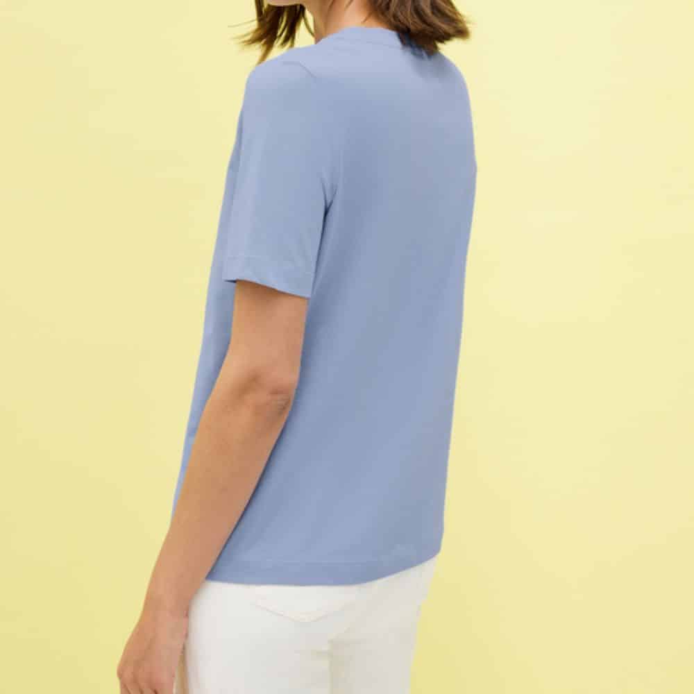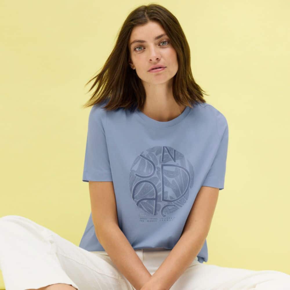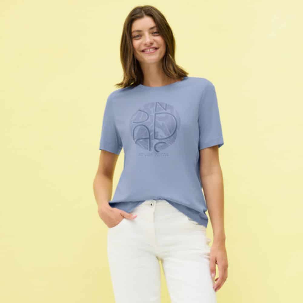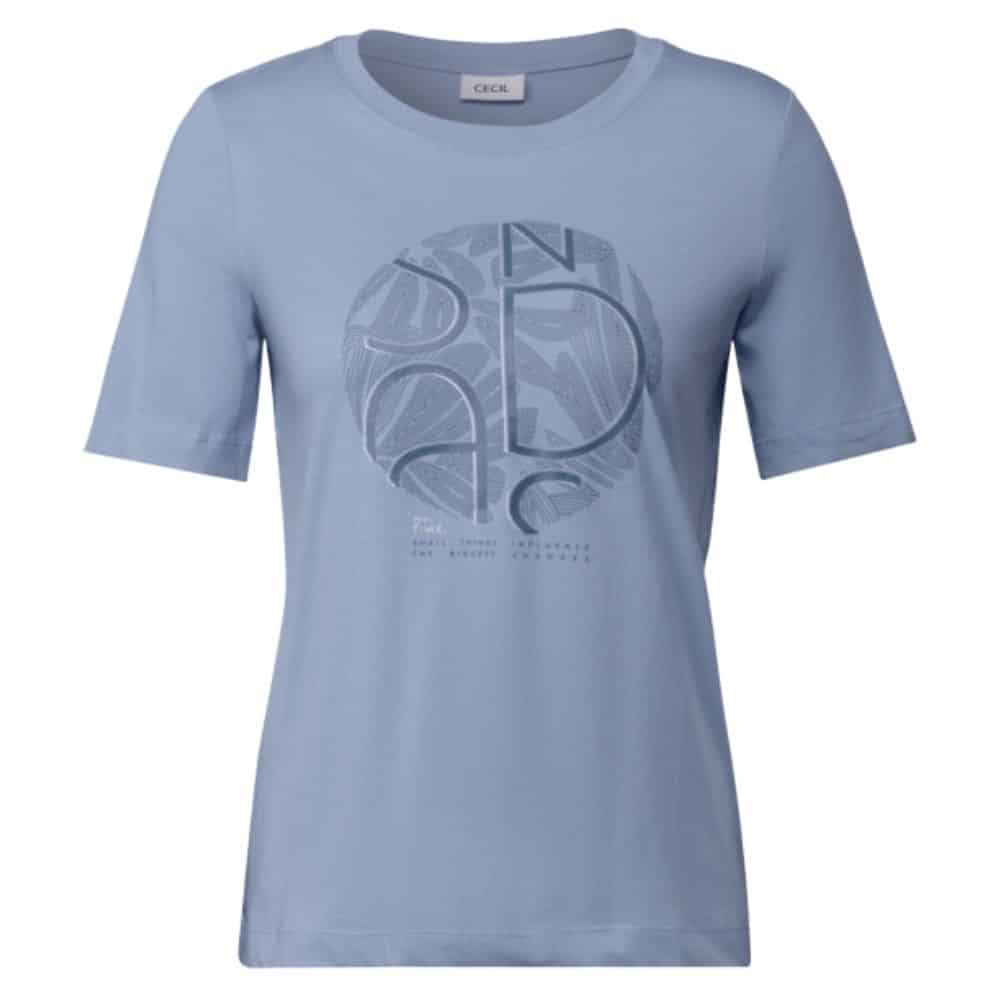 Vaaleansininen t-paita, jossa edessä hillitty pyöreä printti. Pehmeä puuvillainen t-paita on mitä monikäyttöisin lisä vaatekaappiisi!