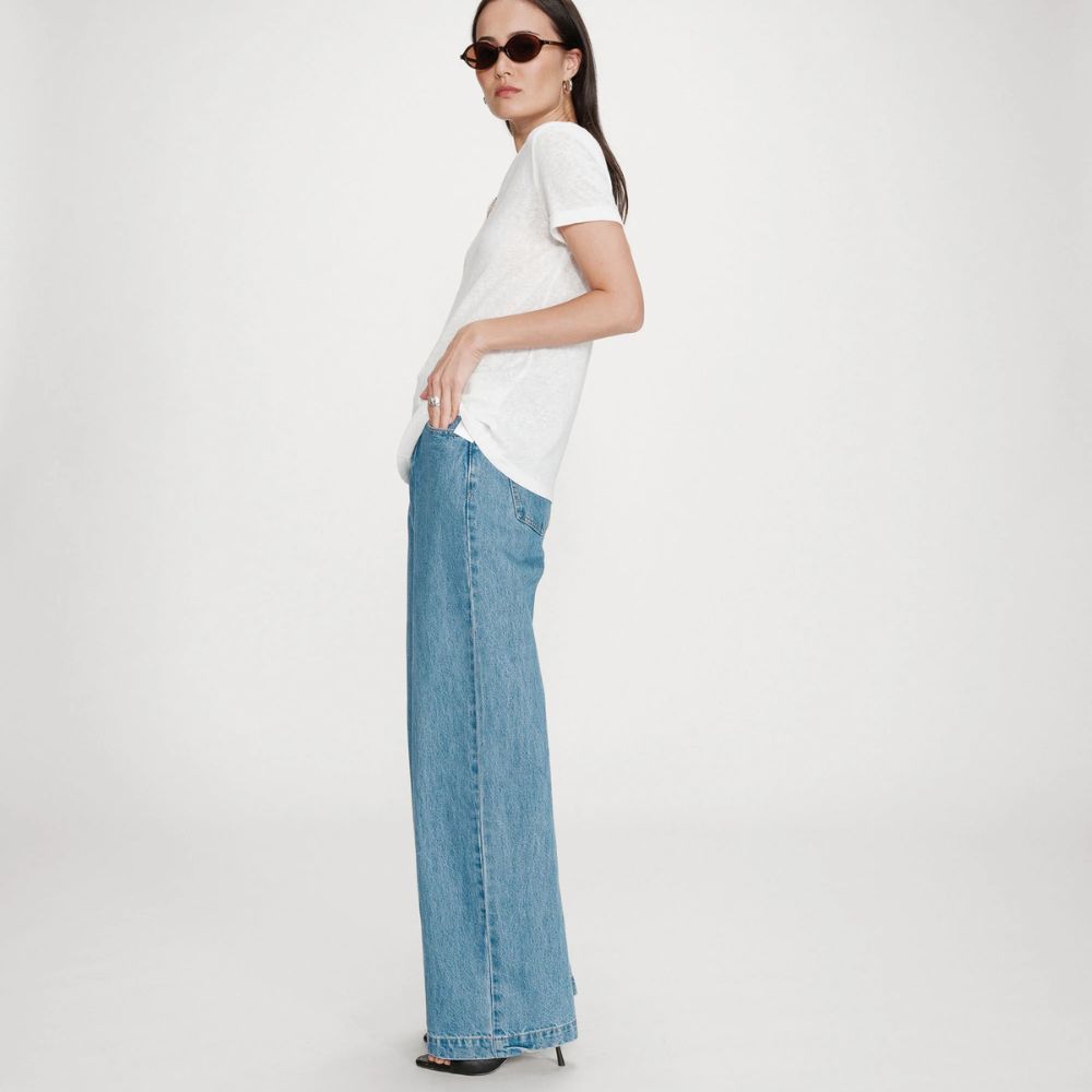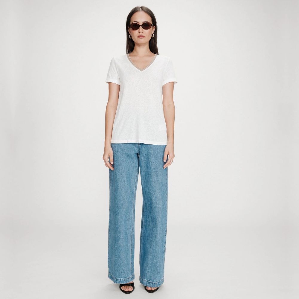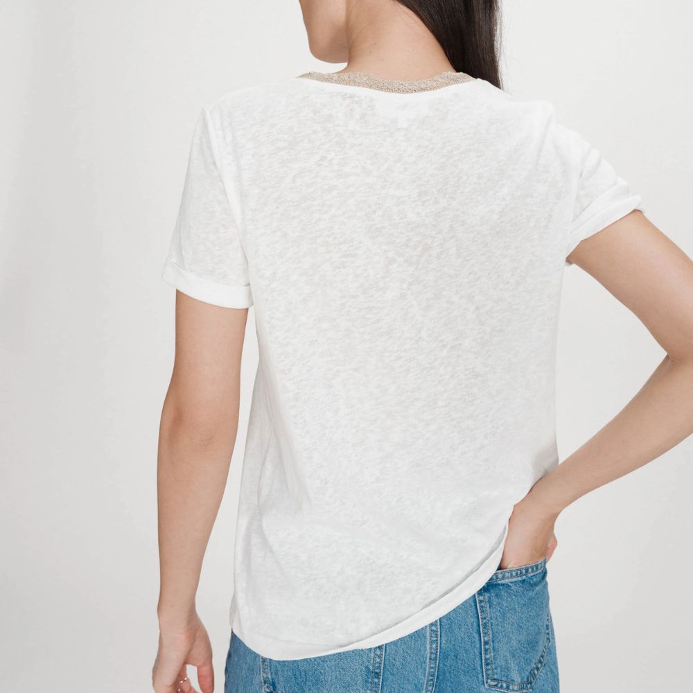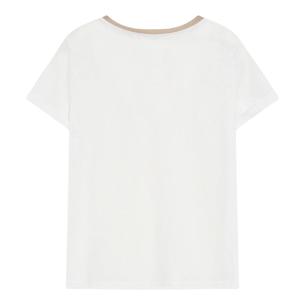 Valkoinen T-paita on vaatekaapin luottovaate, joka toimii monissa asuissa. Simppelissä, mutta tyylikkäässä paidassa klassinen malli saa pienen säihkeen lurex-yksityiskohdasta pääntiellä. Paita on helppo yhdistää arjen rennompaan pukeutumiseen.