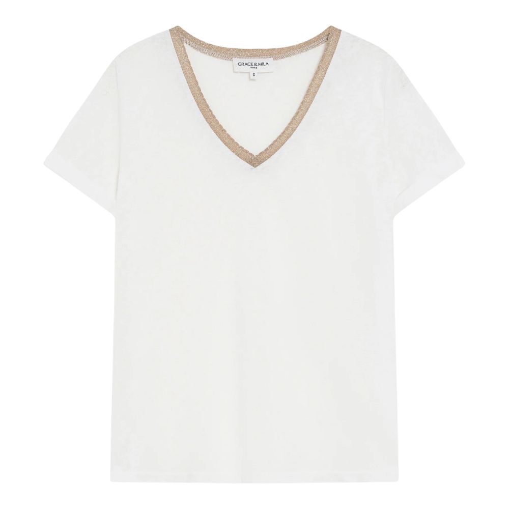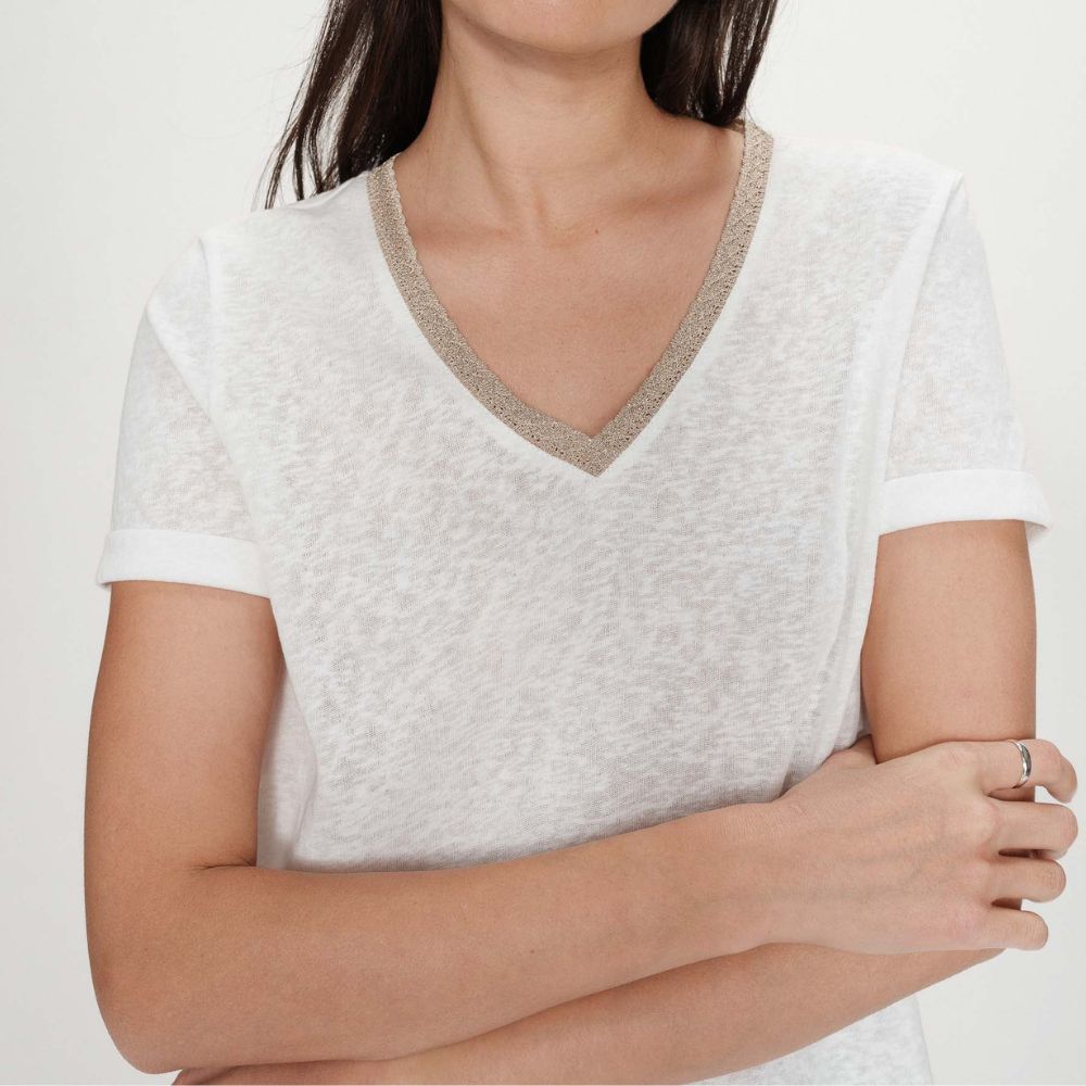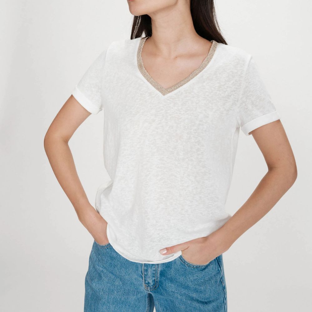 Paita on suoralinjainen ja helposti yhdisteltävä. V-pääntie antaa yläosalle kevyen ilmeen ja tekee mallista monikäyttöisen. Valkoinen väri toimii hyvin monien alaosien kanssa. Pääntiellä oleva lurex-yksityiskohta tuo paitaan hienovaraisen kimalluksen. Se antaa muuten pelkistetylle paidalle pienen näyttävän yksityiskohdan. Yksityiskohta tekee paidasta sopivan myös hieman siistimpään pukeutumiseen. Lyhyet hihat ja kevyt materiaali tekevät paidasta miellyttävän käyttää. Se sopii hyvin farkkujen, housujen tai hameen pariksi. Yksinkertainen malli tekee paidasta monikäyttöisen osan vaatekaappia.