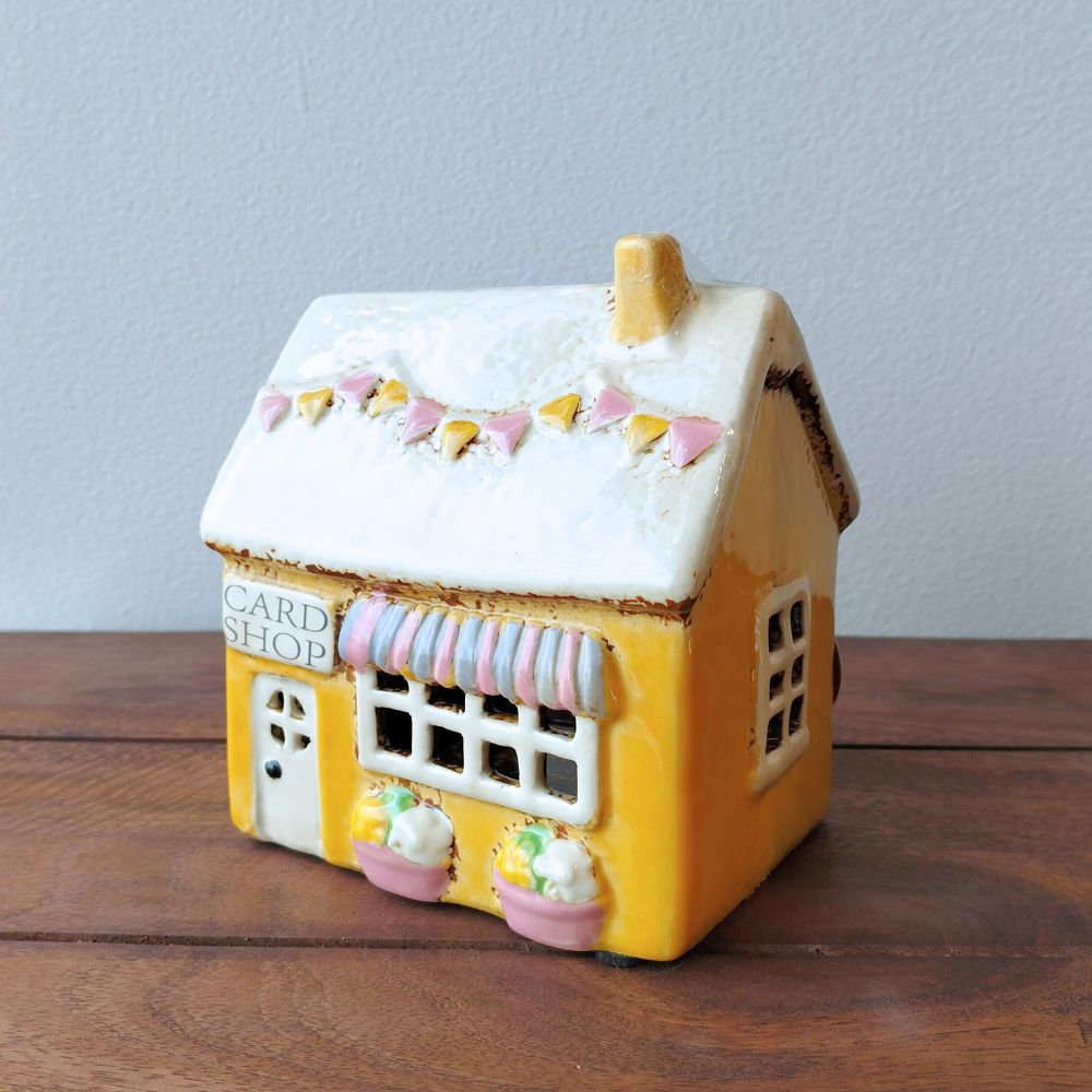 Keraaminen talolyhty on kaunis osa sisustusta sellaisenaan, mutta voit rakentaa myös oman talolyhdyistä koostuvan kylän! Keltainen korttikauppa on kaunis koriste, mutta vielä enemmän saat nautittua kodikkaasta tunnelmasta, kun sujautat taloon tuikkukynttilän tai valonauhaa.